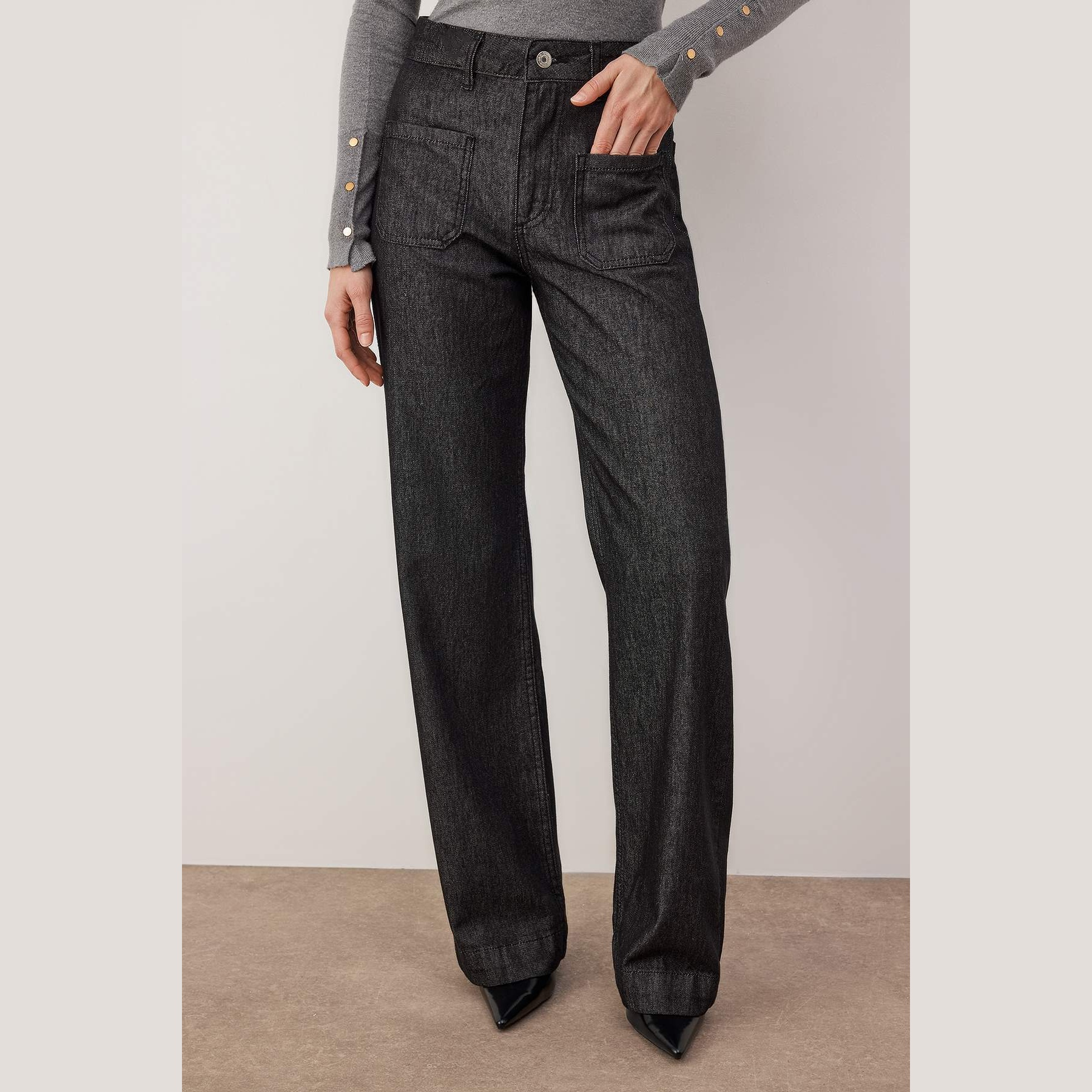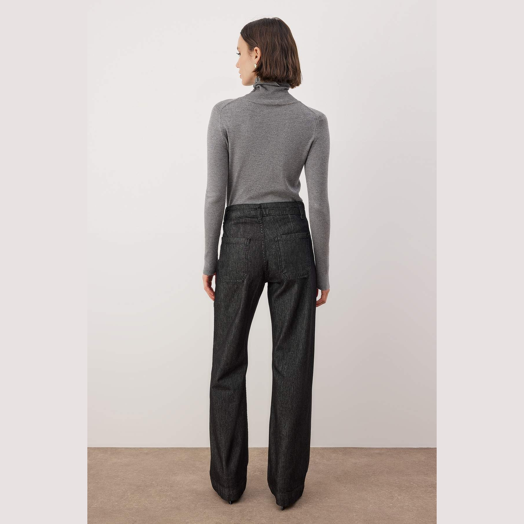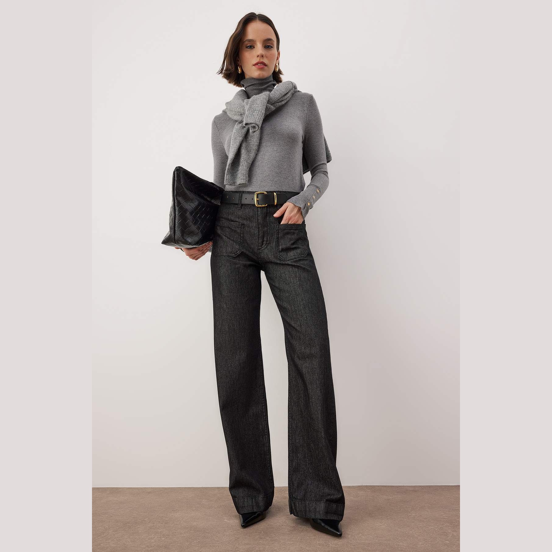 جينز نسائي – أسود بخصر مرتفع وتفاصيل جيوب وحواف خام (Raw Wide Leg)