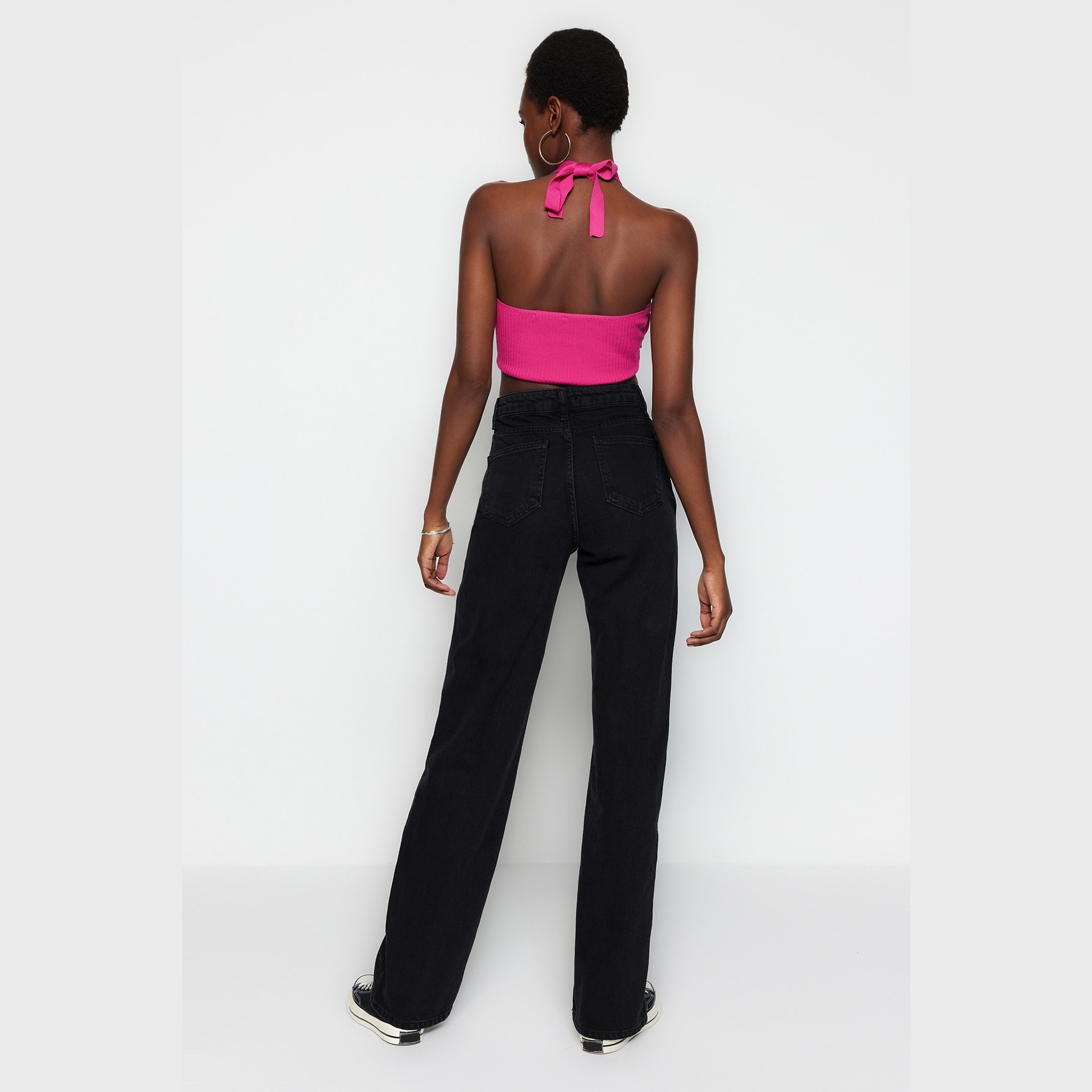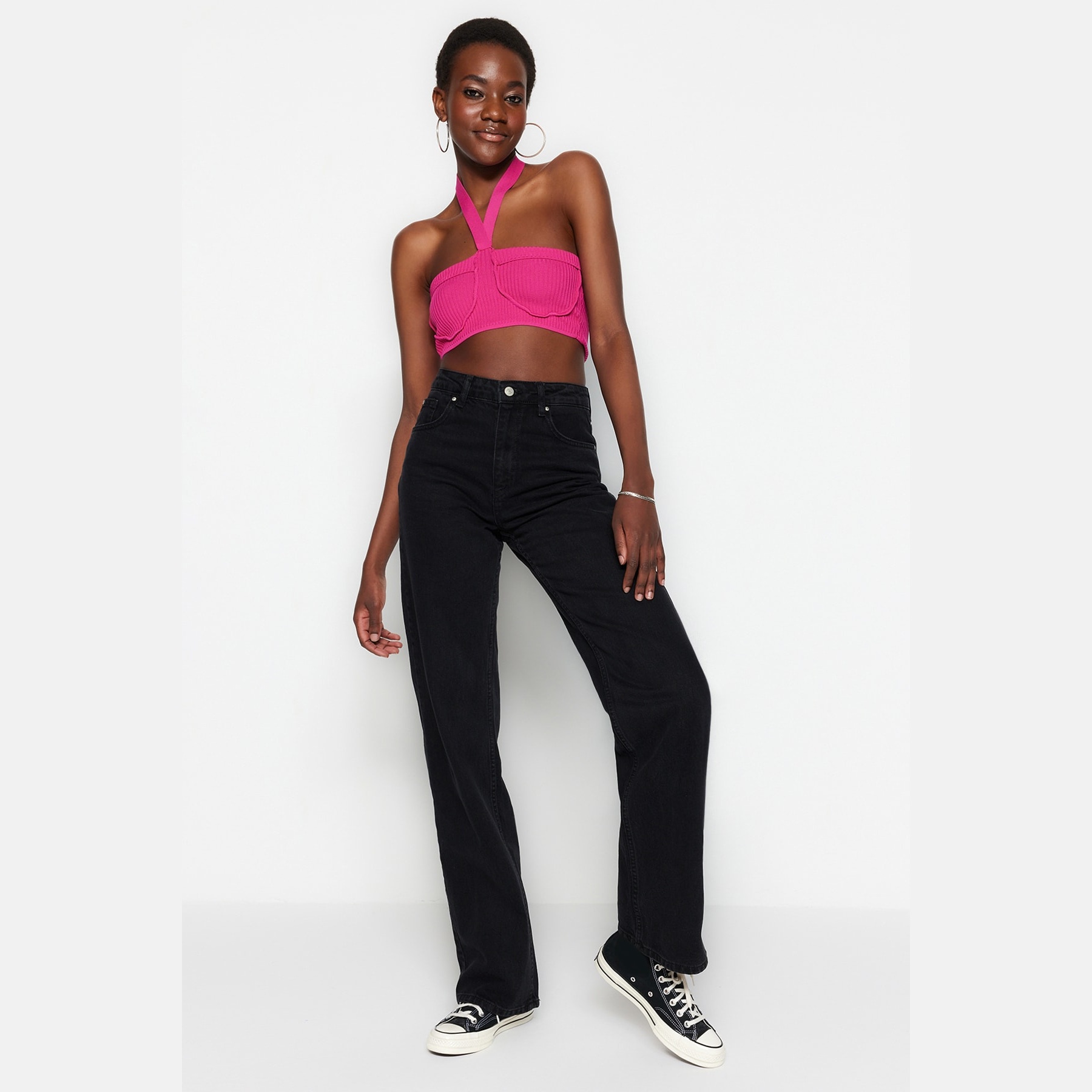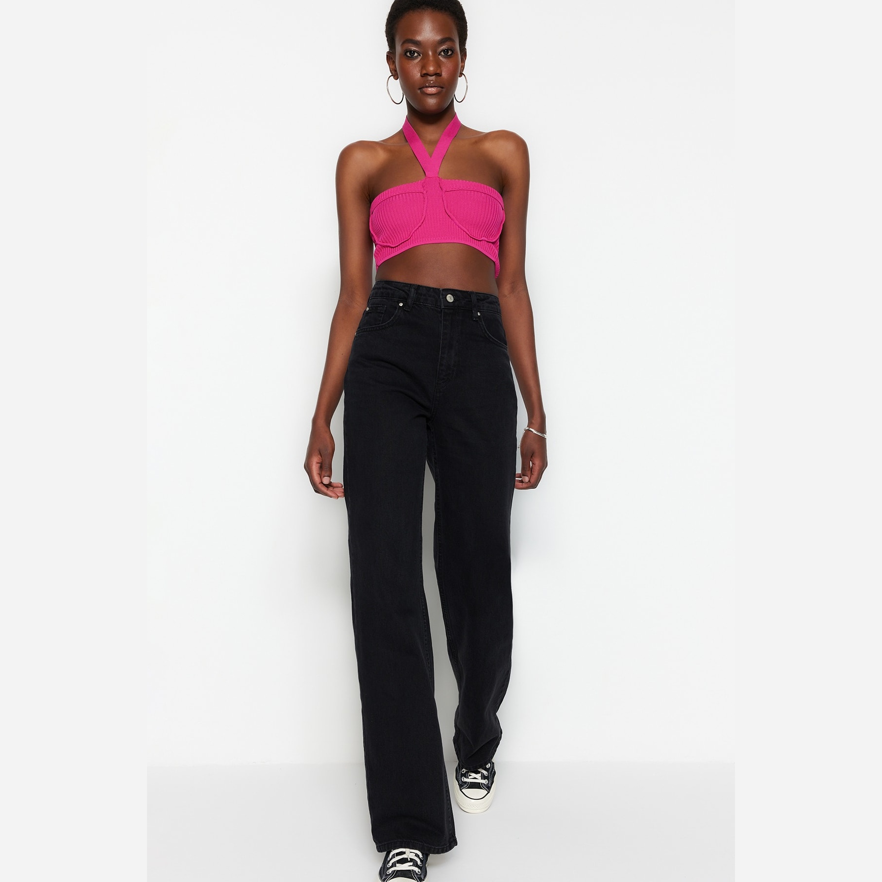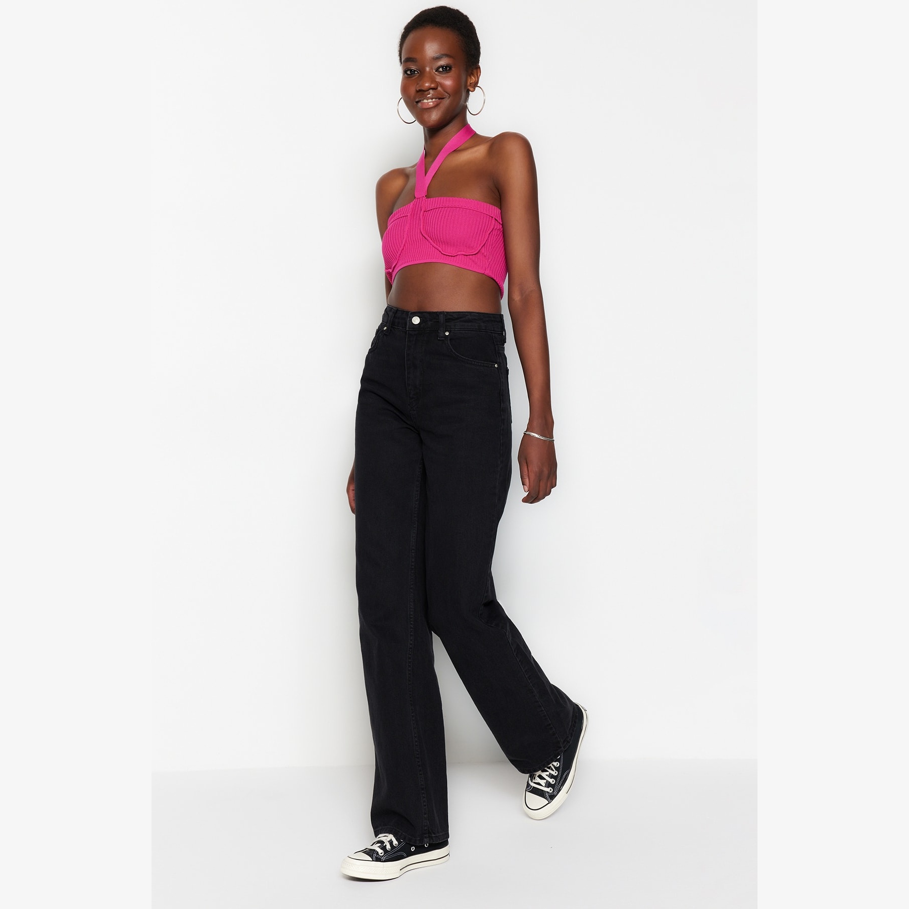 جينز نسائي – أسود بخصر مرتفع وقصة واسعة بتأثير باهت (Wide Leg Smoke)