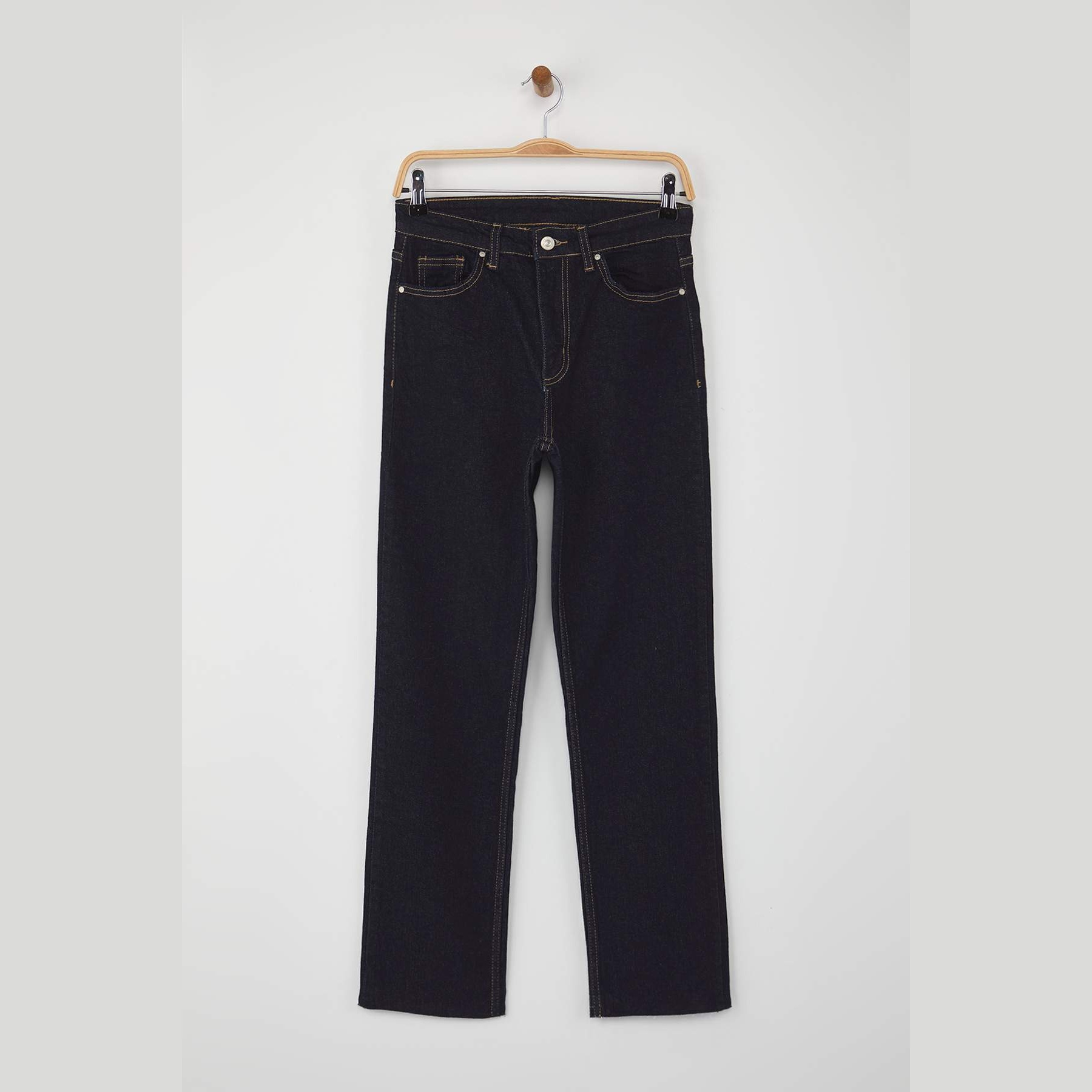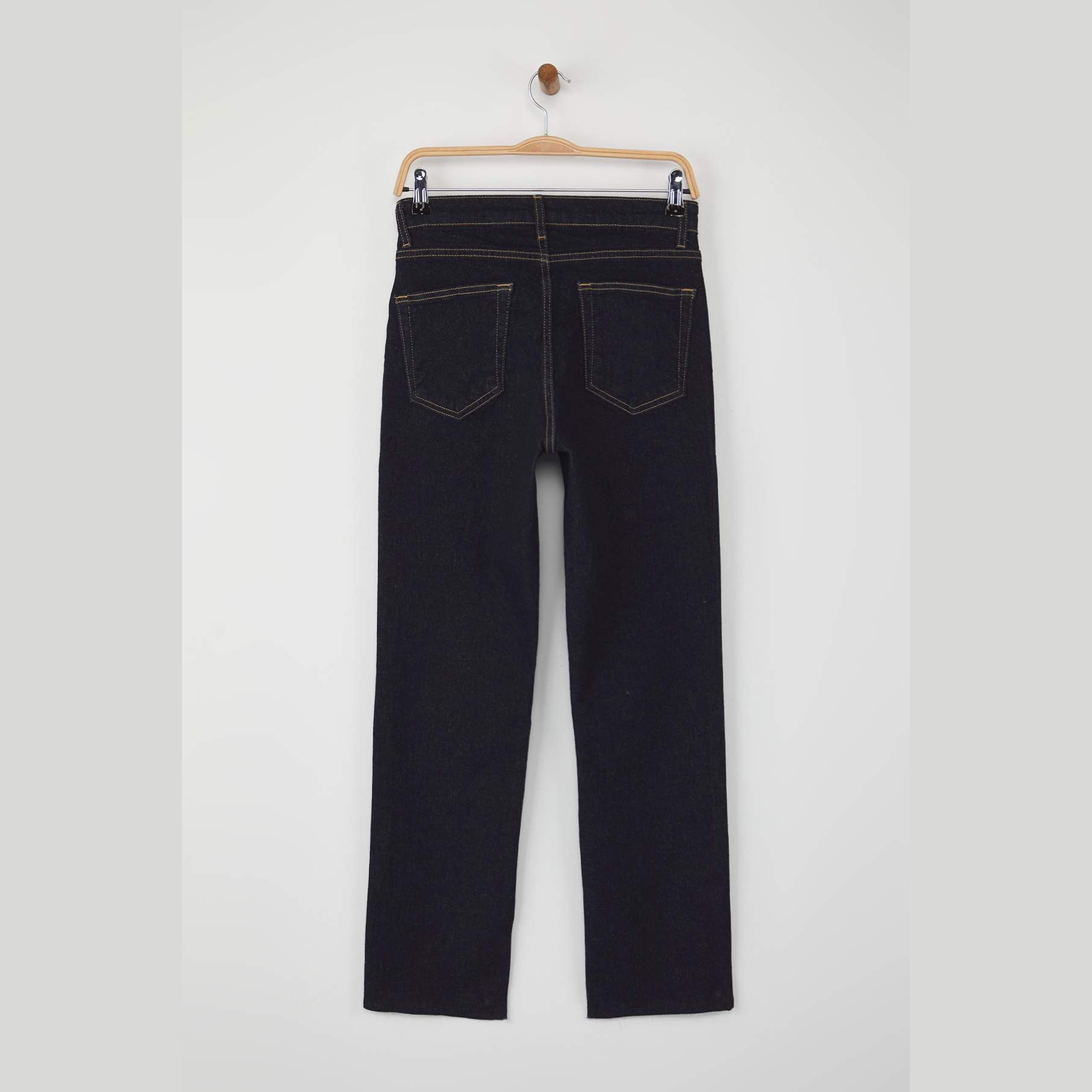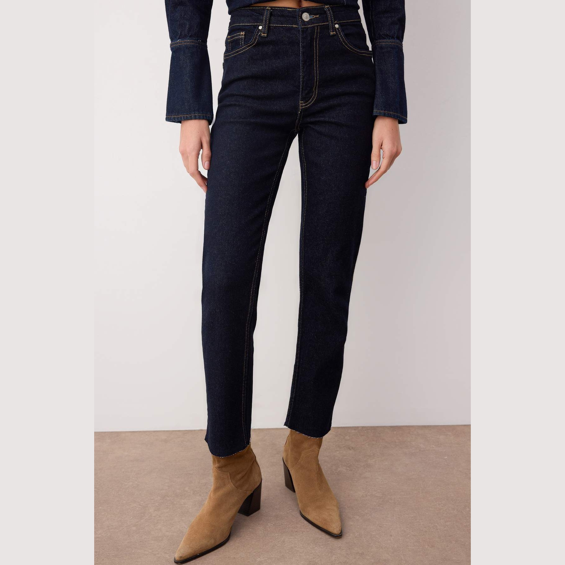 بنطال جينز نسائي بلون كُحلي داكن، مصنوع من قماش دنيم مرن بنسبة 99% قطن و1% إيلاستان، يتميز بخصر مرتفع، قصة Mom مستقيمة ومريحة، مع إغلاق أمامي بزر وسحاب. تصميم عملي يمنحك إطلالة كاجوال أنيقة ومريحة طوال اليوم.