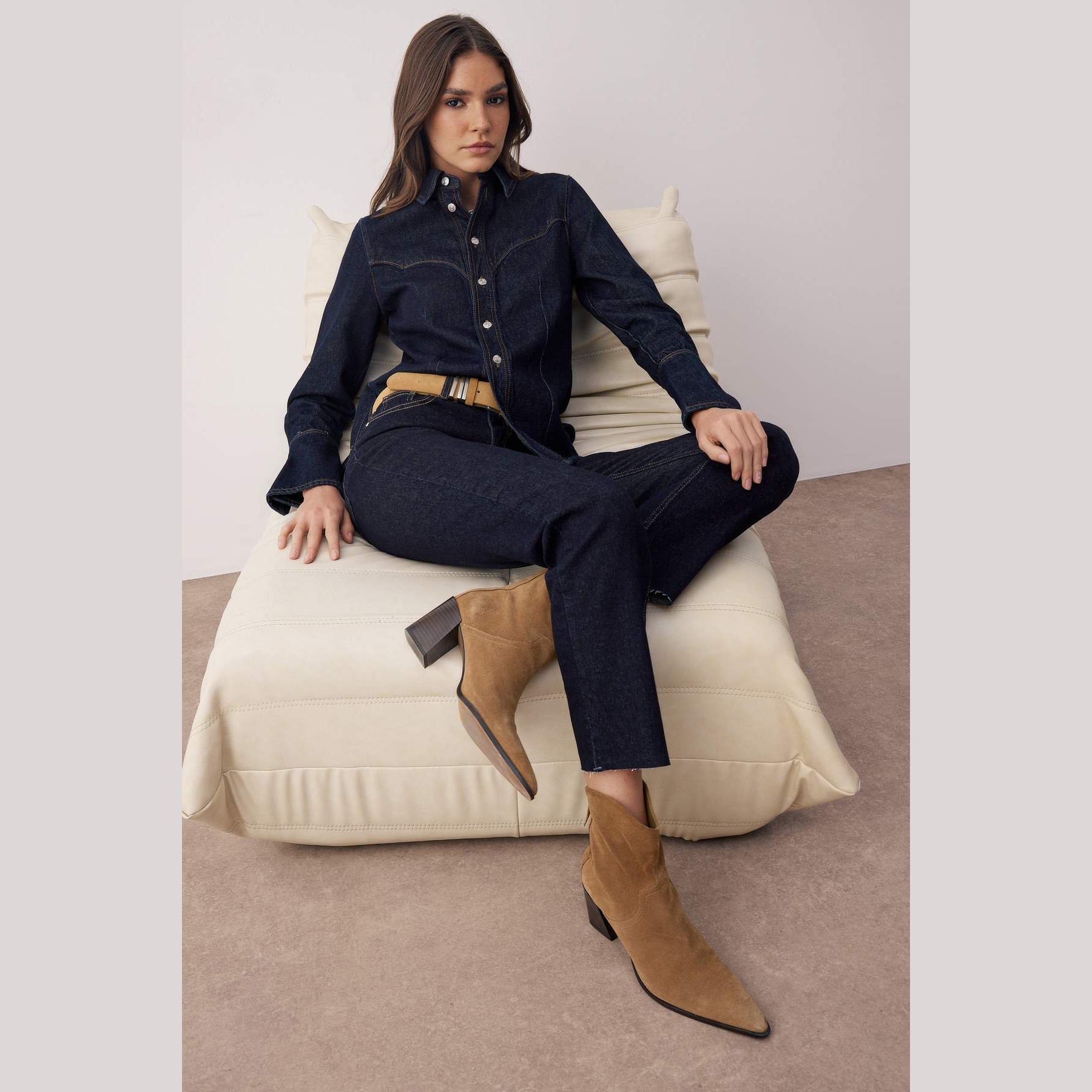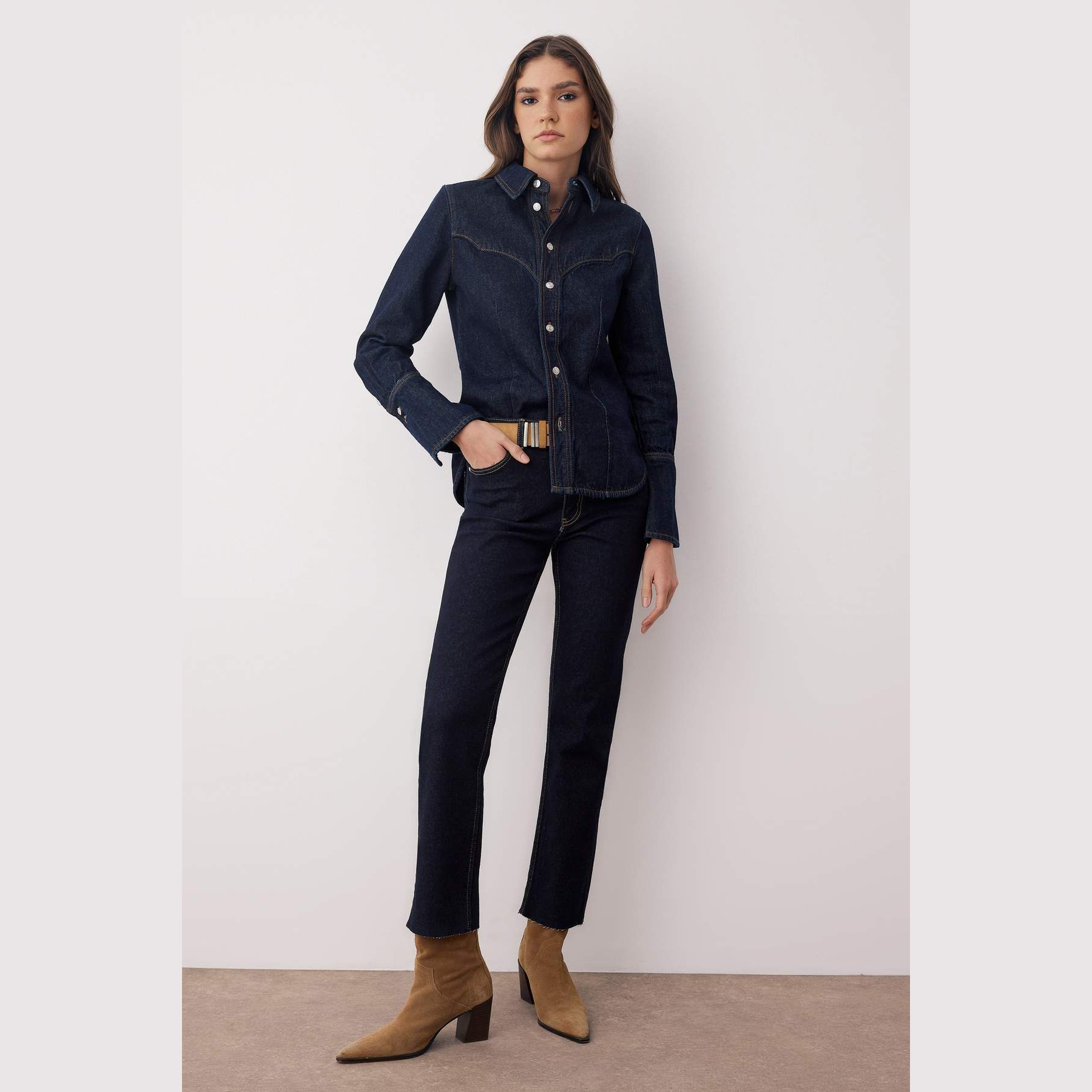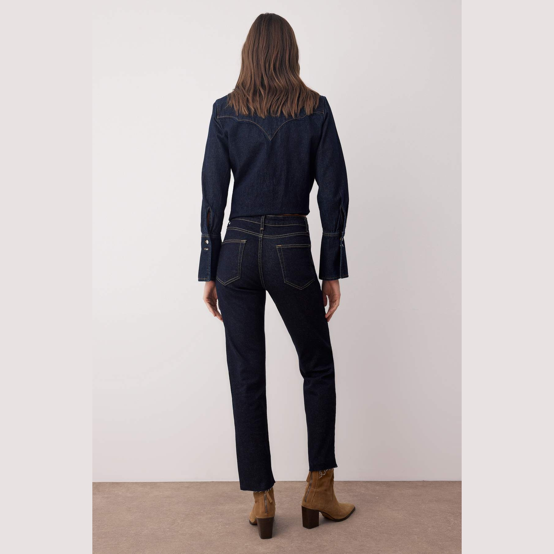بنطال جينز نسائي بلون كُحلي داكن، مصنوع من قماش دنيم مرن بنسبة 99% قطن و1% إيلاستان، يتميز بخصر مرتفع، قصة Mom مستقيمة ومريحة، مع إغلاق أمامي بزر وسحاب. تصميم عملي يمنحك إطلالة كاجوال أنيقة ومريحة طوال اليوم.