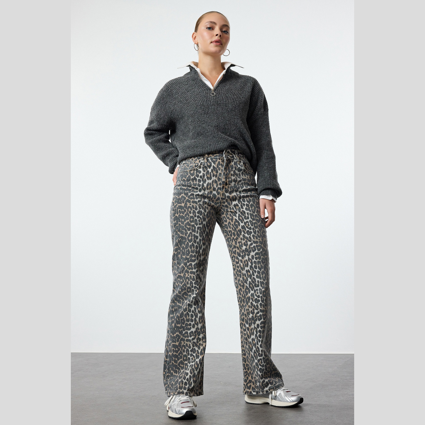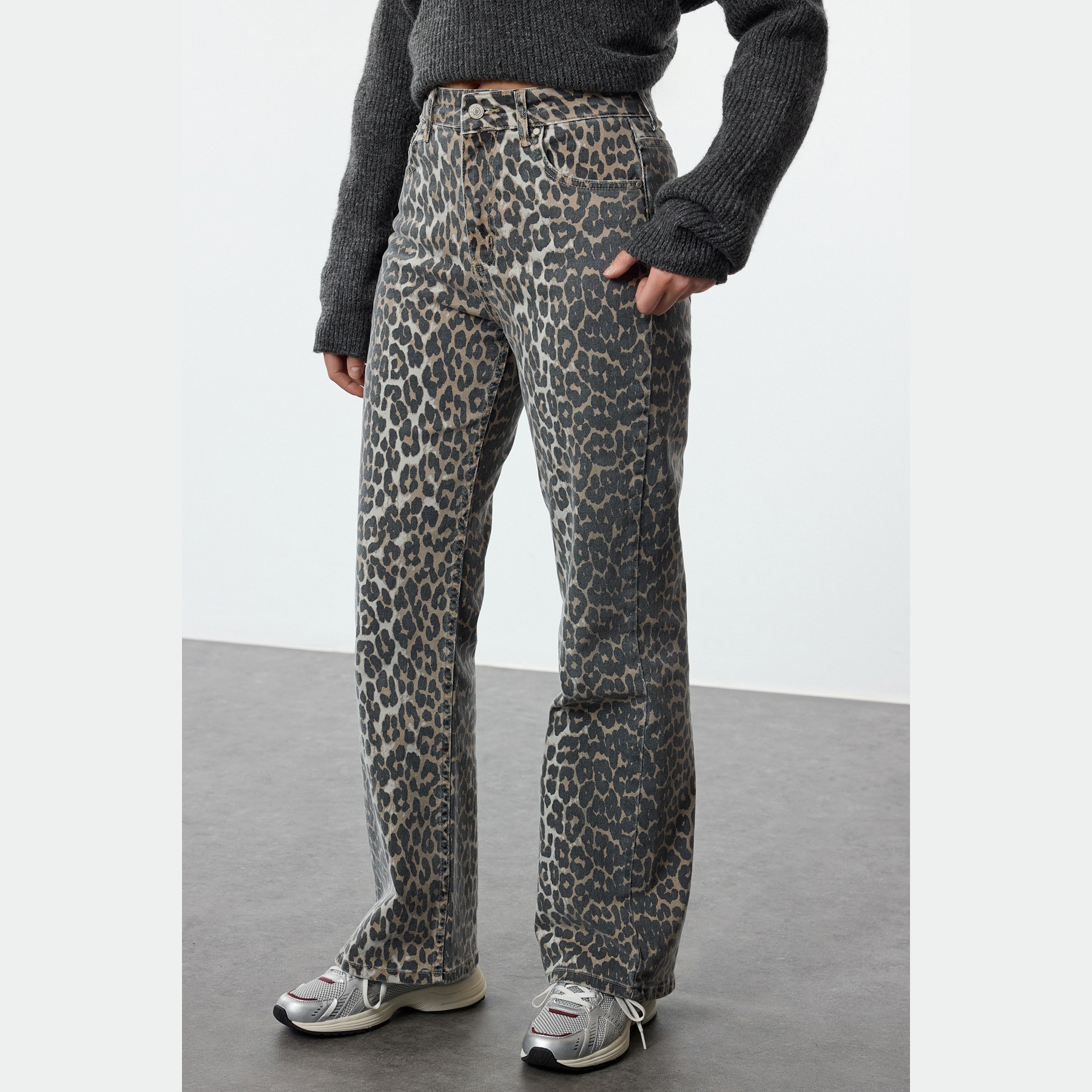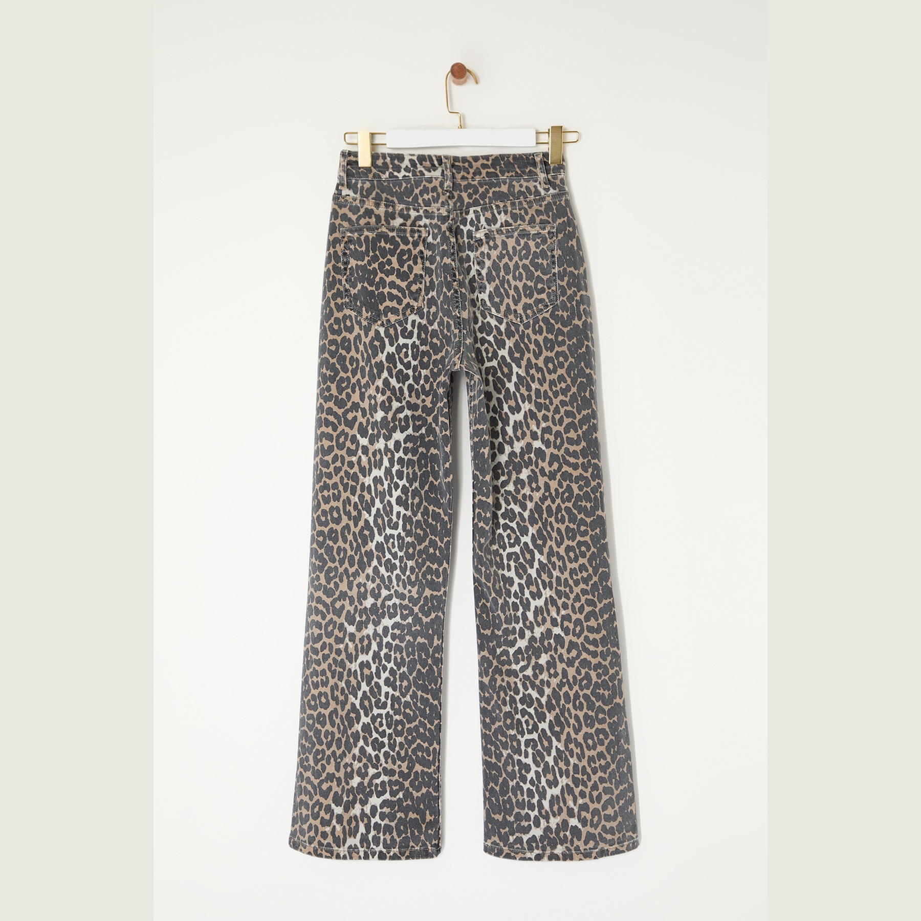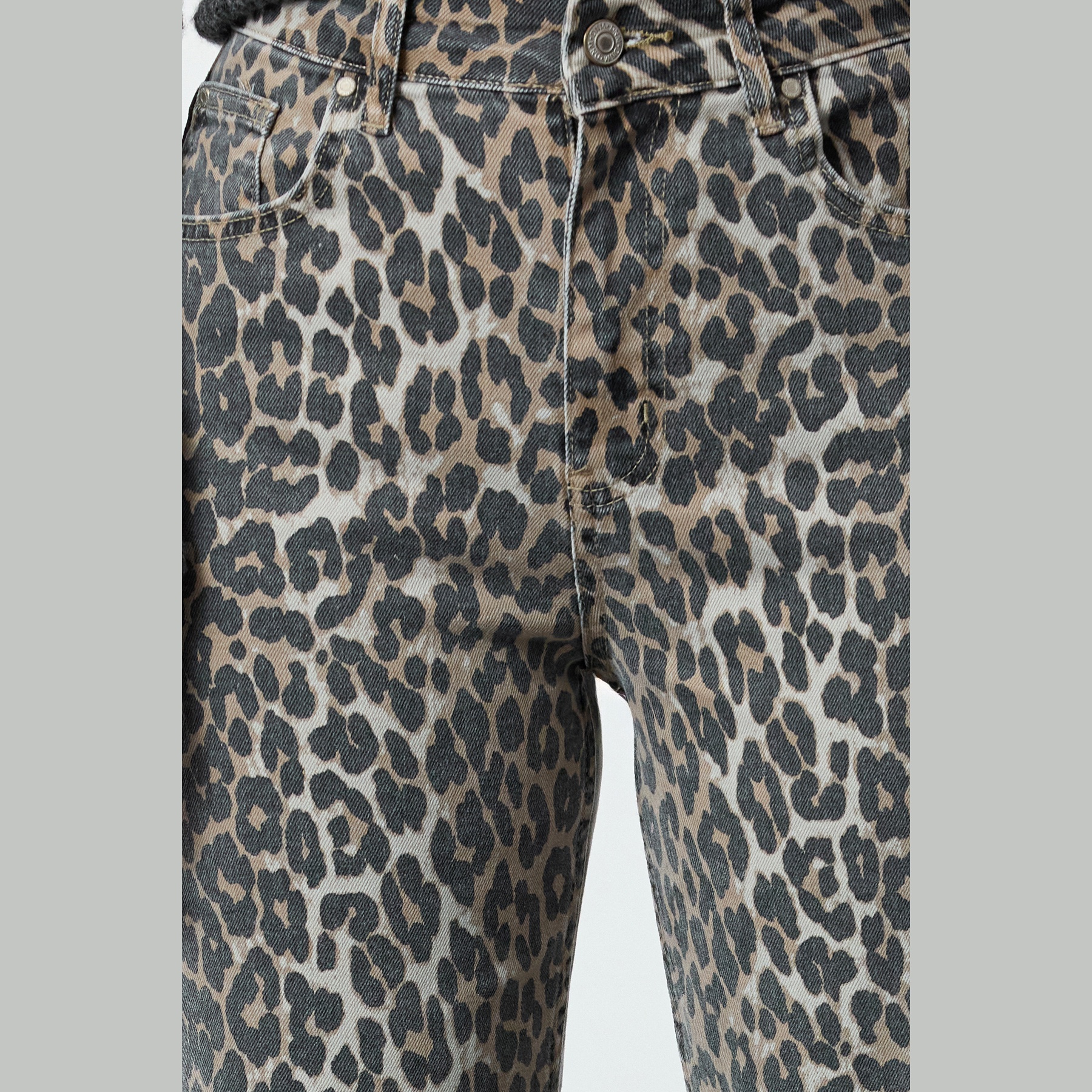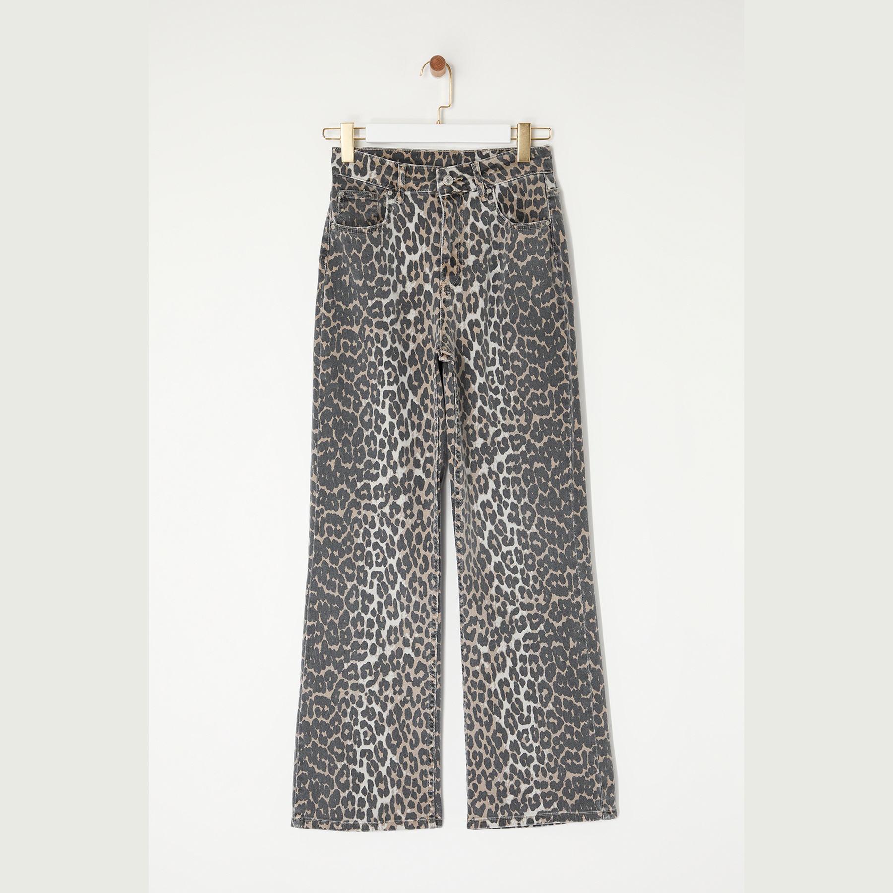 بنطال جينز نسائي بلون بني مزين بنقشة ليوبارد متعددة الألوان، مصنوع من قماش دنيم مرن بنسبة 98% قطن و2% إيلاستان، يتميز بخصر مرتفع، قصة واسعة من الأسفل، وإغلاق أمامي بزر وسحاب. تصميم عصري وجريء يمنحك إطلالة أنثوية مميزة ومريحة.