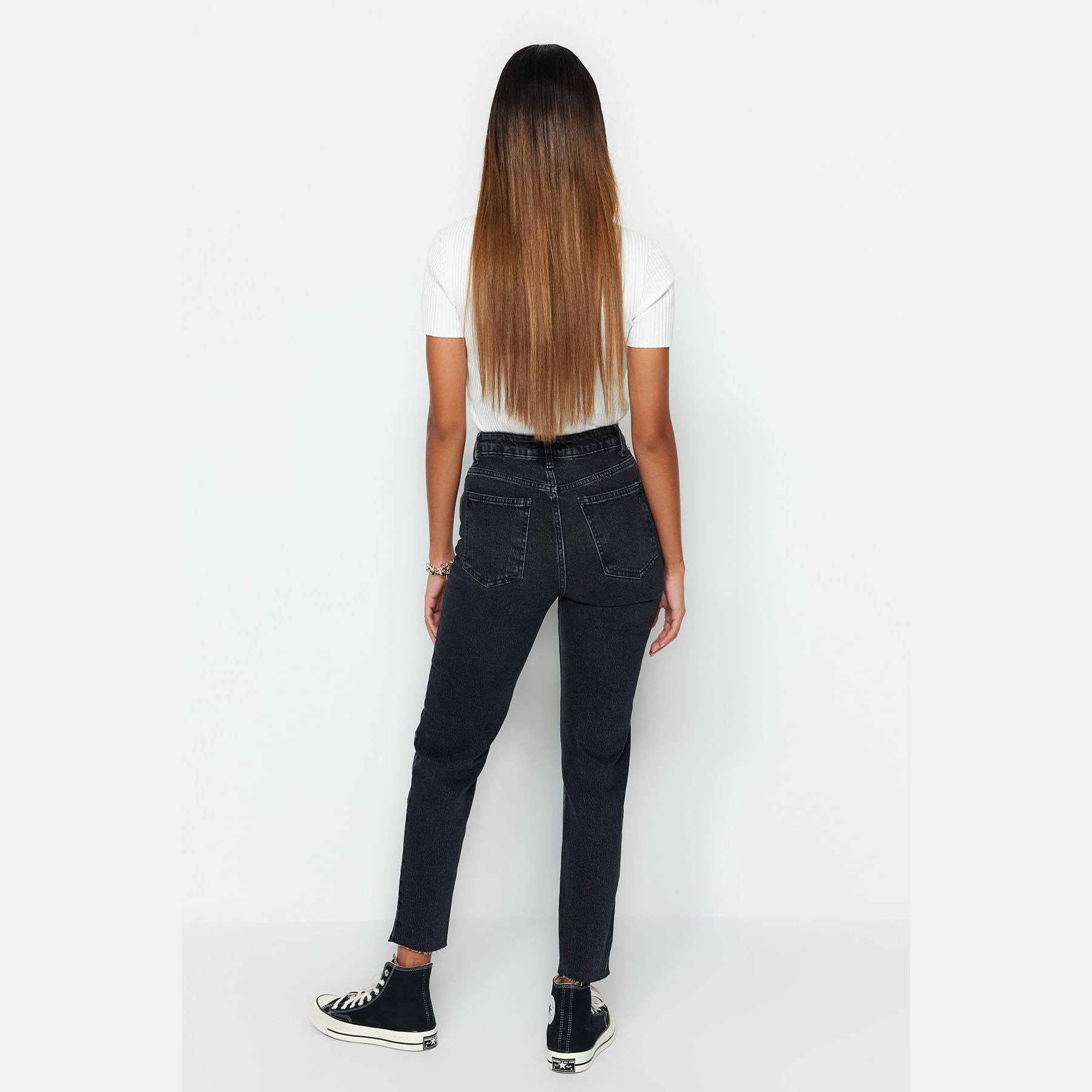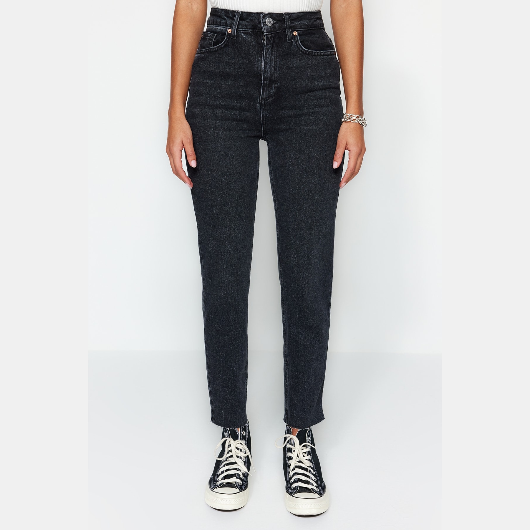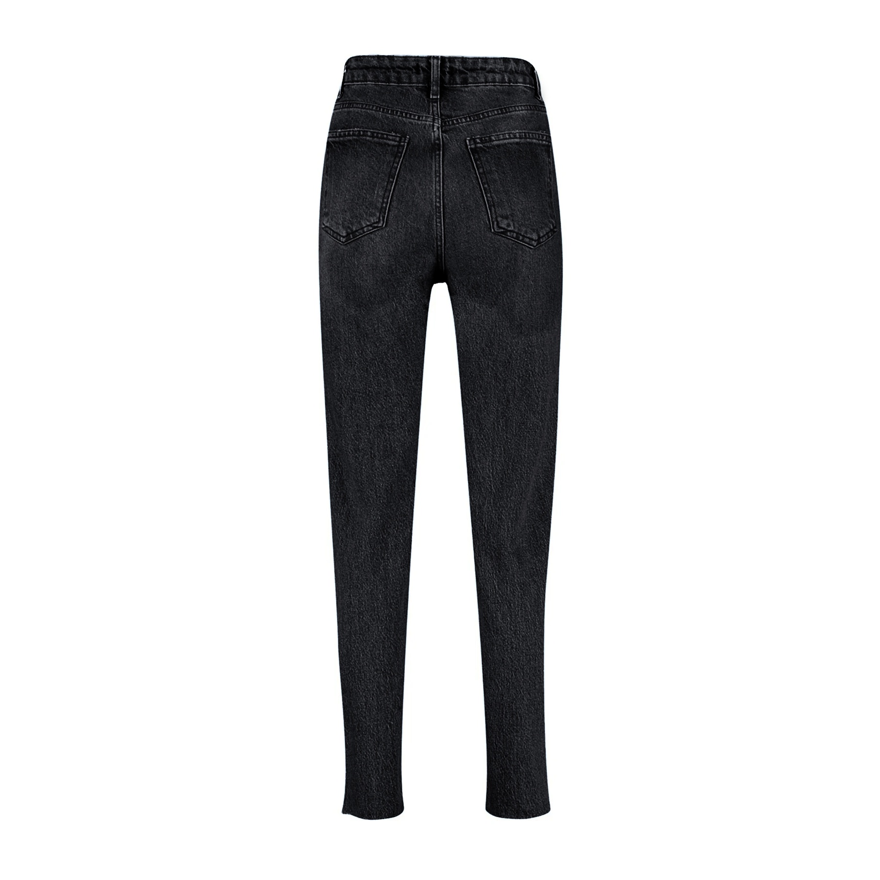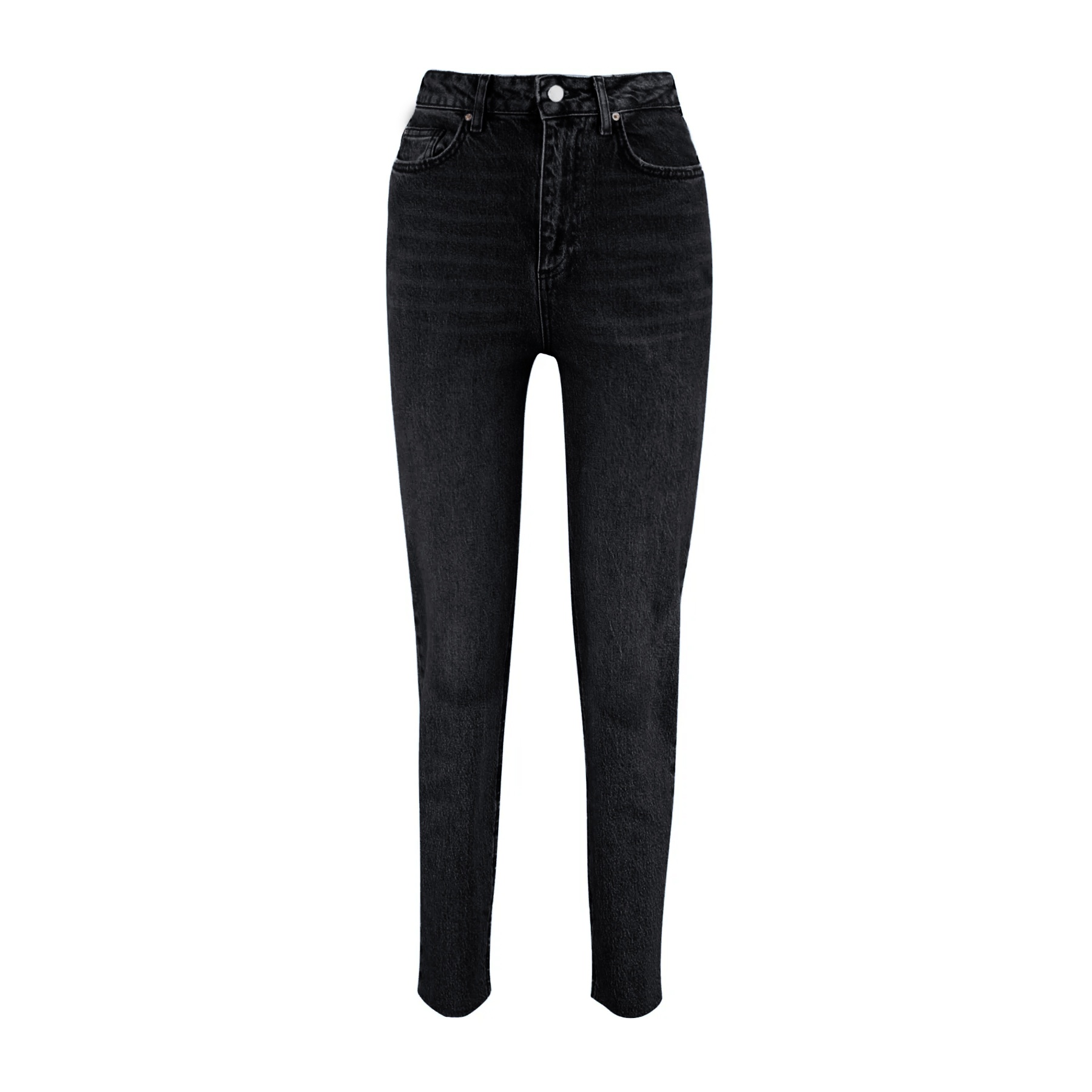 بنطال جينز نسائي بلون أسود، مصنوع من قماش دنيم مرن بنسبة 99% قطن و1% إيلاستان، يتميز بخصر مرتفع، قصة Slim Mom ضيقة ومستقيمة، مع إغلاق أمامي بزر وسحاب. تصميم عملي يمنحك إطلالة يومية أنيقة ومريحة.