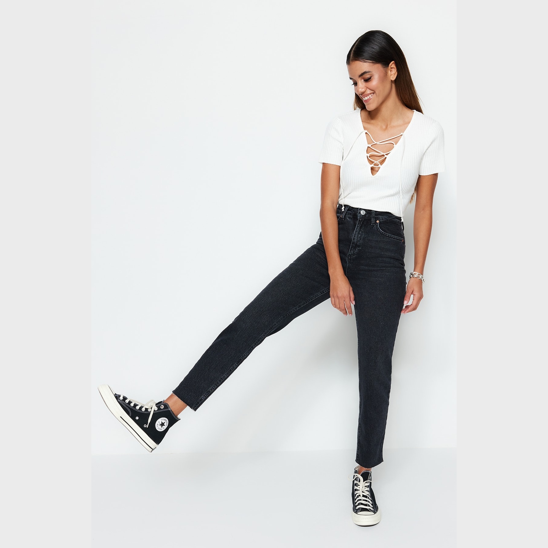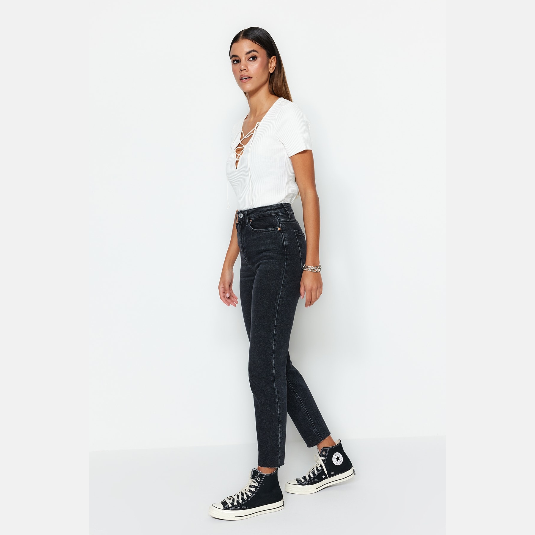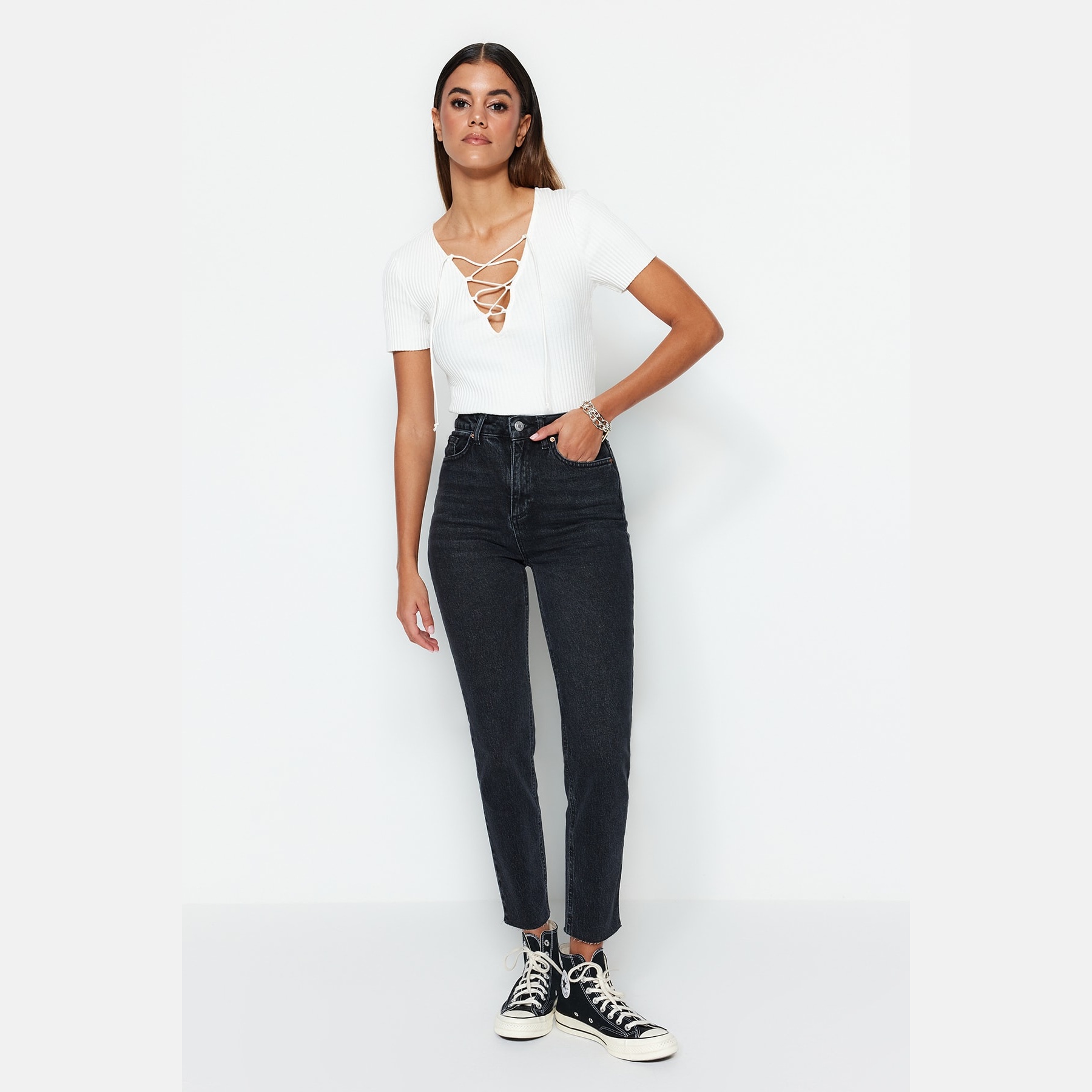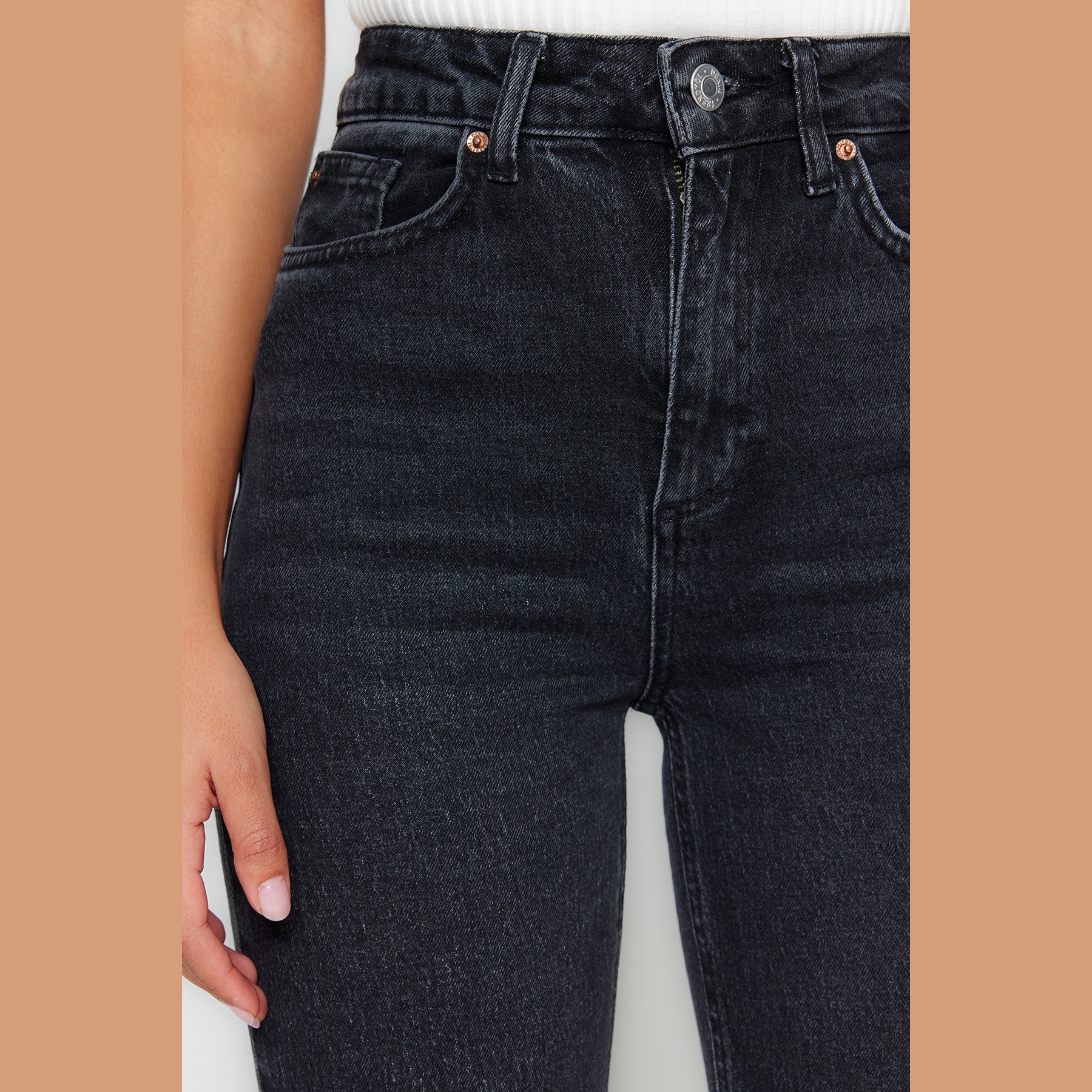 بنطال جينز نسائي بلون أسود، مصنوع من قماش دنيم مرن بنسبة 99% قطن و1% إيلاستان، يتميز بخصر مرتفع، قصة Slim Mom ضيقة ومستقيمة، مع إغلاق أمامي بزر وسحاب. تصميم عملي يمنحك إطلالة يومية أنيقة ومريحة.