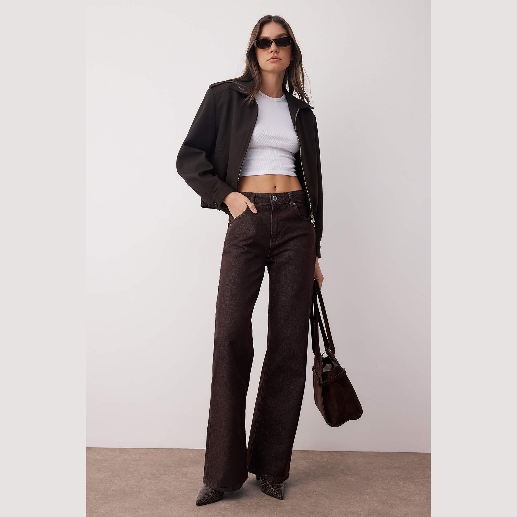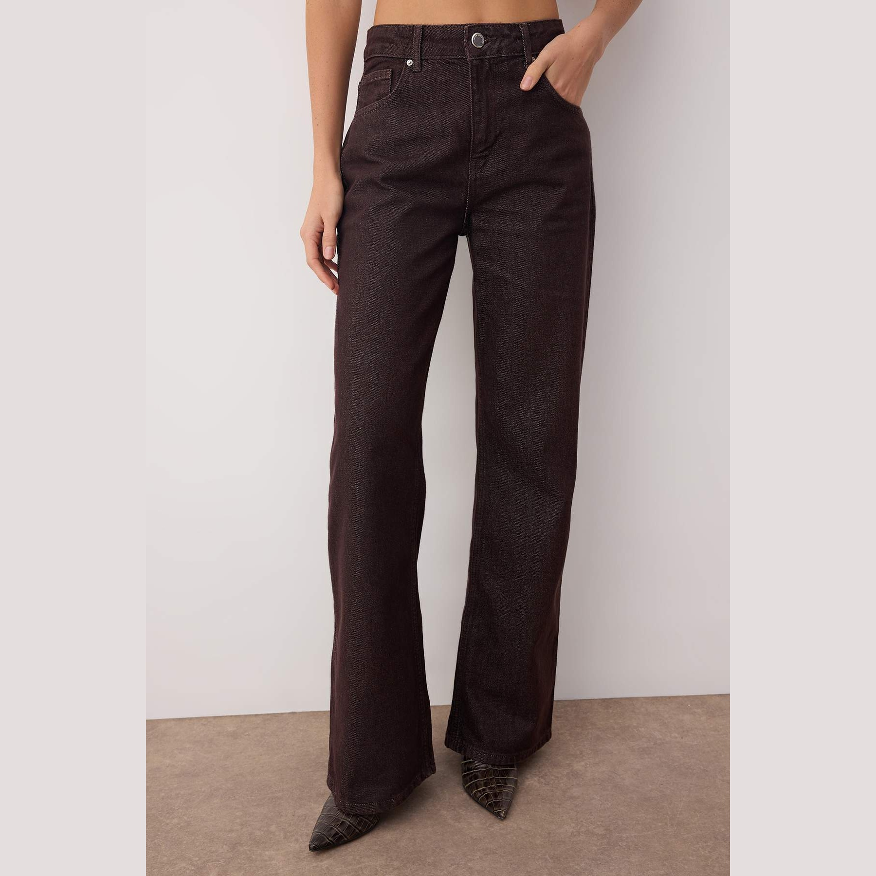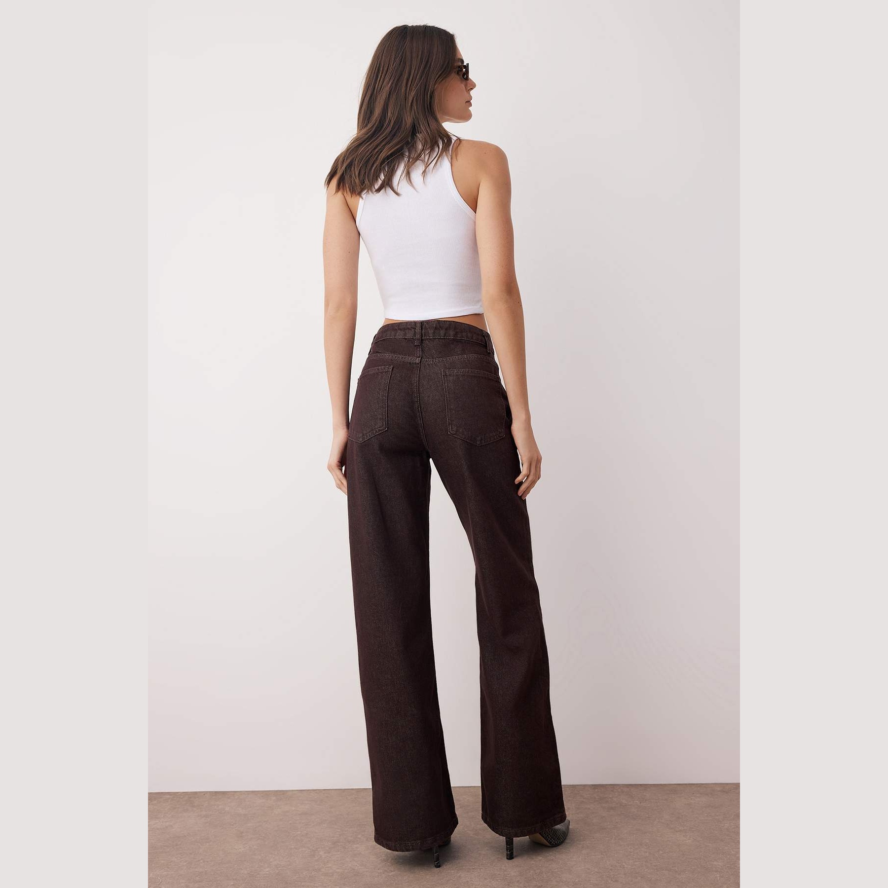جينز نسائي – بني بخصر مرتفع وقصة واسعة (Wide Leg)