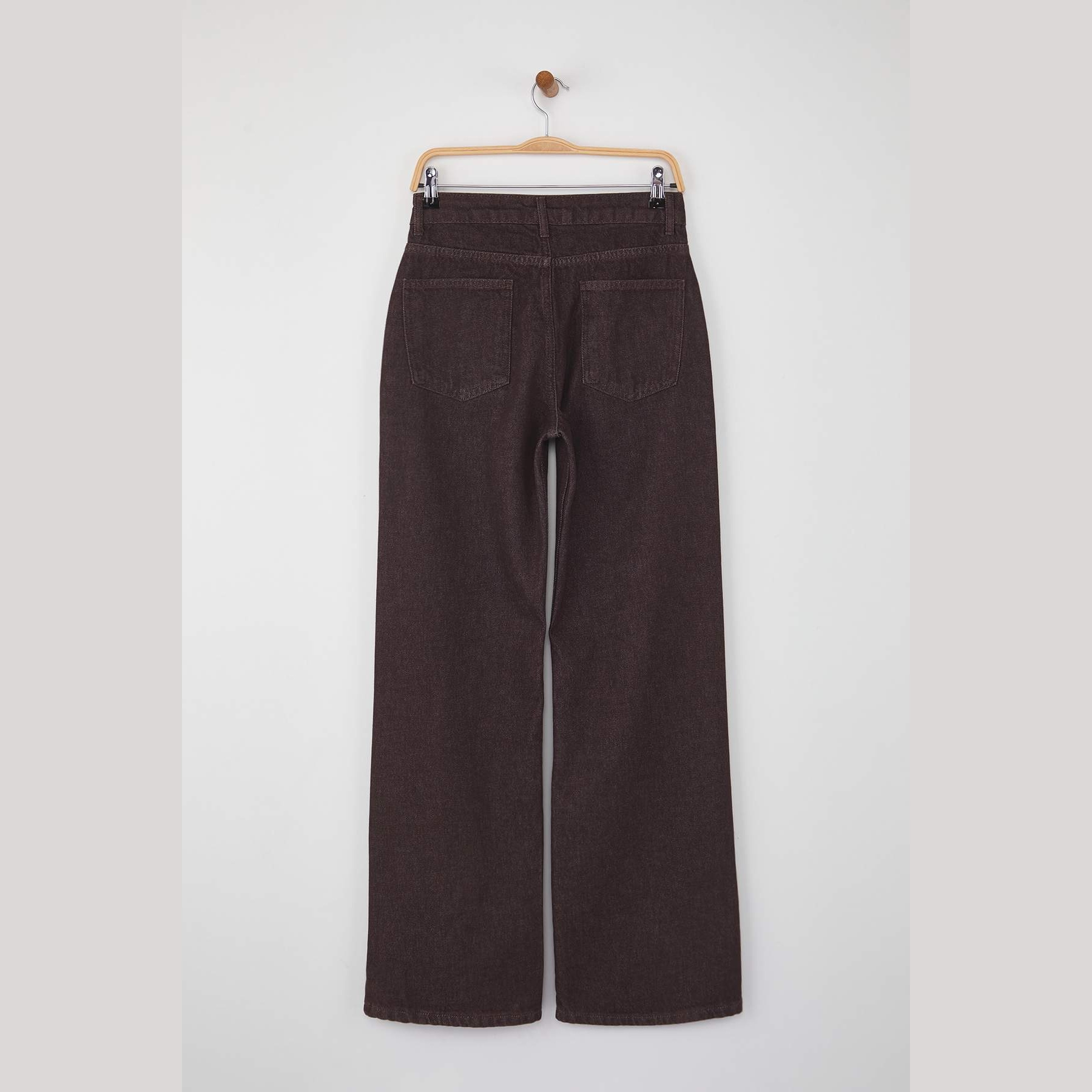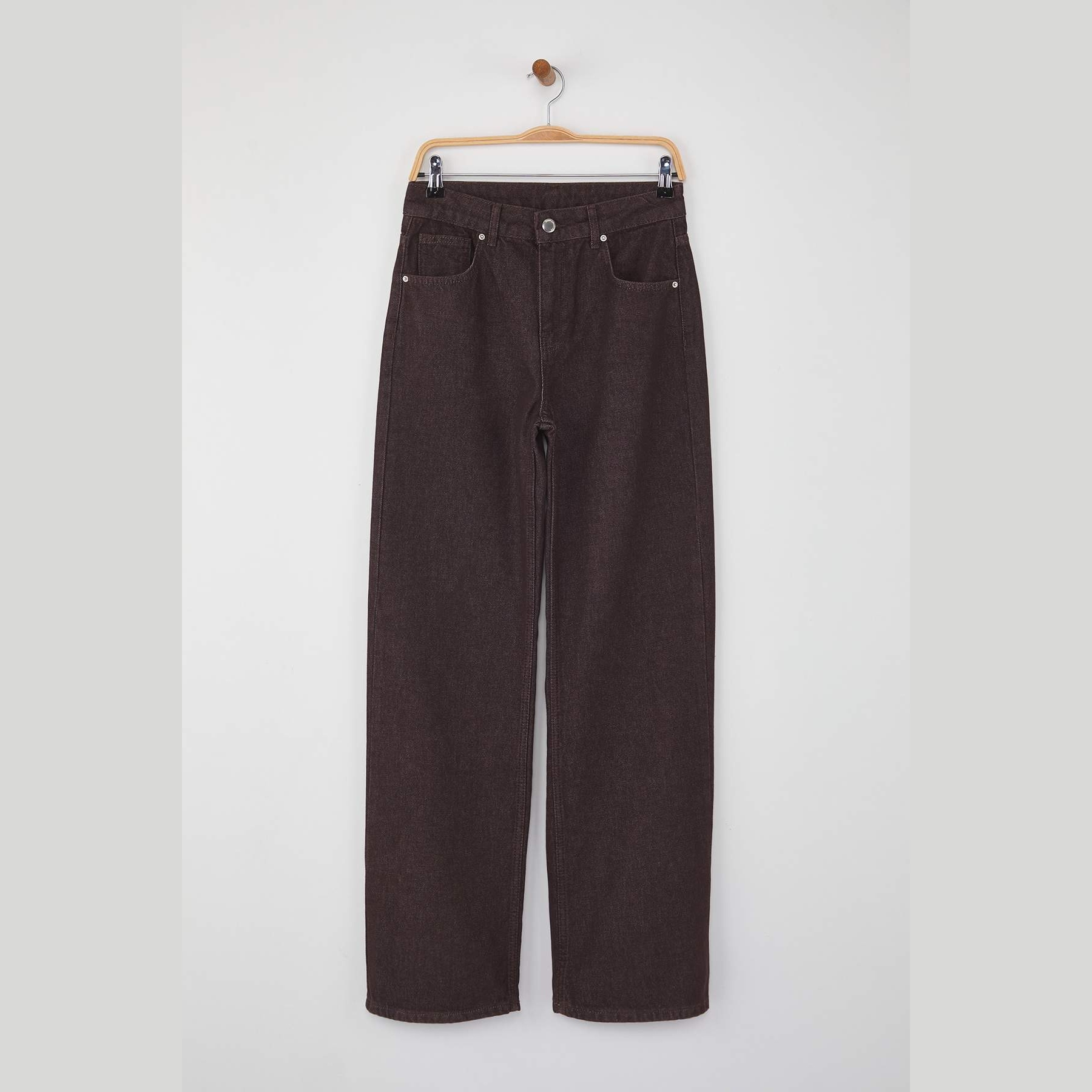 بنطال جينز نسائي بلون بني، مصنوع من قماش دنيم طبيعي 100% قطن، يتميز بخصر مرتفع، قصة واسعة من الأسفل، وإغلاق أمامي بزر وسحاب. تصميم عملي يمنحك إطلالة مريحة وعصرية تناسب الاستخدام اليومي.