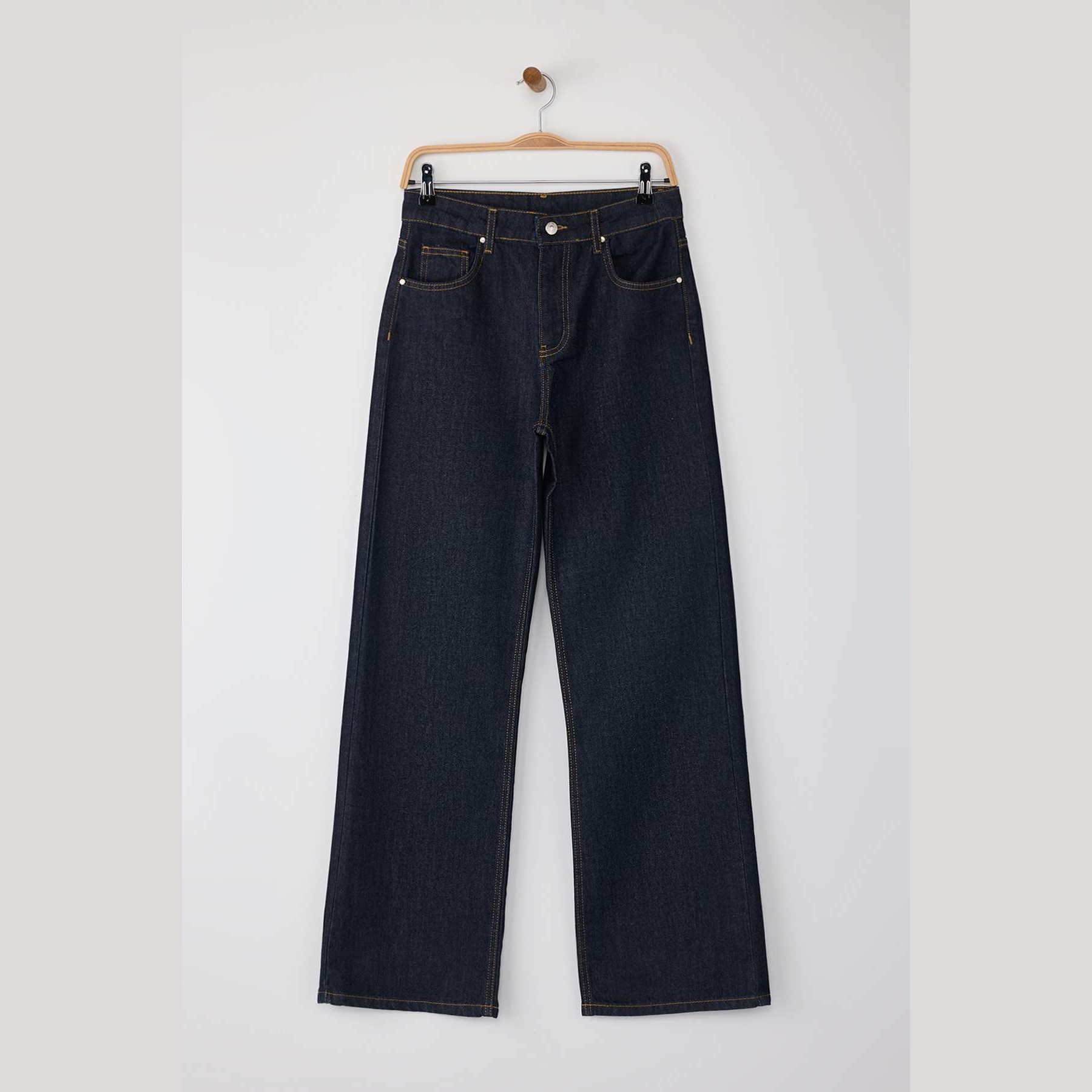 بنطال جينز نسائي بلون كُحلي داكن، مصنوع من قماش دنيم طبيعي 100% قطن، يتميز بخصر مرتفع، قصة واسعة من الأسفل، وإغلاق أمامي بزر وسحاب. تصميم عملي يمنحك إطلالة مريحة وعصرية تناسب الاستخدام اليومي.