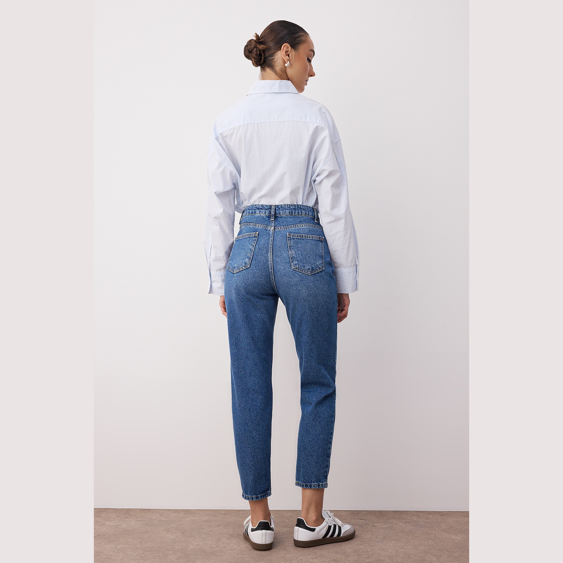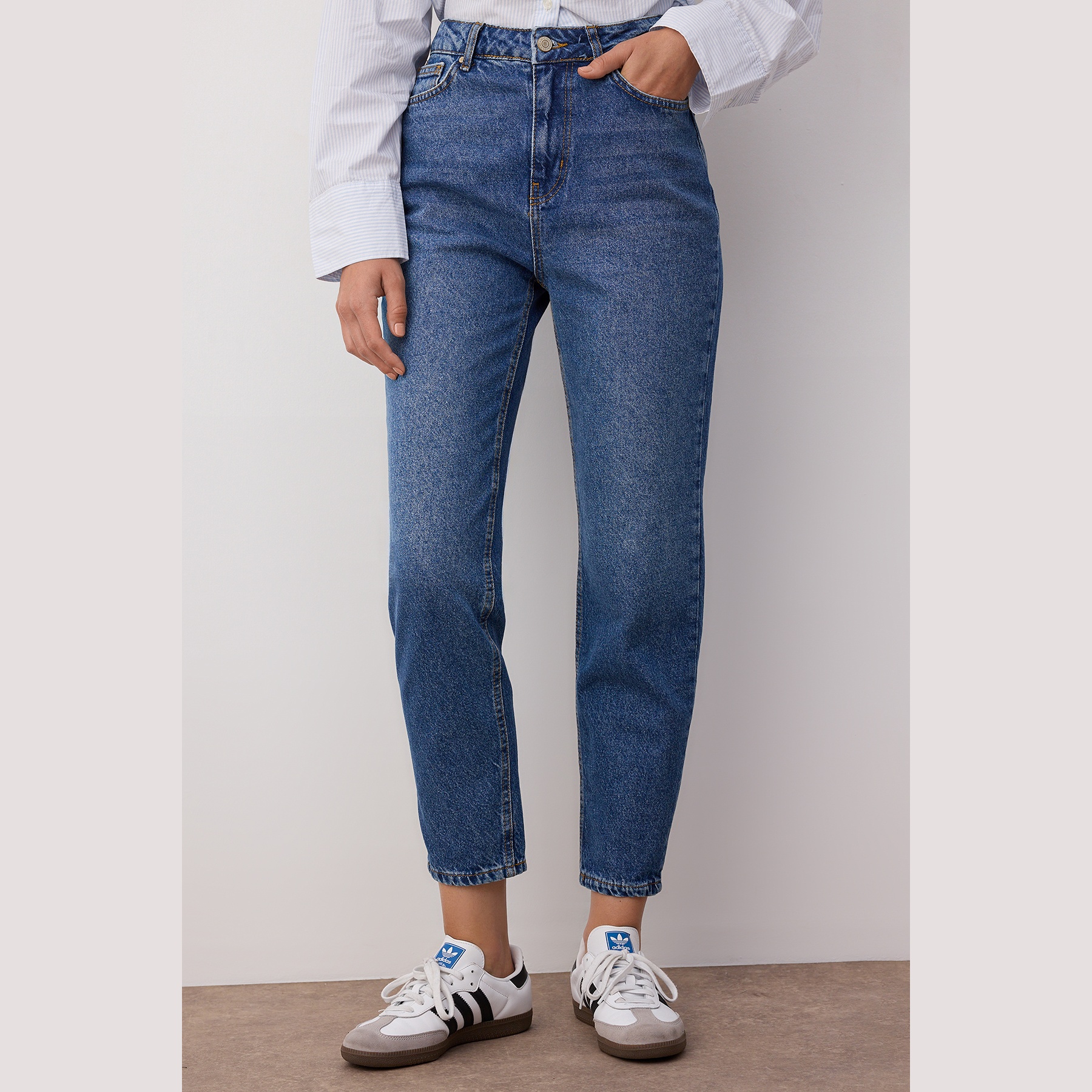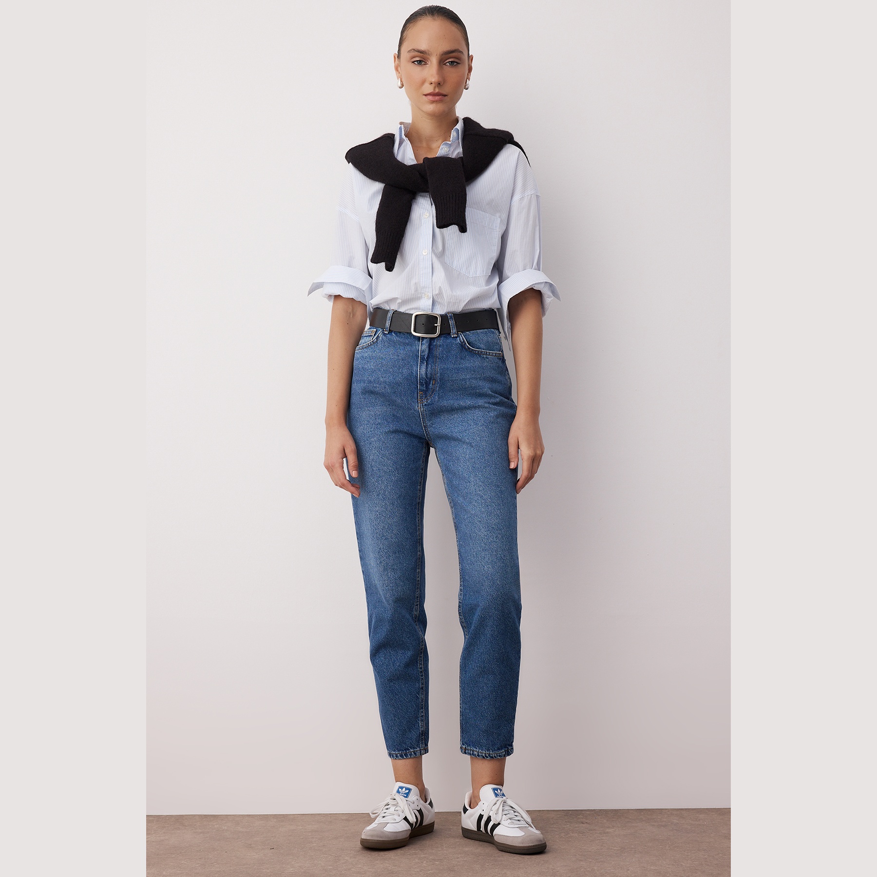 بنطال جينز نسائي بلون أزرق، مصنوع من قماش دنيم طبيعي 100% قطن، يتميز بخصر مرتفع، قصة Mom مستقيمة ومريحة، مع إغلاق أمامي بزر وسحاب. تصميم عملي يمنحك إطلالة يومية أنيقة بلمسة كلاسيكية.