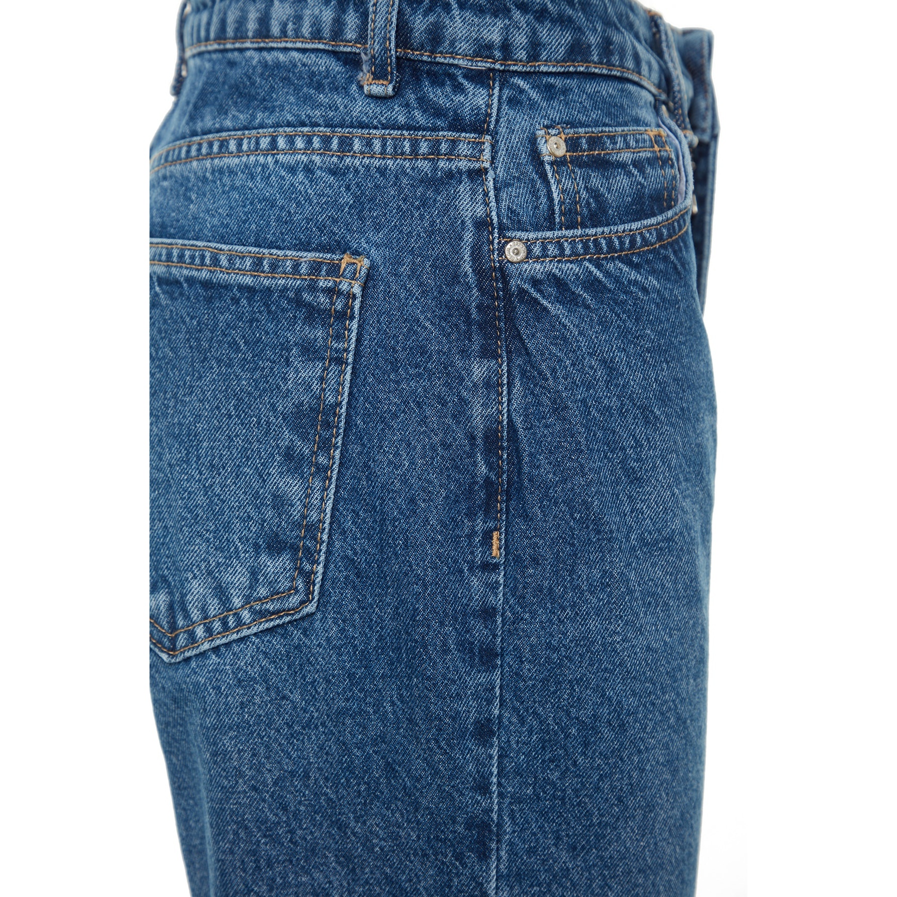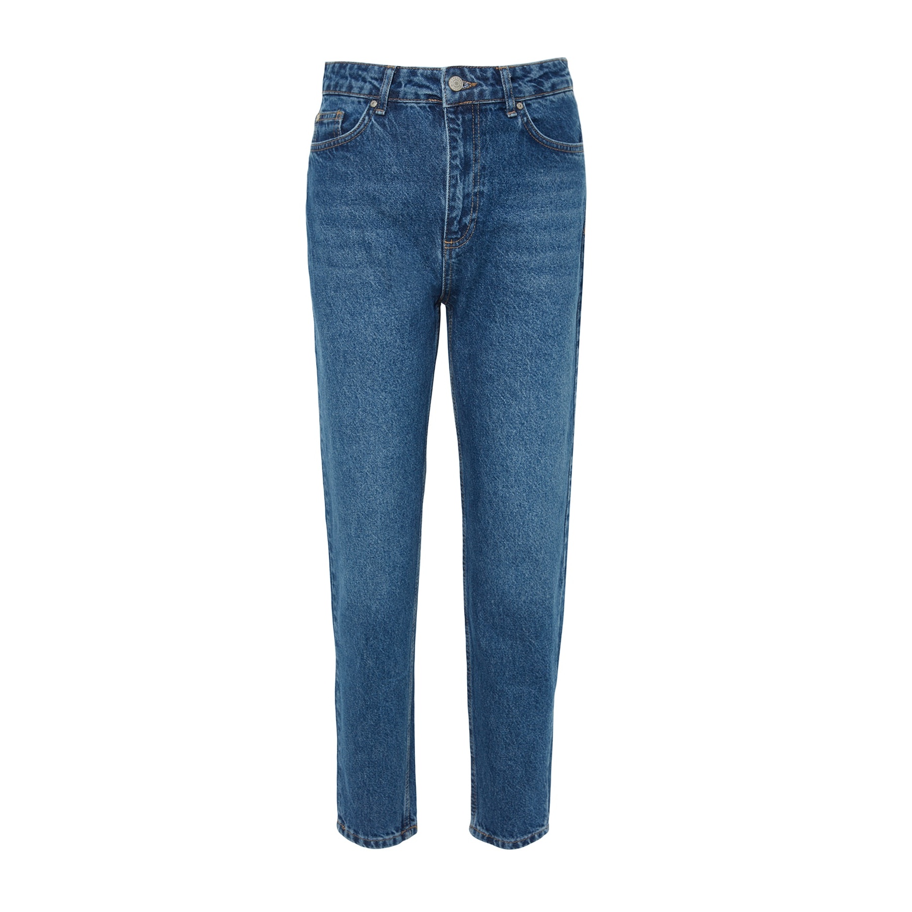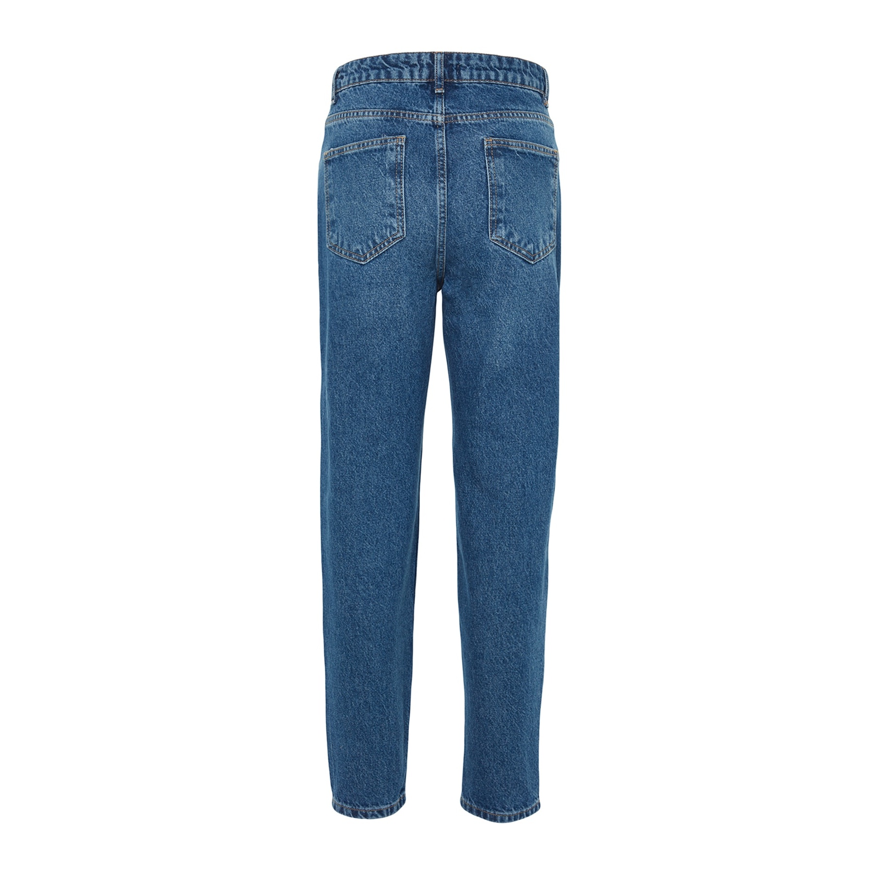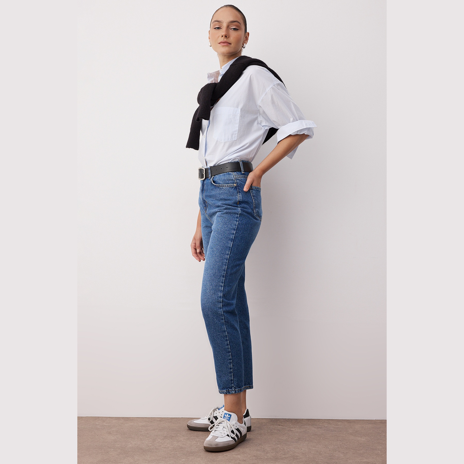 بنطال جينز نسائي بلون أزرق، مصنوع من قماش دنيم طبيعي 100% قطن، يتميز بخصر مرتفع، قصة Mom مستقيمة ومريحة، مع إغلاق أمامي بزر وسحاب. تصميم عملي يمنحك إطلالة يومية أنيقة بلمسة كلاسيكية.