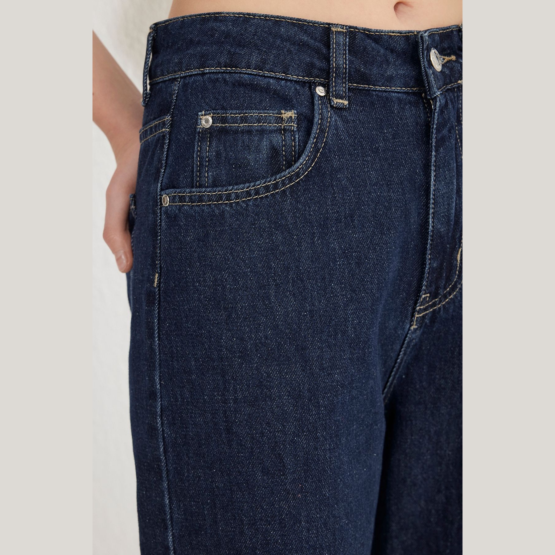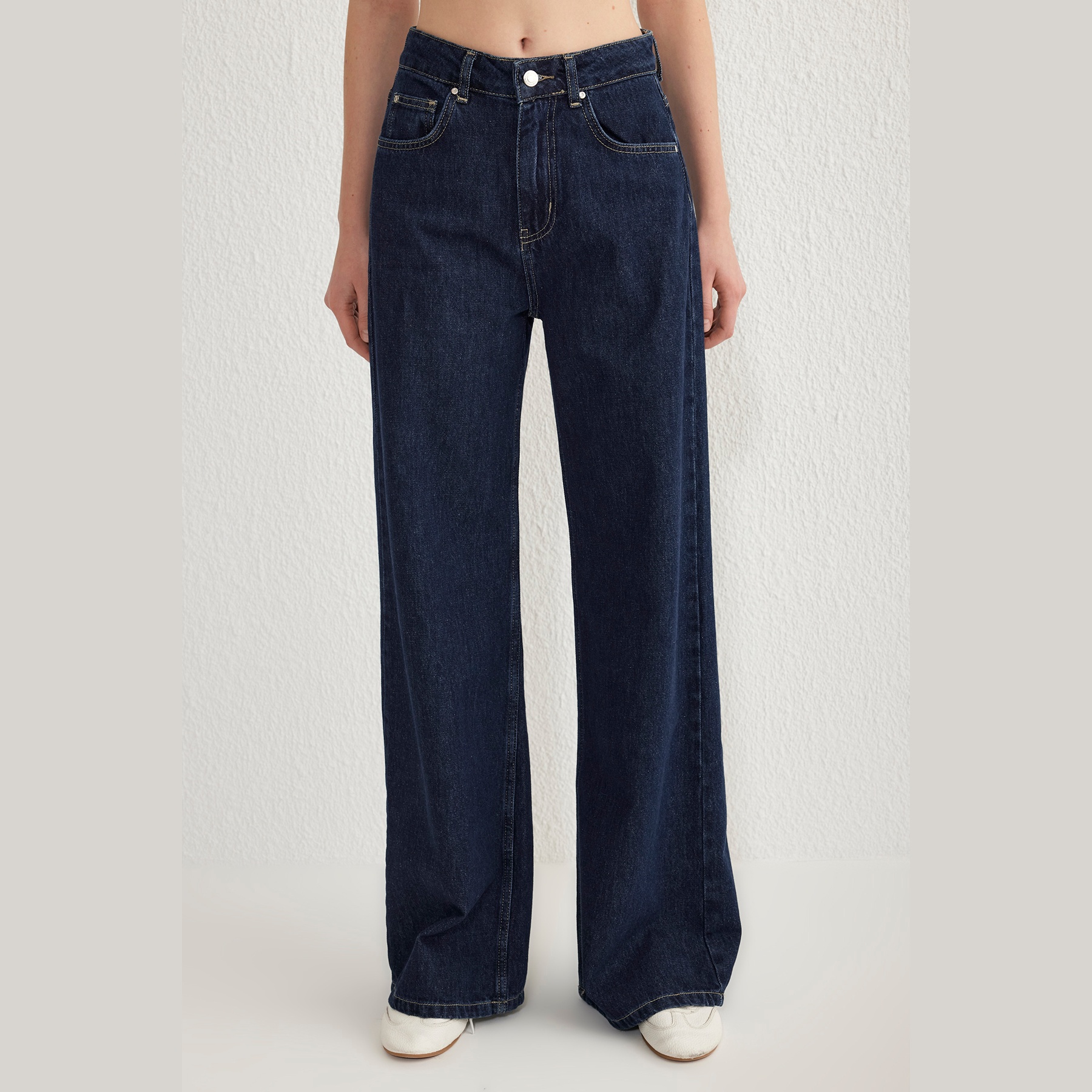 بنطال جينز نسائي بلون كُحلي داكن، مصنوع من قماش دنيم طبيعي 100% قطن، يتميز بخصر عادي، قصة واسعة من الأسفل، وإغلاق أمامي بزر وسحاب. تصميم عملي يمنحك إطلالة مريحة وعصرية تناسب الاستخدام اليومي.