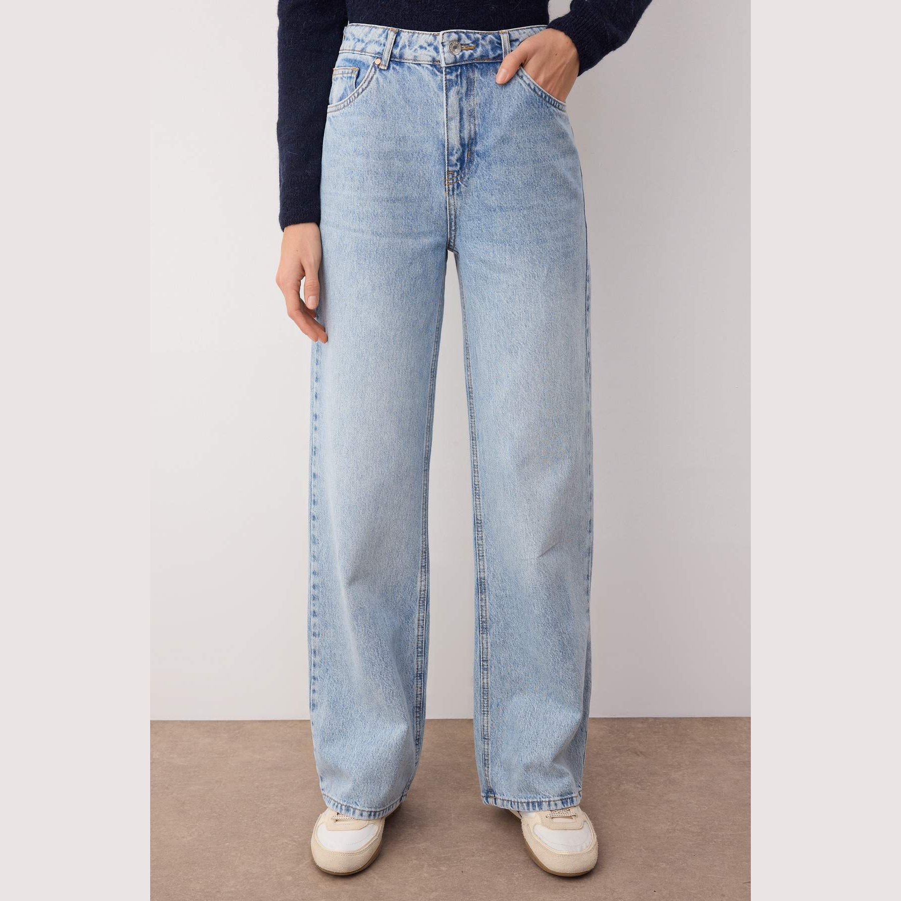بنطال جينز نسائي بلون أزرق فاتح، مصنوع من قماش دنيم طبيعي 100% قطن، يتميز بخصر مرتفع، قصة واسعة من الأسفل، وإغلاق أمامي بزر وسحاب. تصميم عملي يمنحك إطلالة كاجوال مريحة ومشرقة تناسب الاستخدام اليومي.