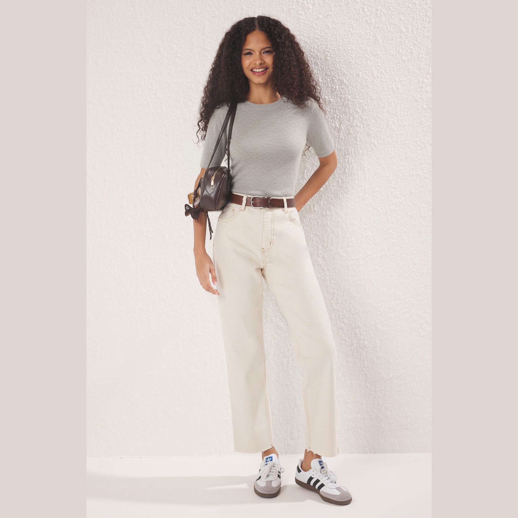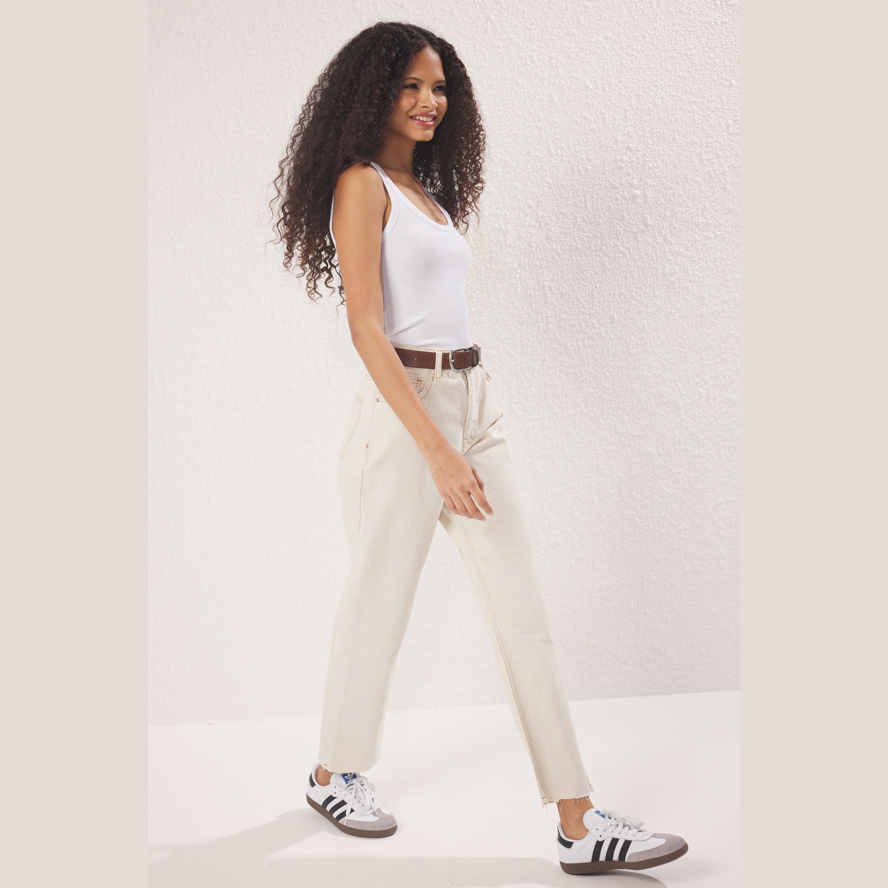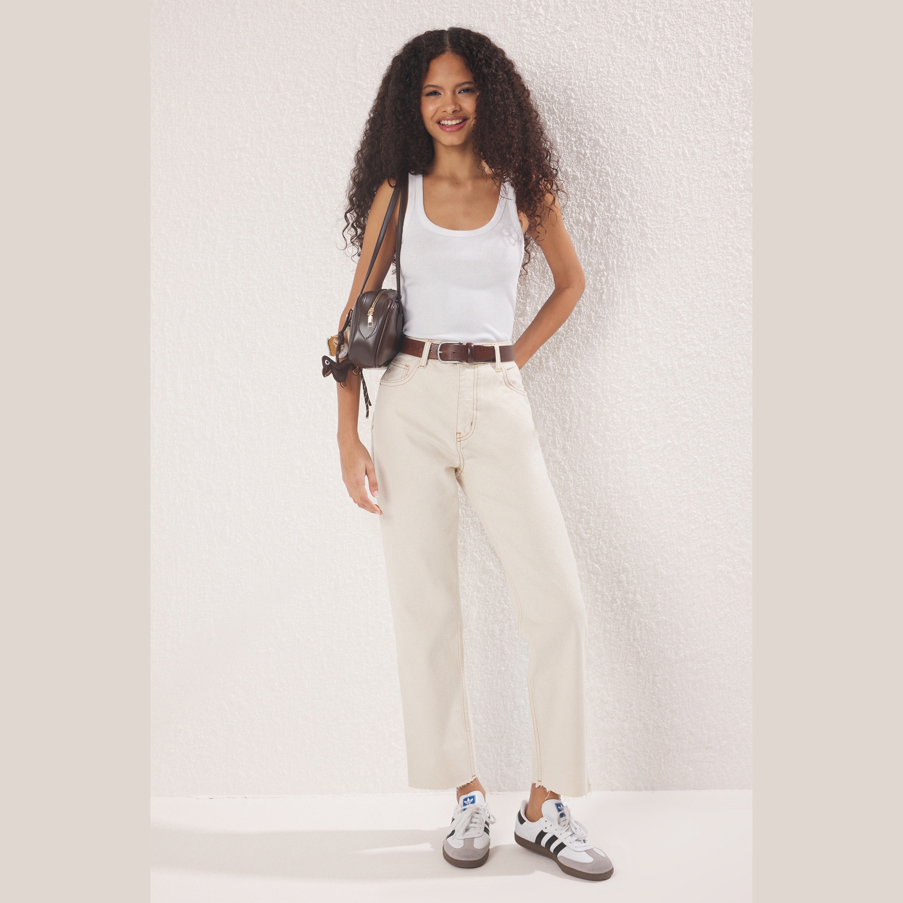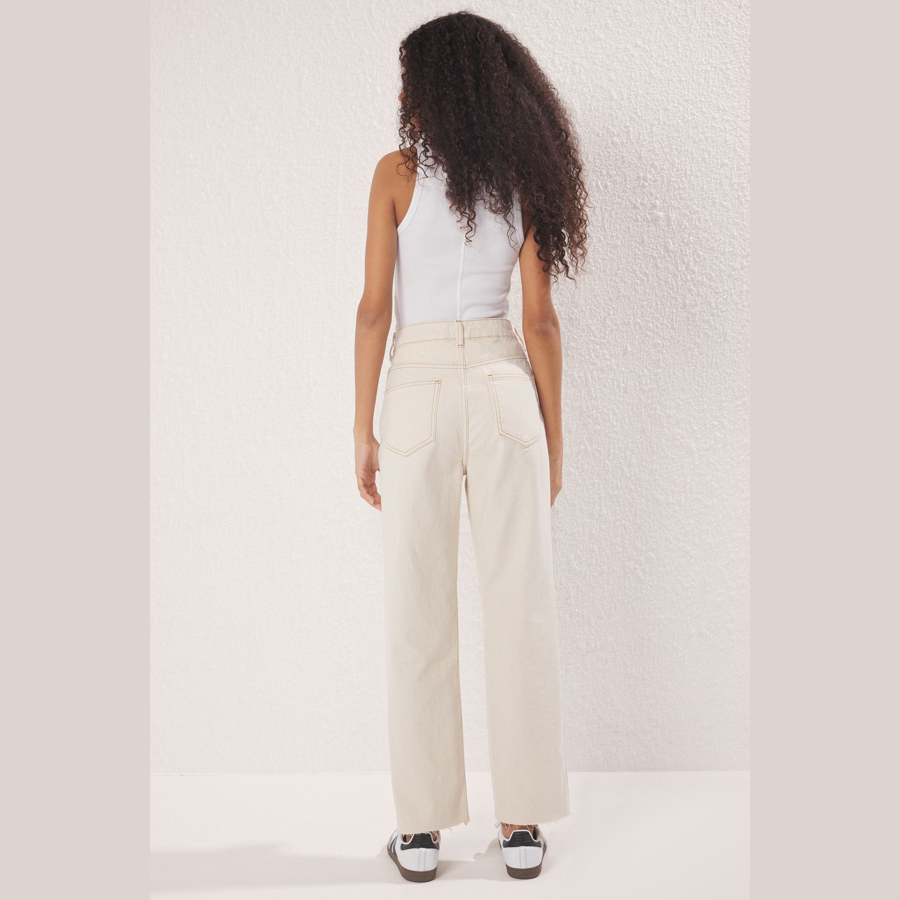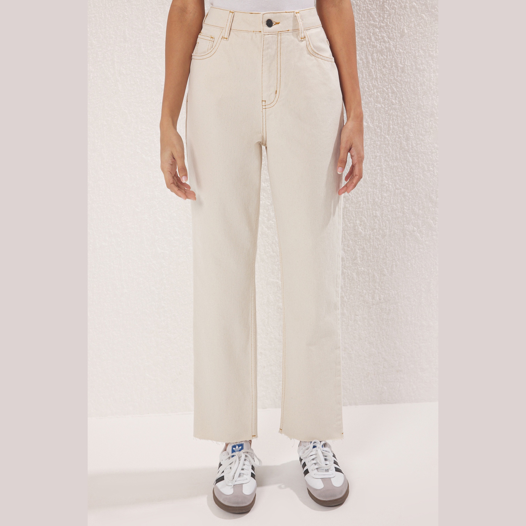 بنطال جينز نسائي بلون إكرو، مصنوع من قماش دنيم طبيعي 100% قطن، يتميز بخصر مرتفع، قصة مستقيمة مريحة، ونهاية أرجل مقصوصة تضيف لمسة عصرية، مع إغلاق أمامي بزر وسحاب. تصميم عملي يمنحك إطلالة كاجوال أنيقة ومريحة.