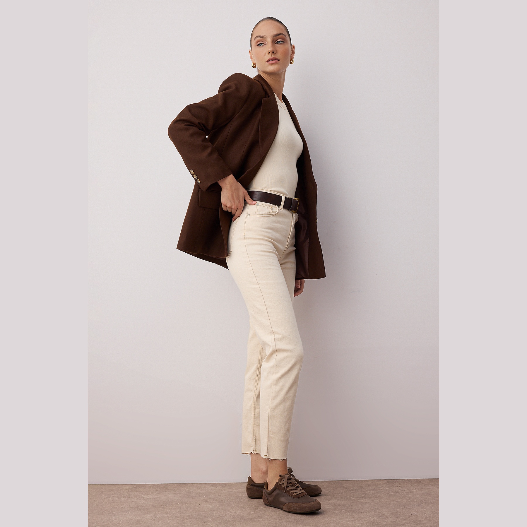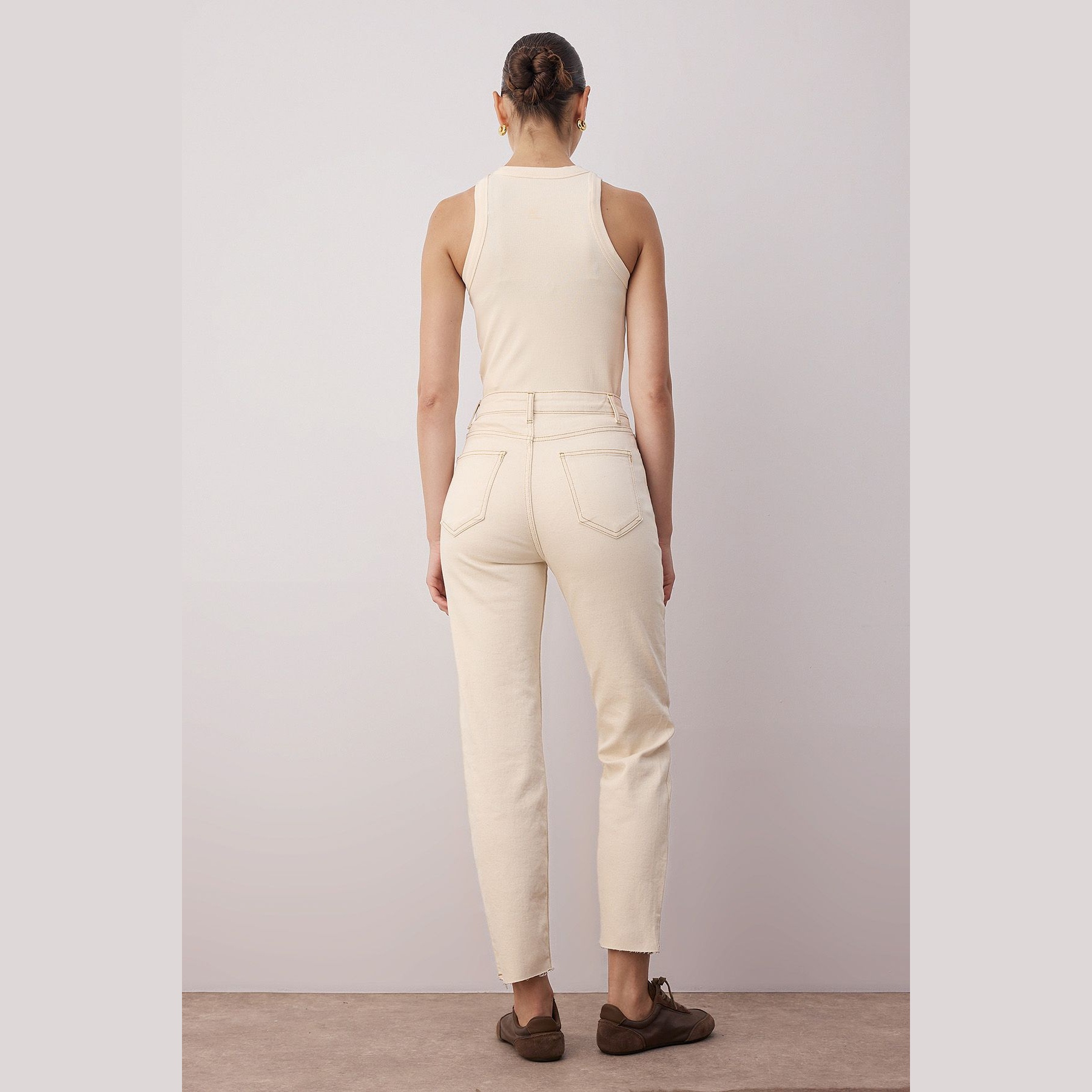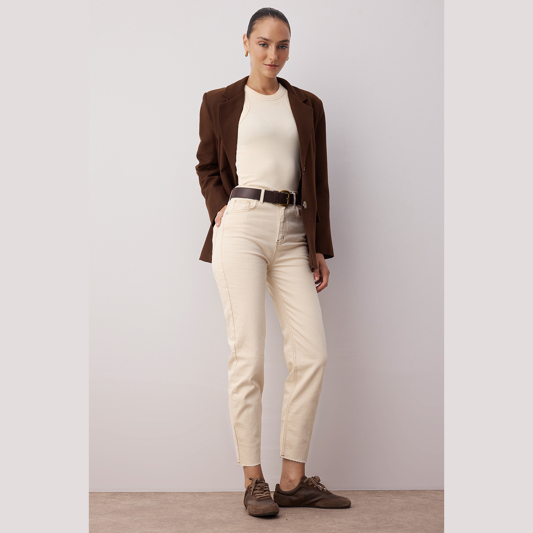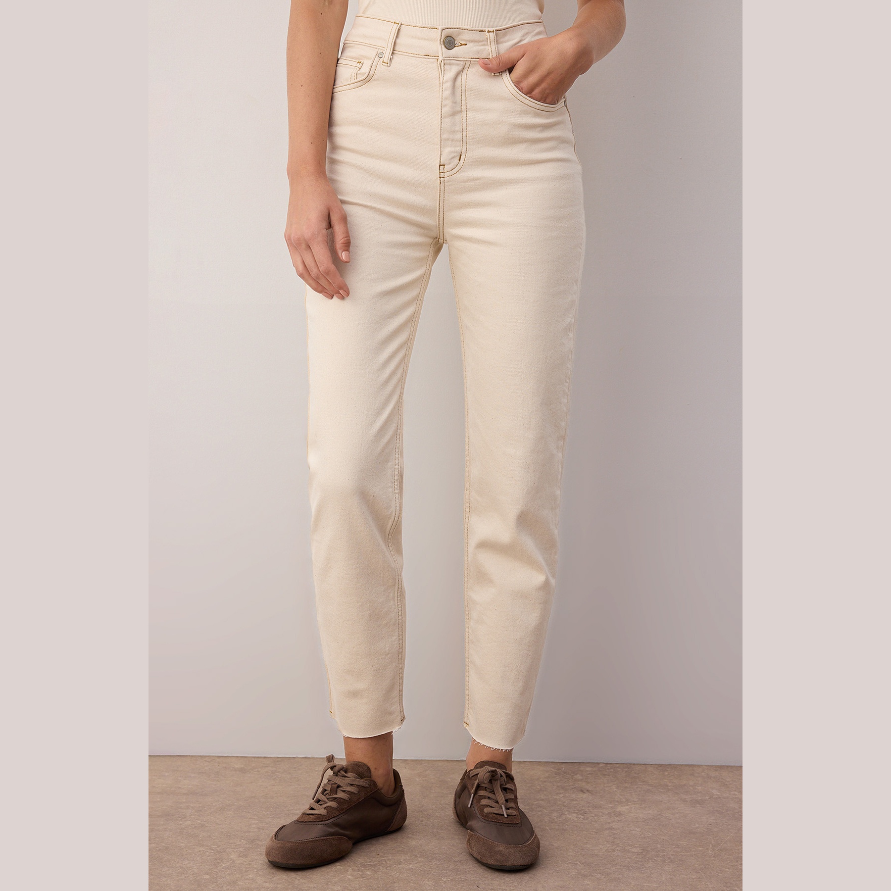 بنطال جينز نسائي بلون إكرو (بيج فاتح)، مصنوع من قماش دنيم مرن بنسبة 99% قطن و1% إيلاستان، يتميز بخصر مرتفع، قصة Mom ضيقة قليلاً (Slim)، مع إغلاق أمامي بزر وسحاب. تصميم عملي يمنحك إطلالة أنثوية مريحة وأنيقة تناسب الاستخدام اليومي.