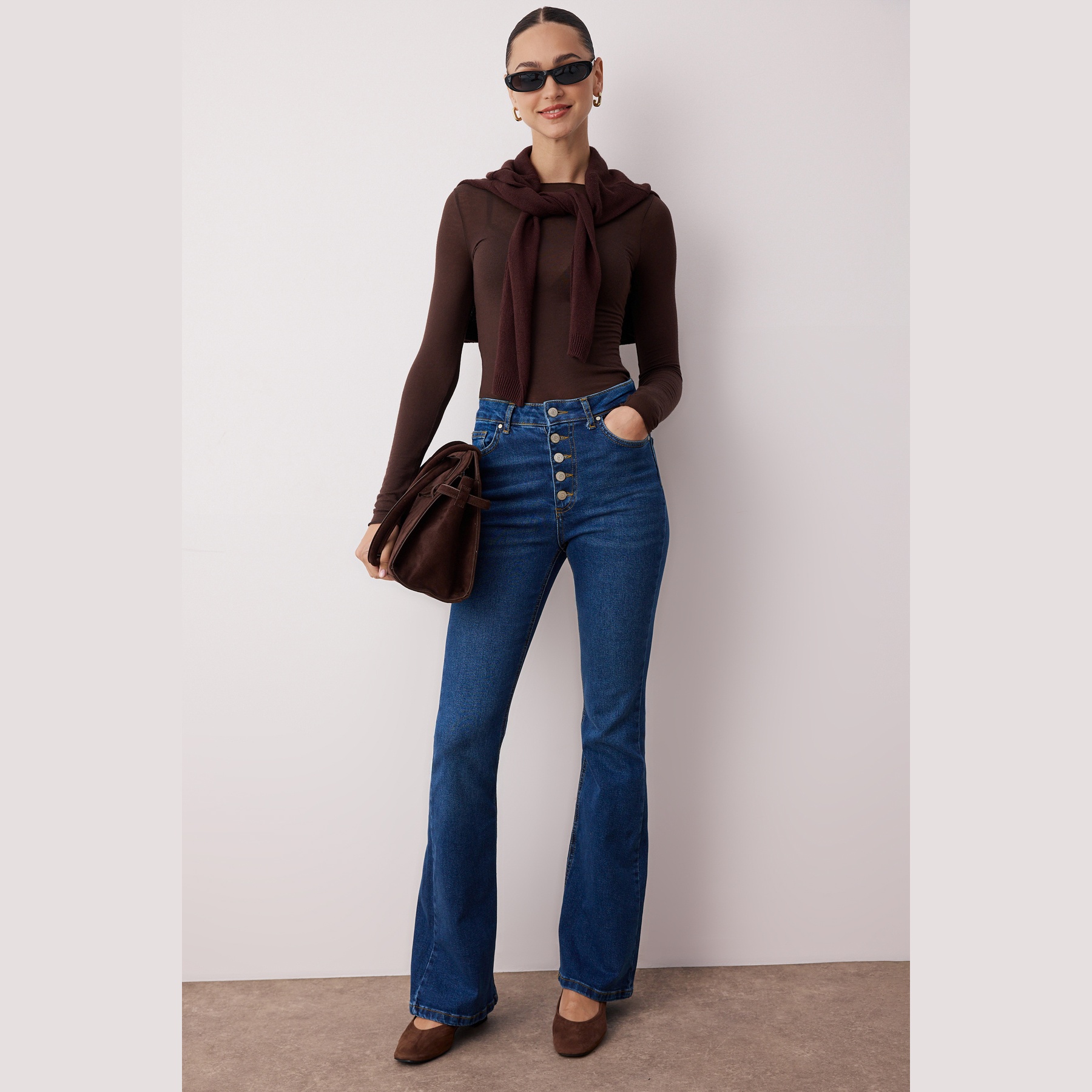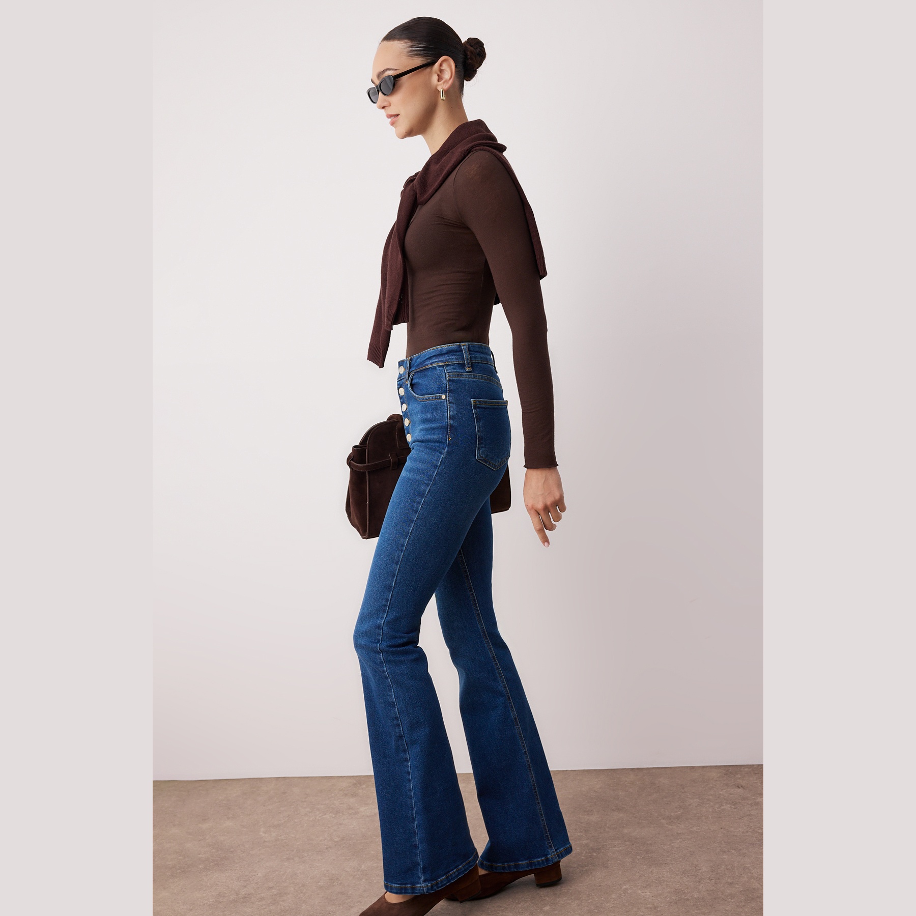 - الخصائص الإضافية: خامة مرنة – قصة Flare – خصر مرتفع – أزرار أمامية – إغلاق بزر وسحاب