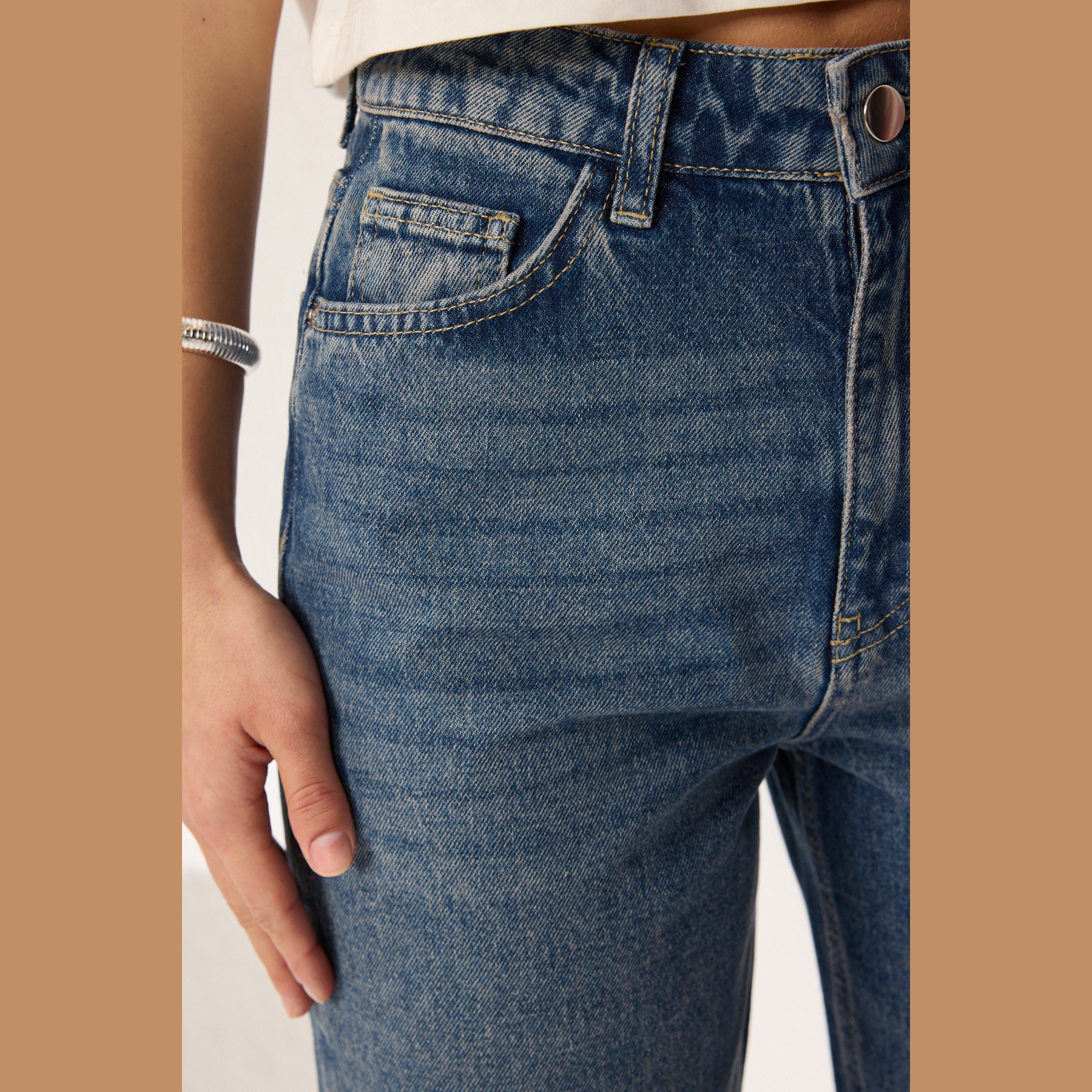 - الخصائص الإضافية: قصة مستقيمة – خصر مرتفع – نهاية مقصوصة – إغلاق بزر وسحاب