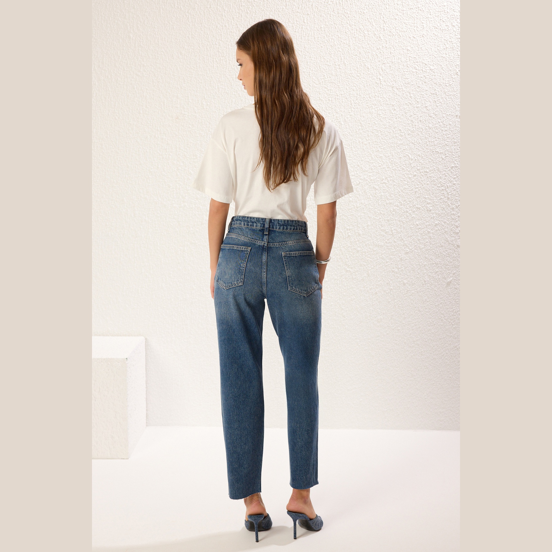 جينز نسائي – أزرق بخصر مرتفع وقصة مستقيمة مع نهاية مقصوصة (Straight Cut-Off Hem)