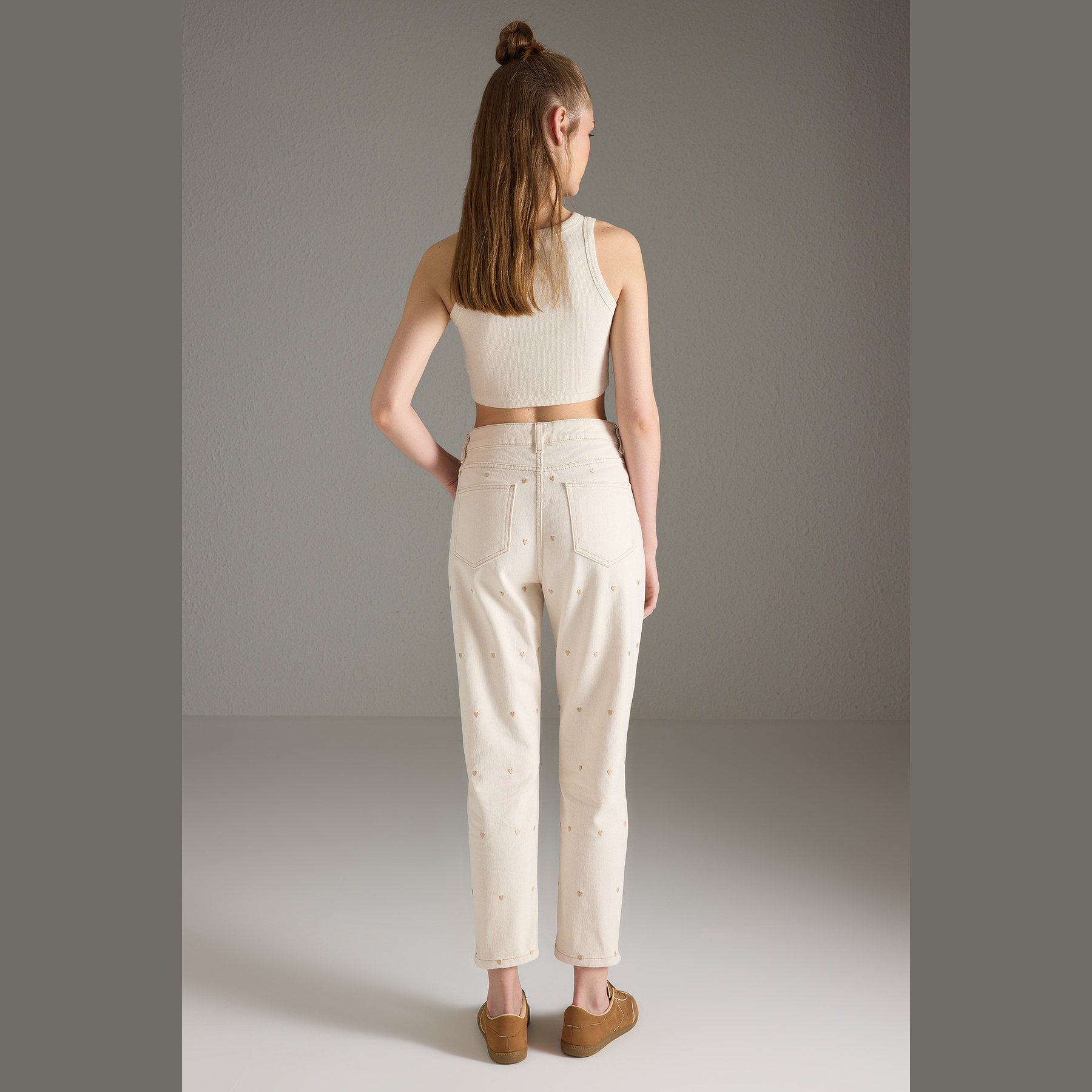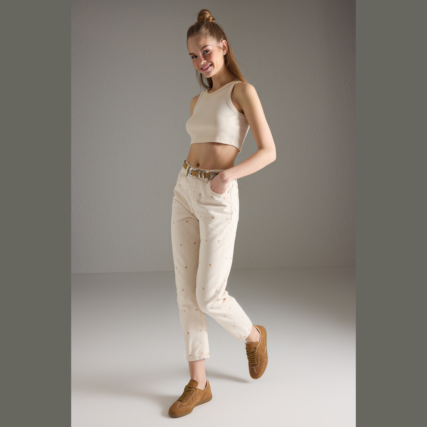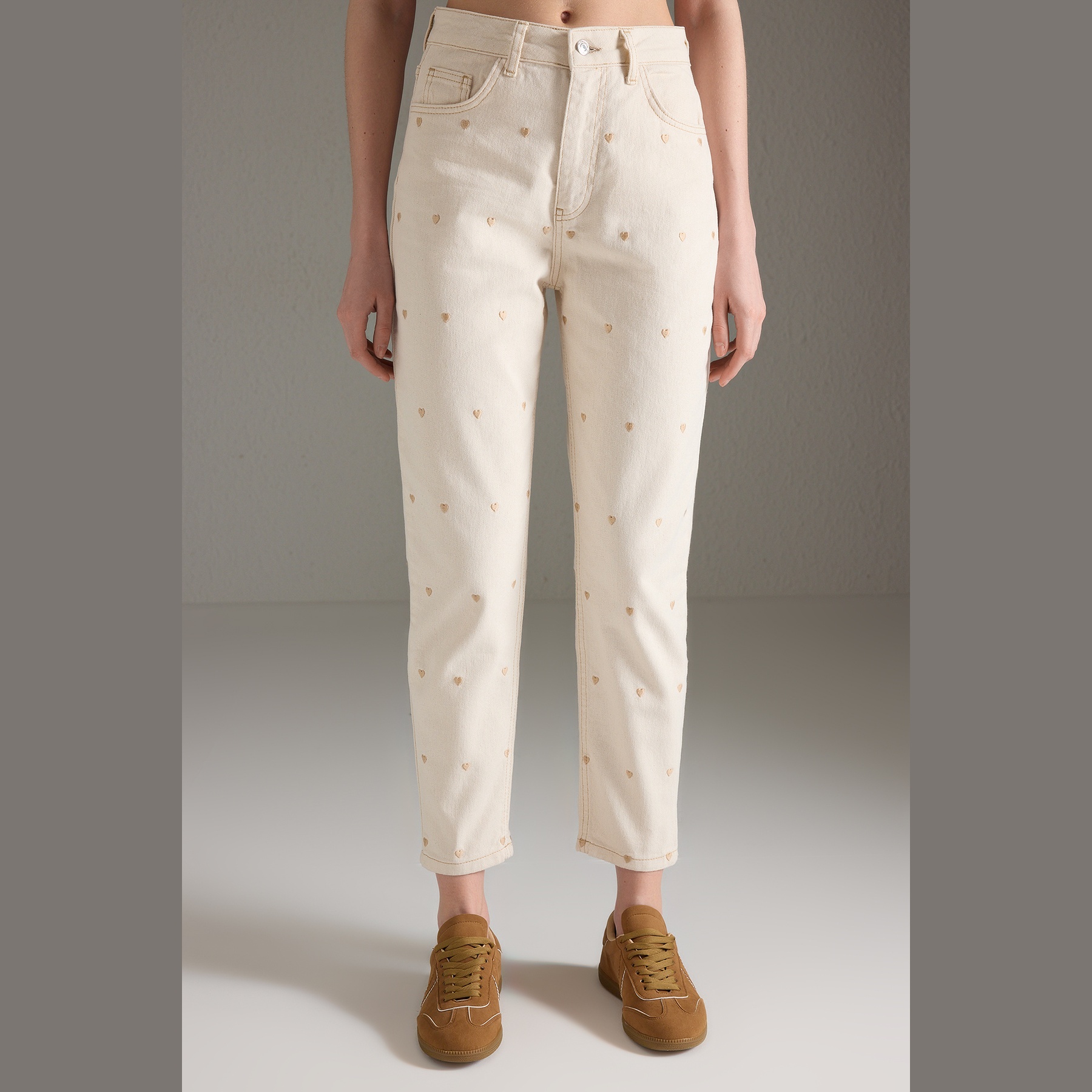 بنطال جينز نسائي بلون بيج، مصنوع من قماش دنيم طبيعي 100% قطن، يتميز بخصر مرتفع، قصة Mom مستقيمة ومريحة، وتفاصيل تطريز قلوب تضيف لمسة أنثوية ناعمة، مع إغلاق أمامي بزر وسحاب. تصميم عملي يمنحك إطلالة كاجوال أنيقة ومفعمة بالأنوثة.