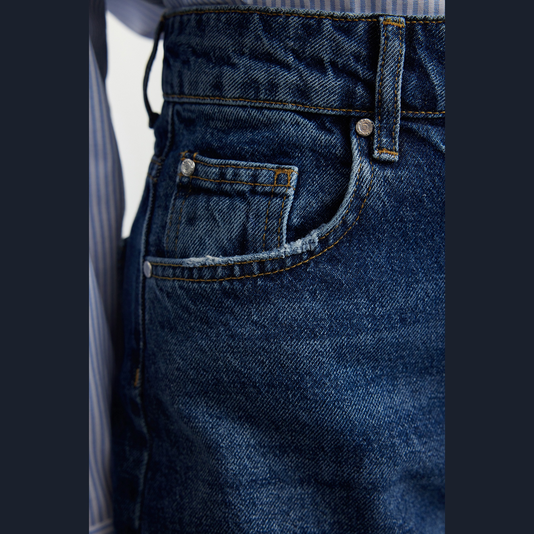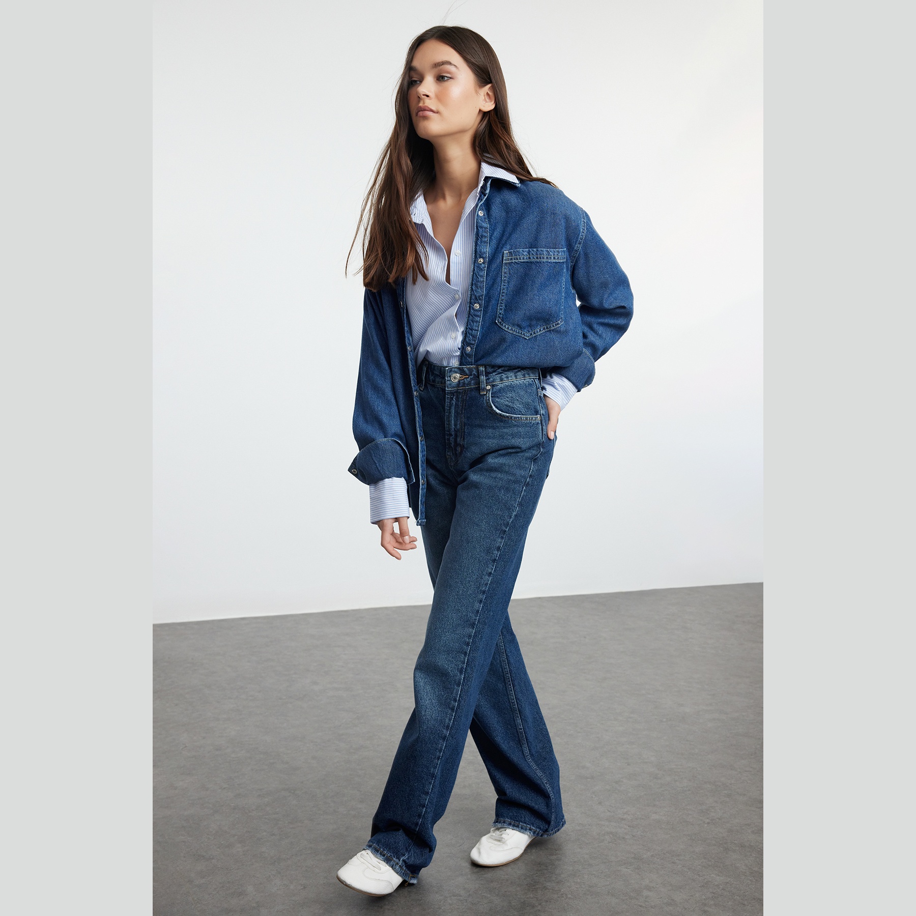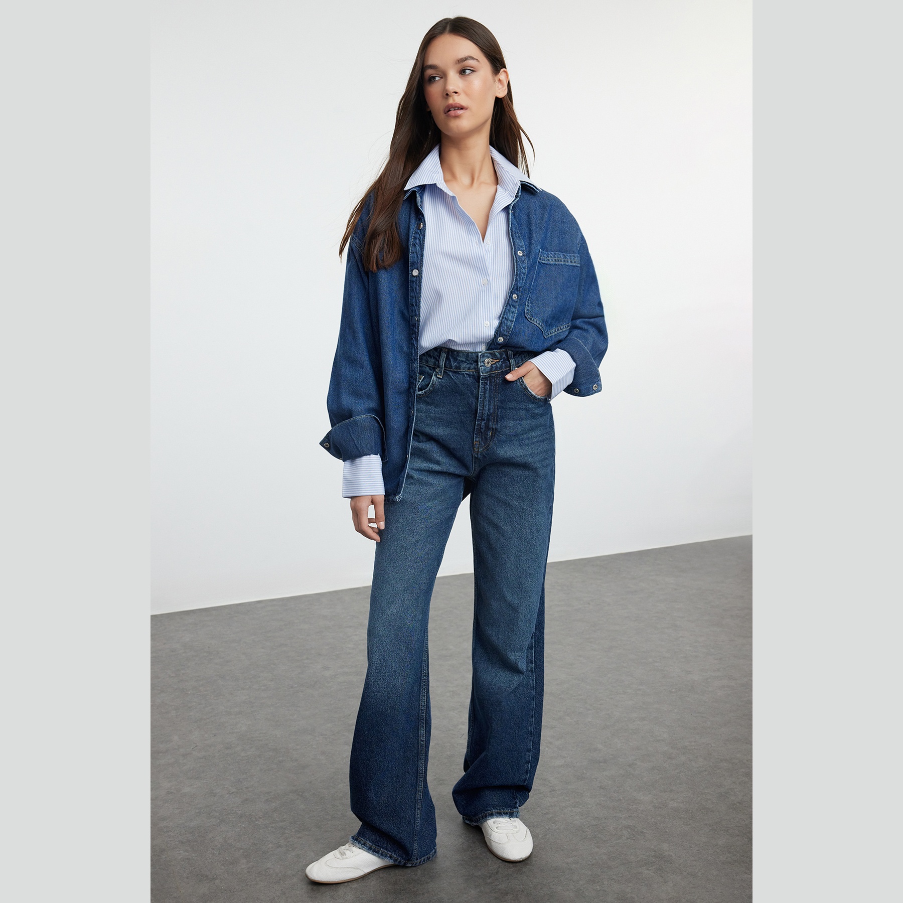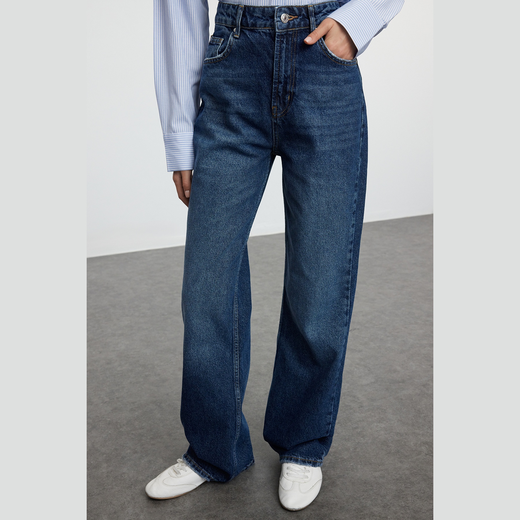بنطال جينز نسائي بلون كُحلي داكن، مصنوع من قماش دنيم طبيعي 100% قطن، يتميز بخصر مرتفع، قصة واسعة من الأسفل، مع إغلاق أمامي بزر وسحاب. تصميم عملي يمنحك إطلالة كاجوال أنيقة ومريحة تناسب جميع المواسم.