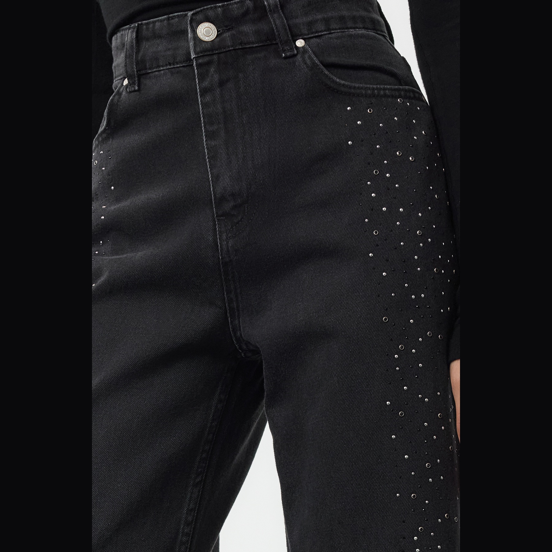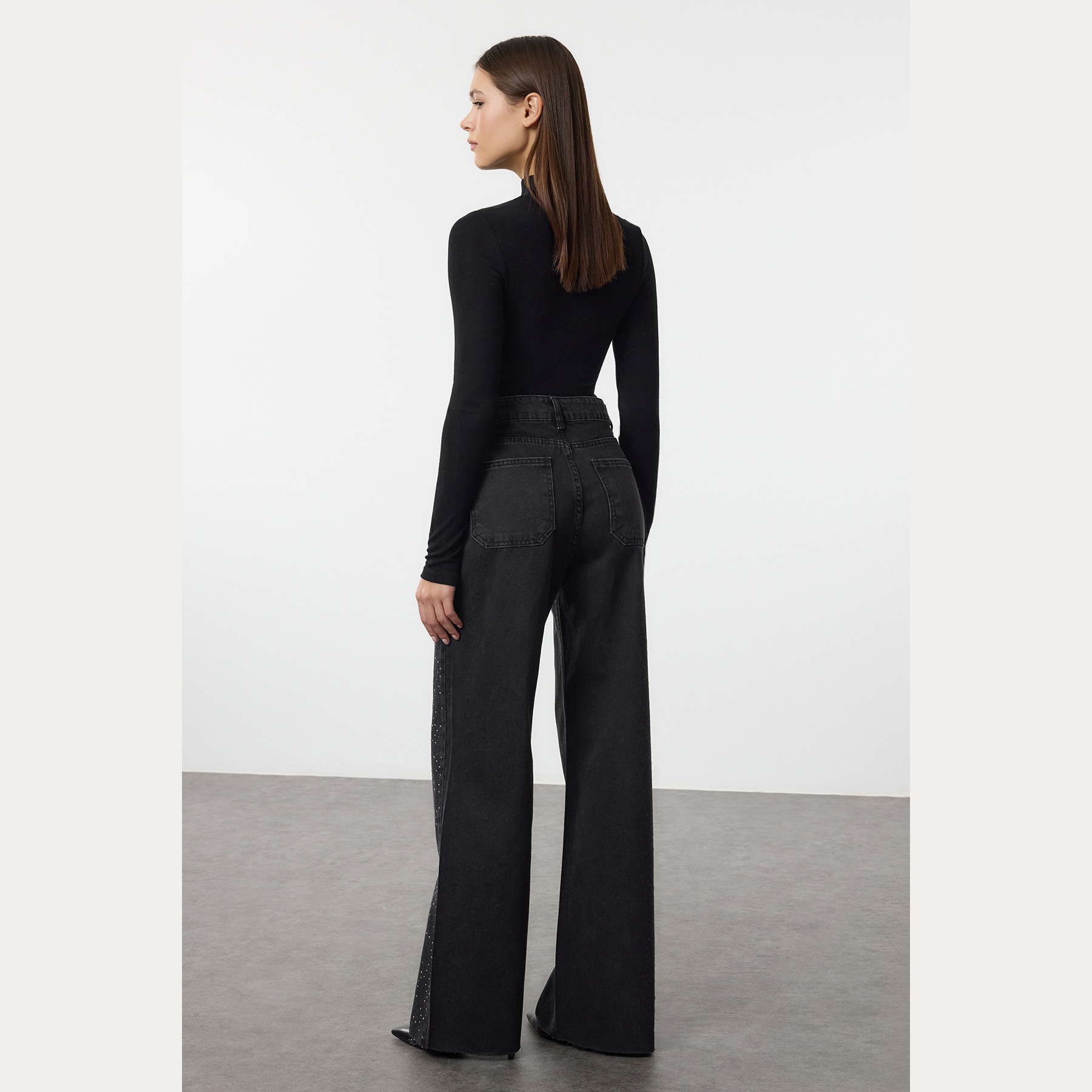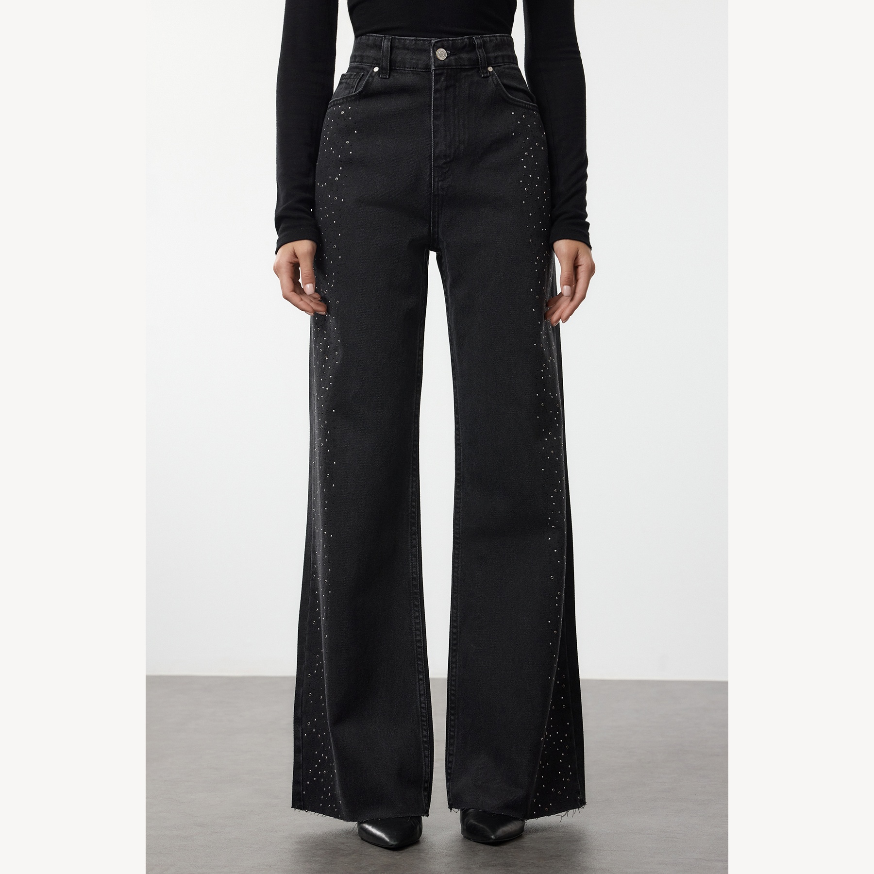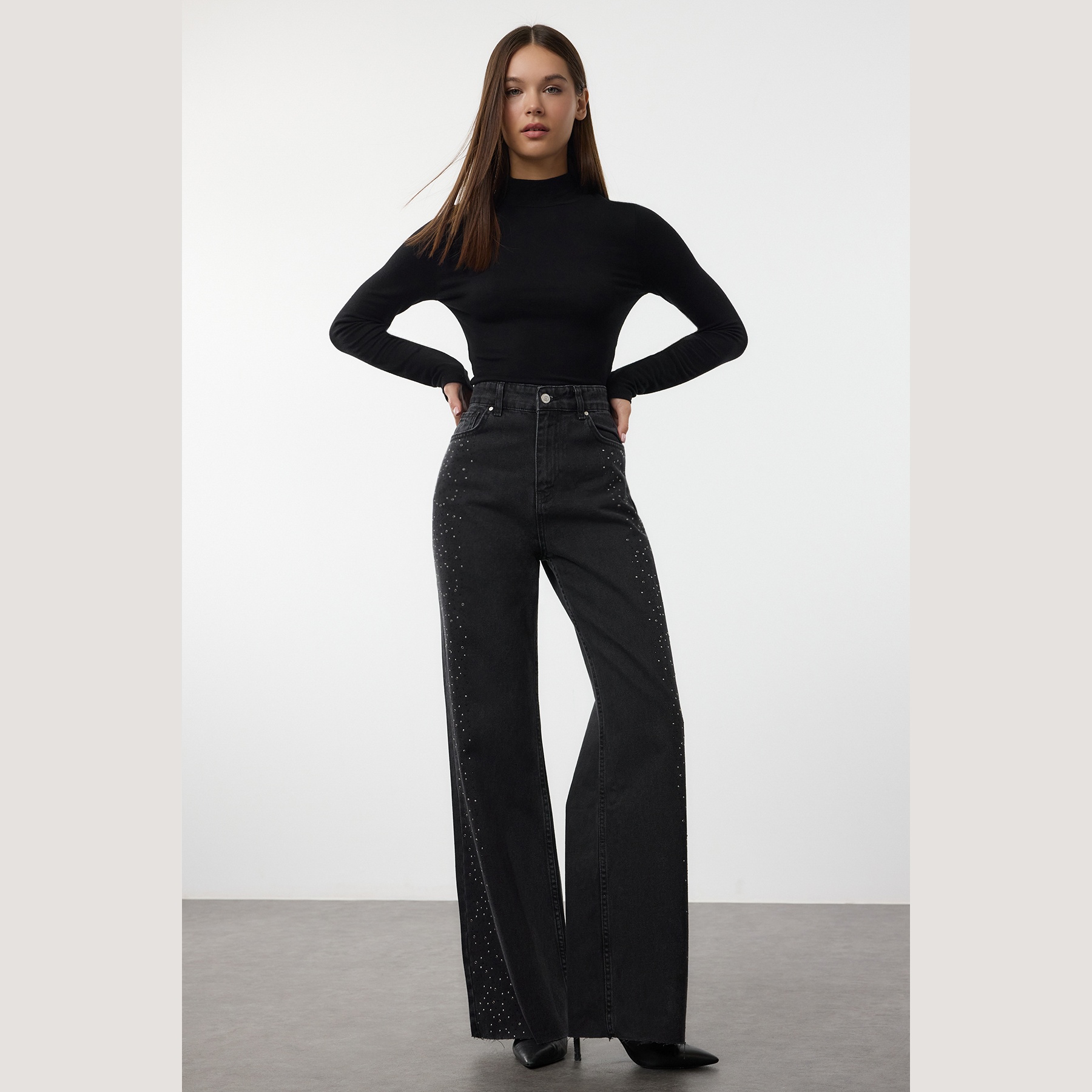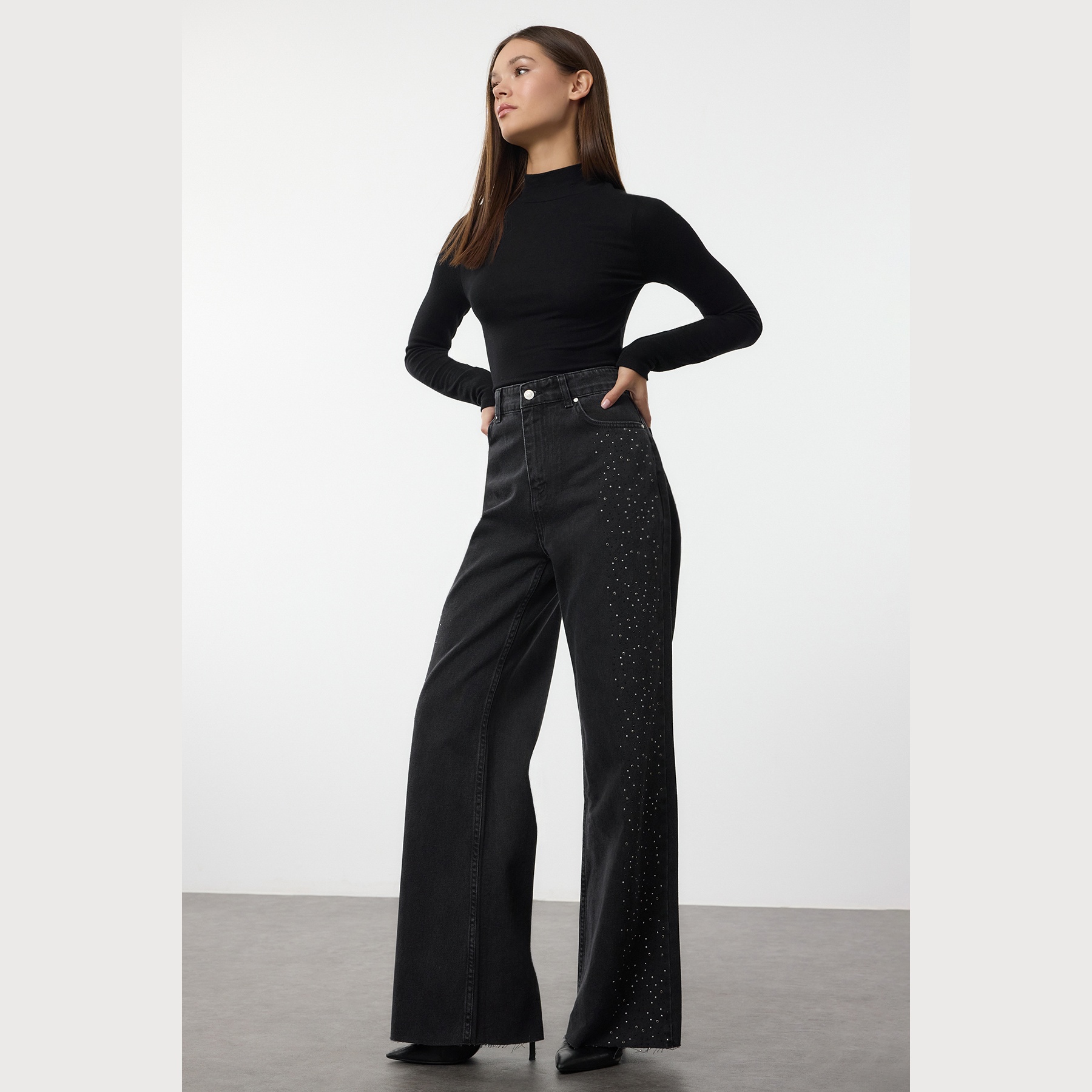 جينز نسائي – أسود بخصر مرتفع وتفاصيل حجرية لامعة وقصة واسعة (Wide Leg)