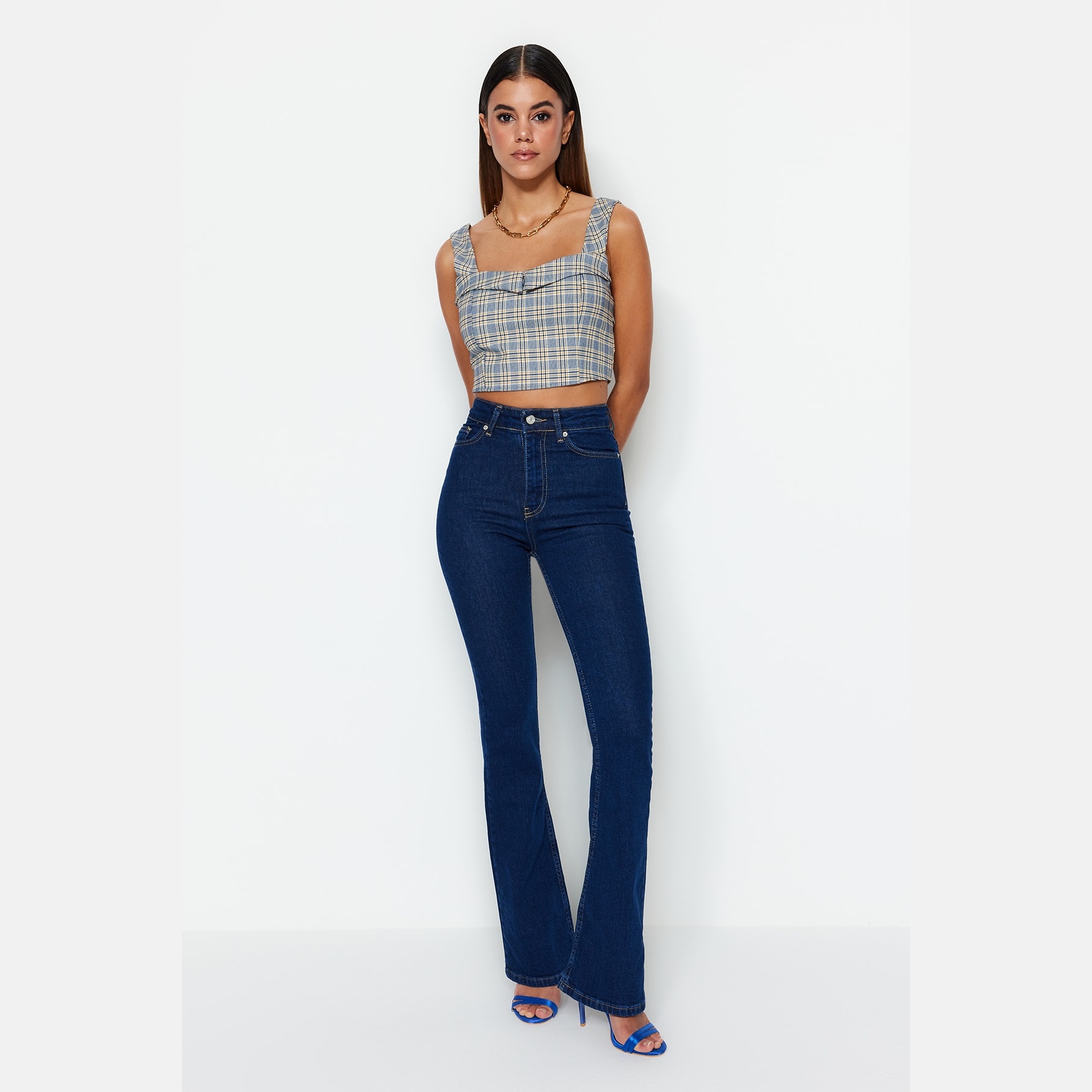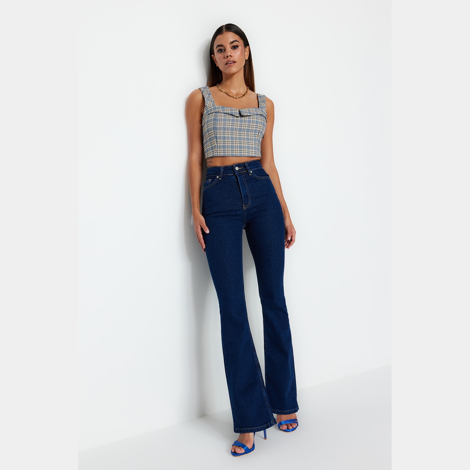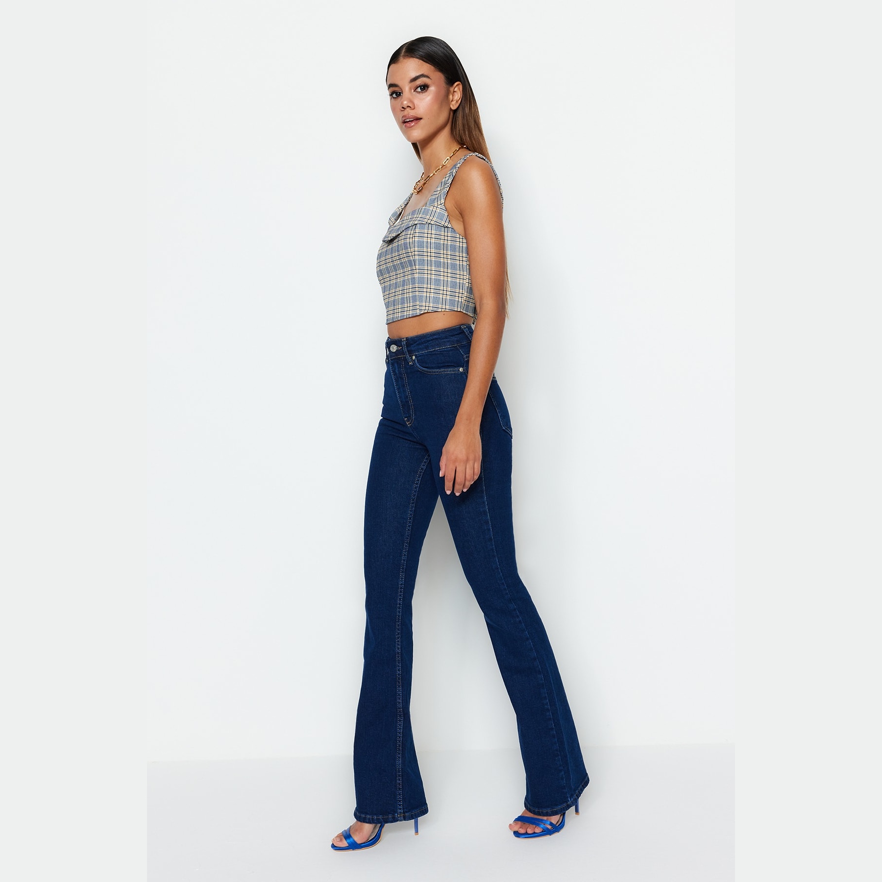 - الخصائص الإضافية: خامة مرنة – قصة Flare – خصر مرتفع – تصميم مستدام – إغلاق بزر وسحاب