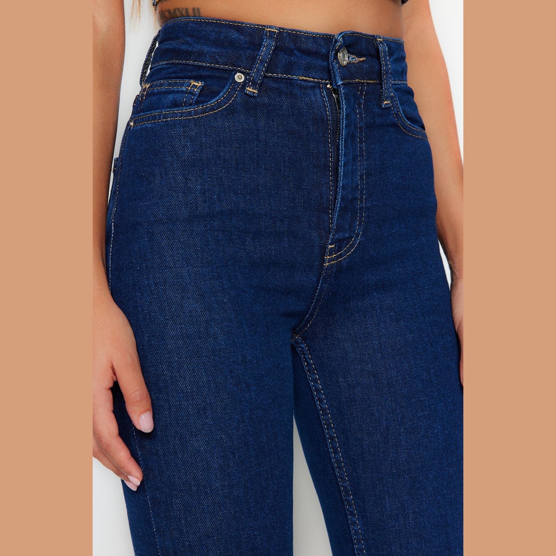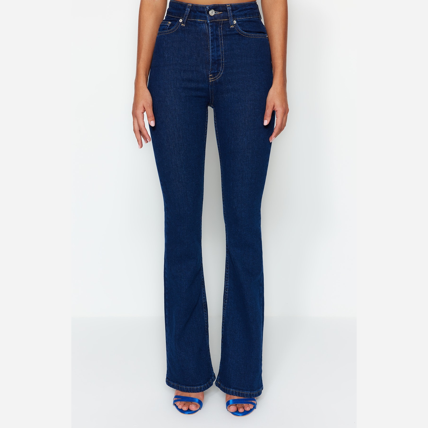 بنطال جينز نسائي بلون كُحلي، من مجموعة More Sustainable، مصنوع من قماش دنيم مرن بنسبة 99% قطن و1% إيلاستان، يتميز بخصر مرتفع، قصة Flare واسعة من الأسفل، مع إغلاق أمامي بزر وسحاب. تصميم عملي يمنحك إطلالة أنثوية مريحة وعصرية مع التزام بالاستدامة.