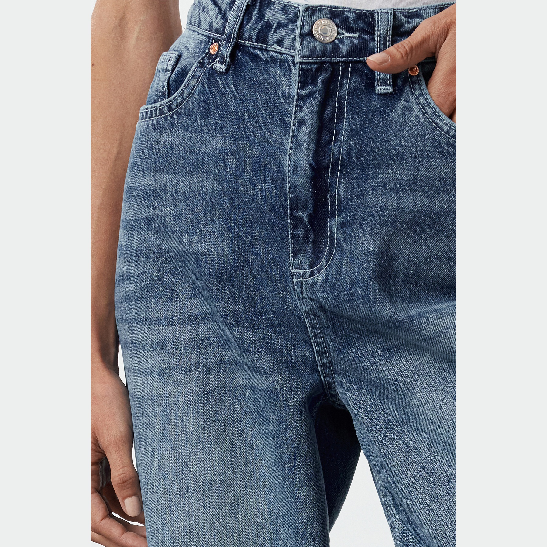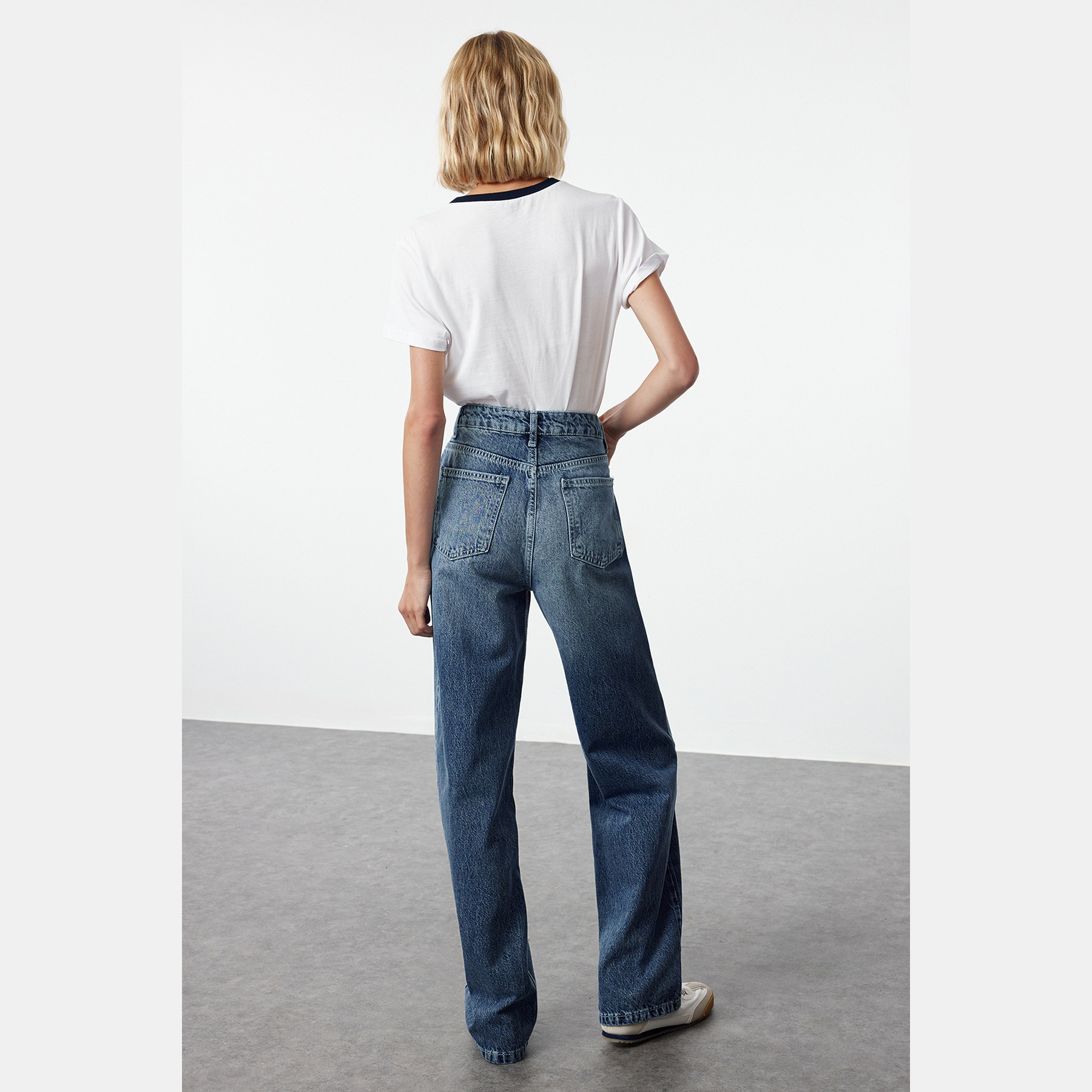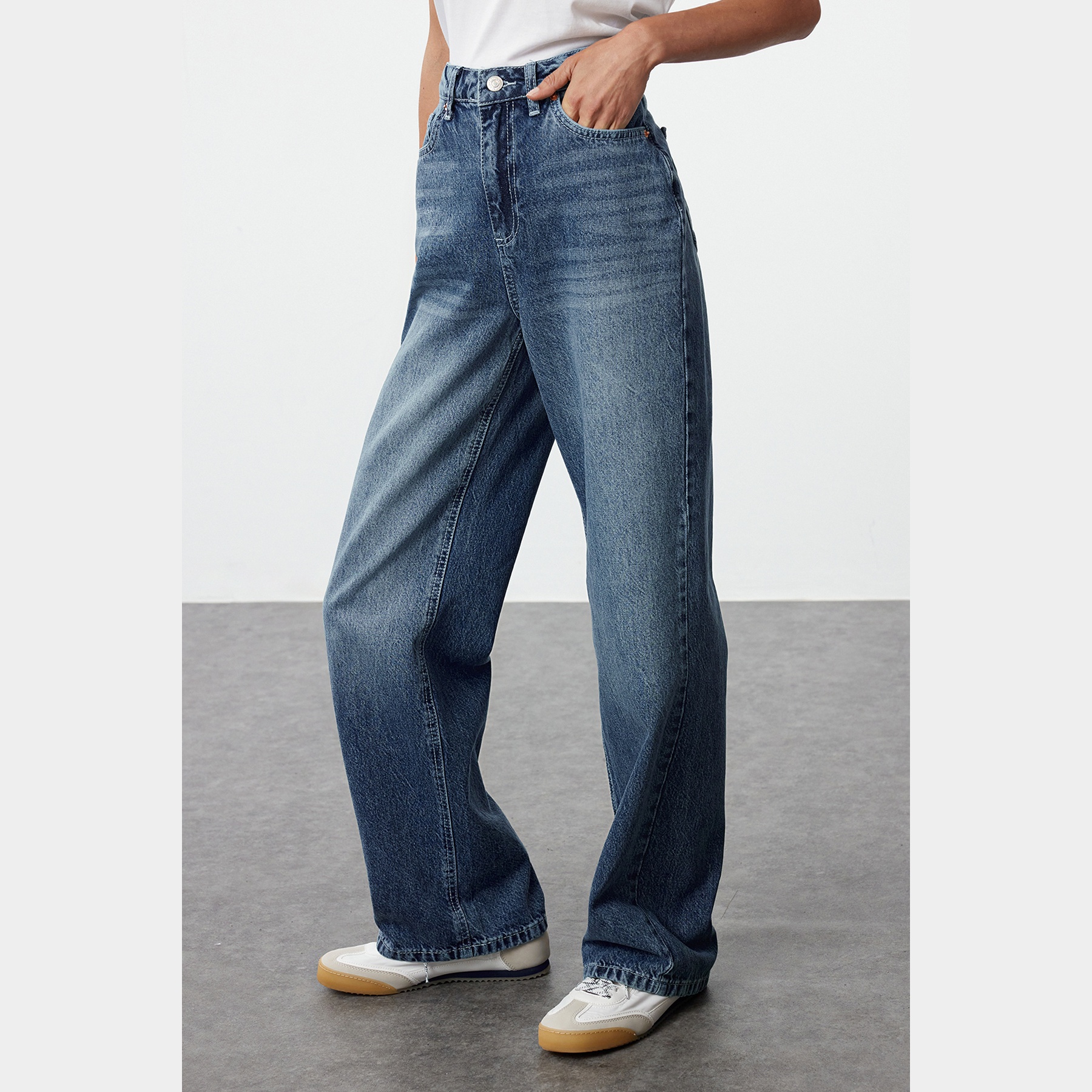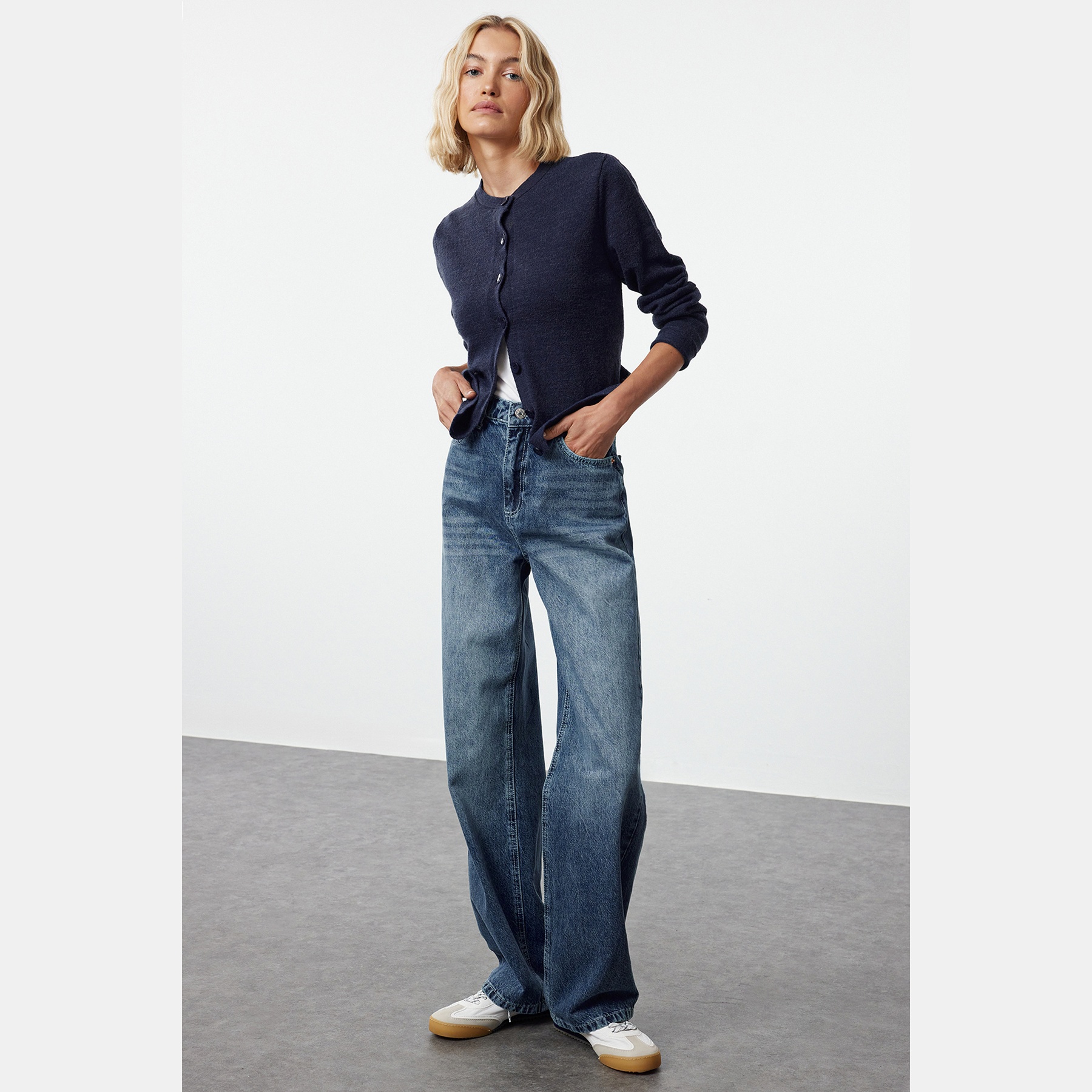 بنطال جينز نسائي بلون كُحلي، مصنوع من قماش دنيم طبيعي 100% قطن، يتميز بخصر مرتفع، قصة واسعة من الأسفل، مع إغلاق أمامي بزر وسحاب. تصميم عملي يمنحك إطلالة كاجوال أنيقة ومريحة تناسب جميع المواسم.