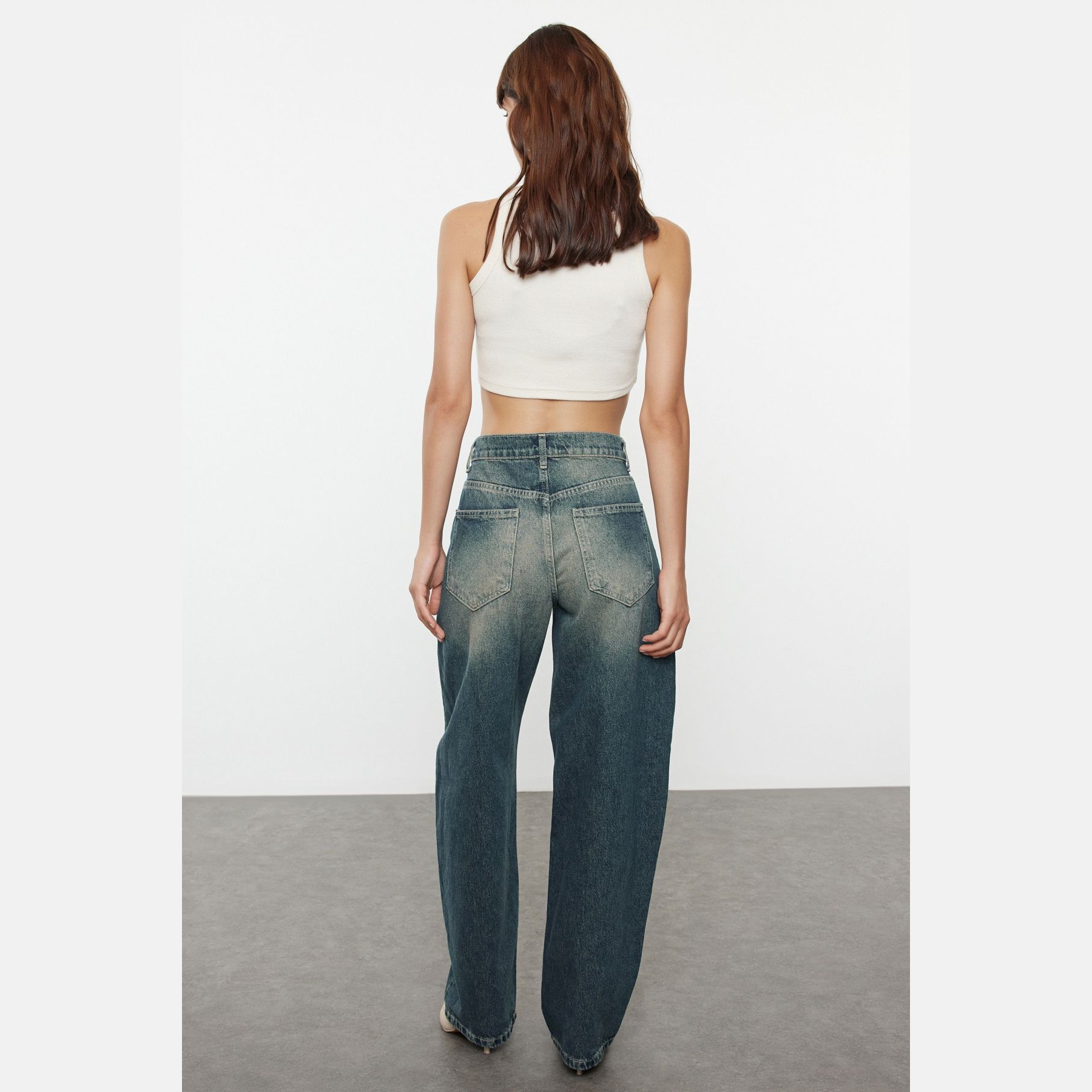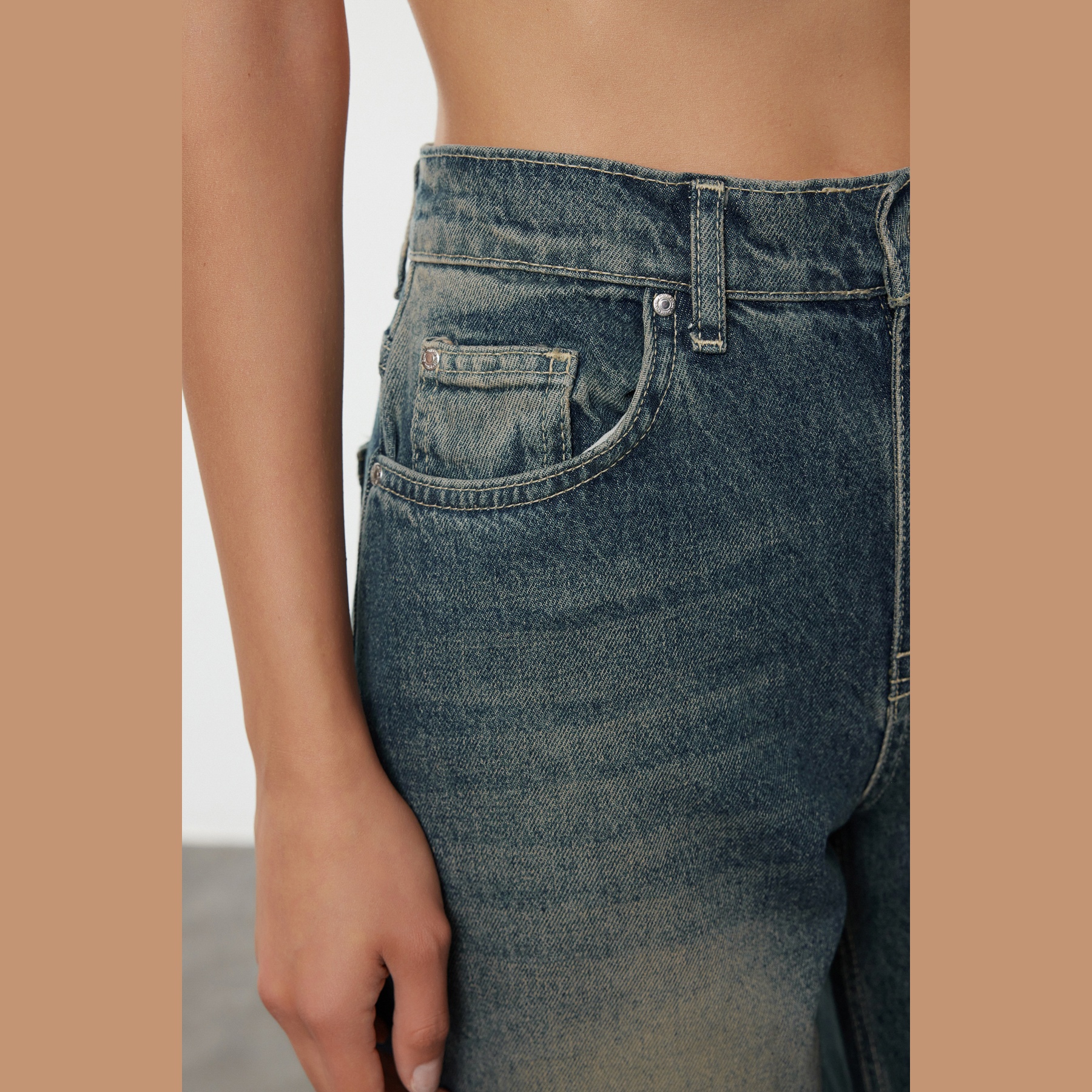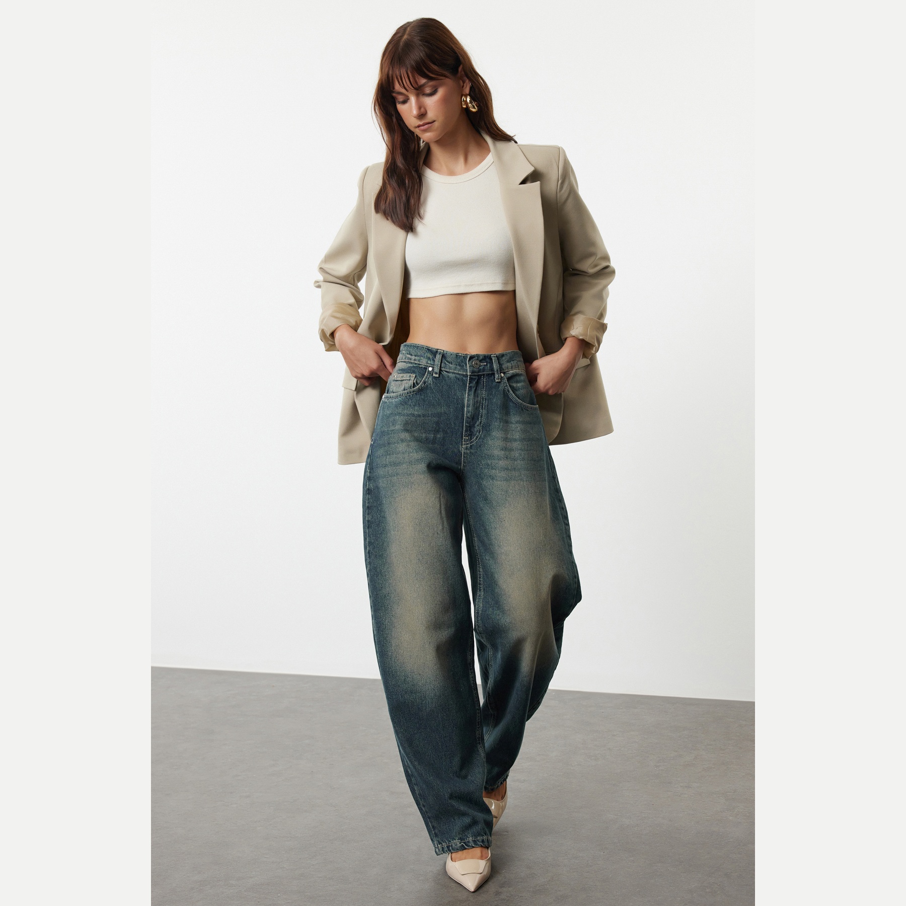 بنطال جينز نسائي بلون كُحلي داكن، من مجموعة More Sustainable، مصنوع من قماش دنيم طبيعي 100% قطن، يتميز بخصر عادي، قصة Baggy فضفاضة ومريحة، مع إغلاق أمامي بزر وسحاب. تصميم عملي يمنحك إطلالة شبابية مريحة بلمسة مسؤولة تجاه البيئة.