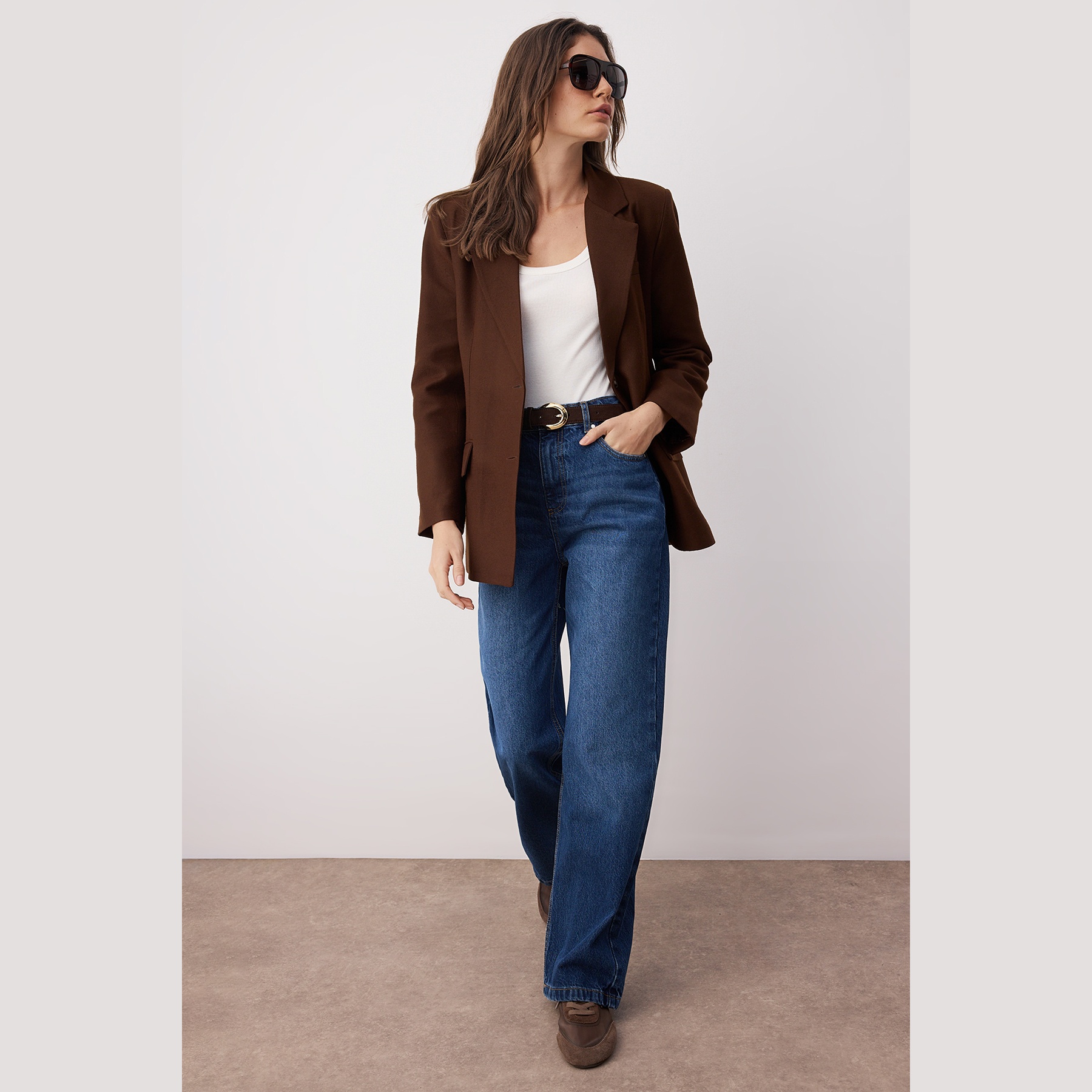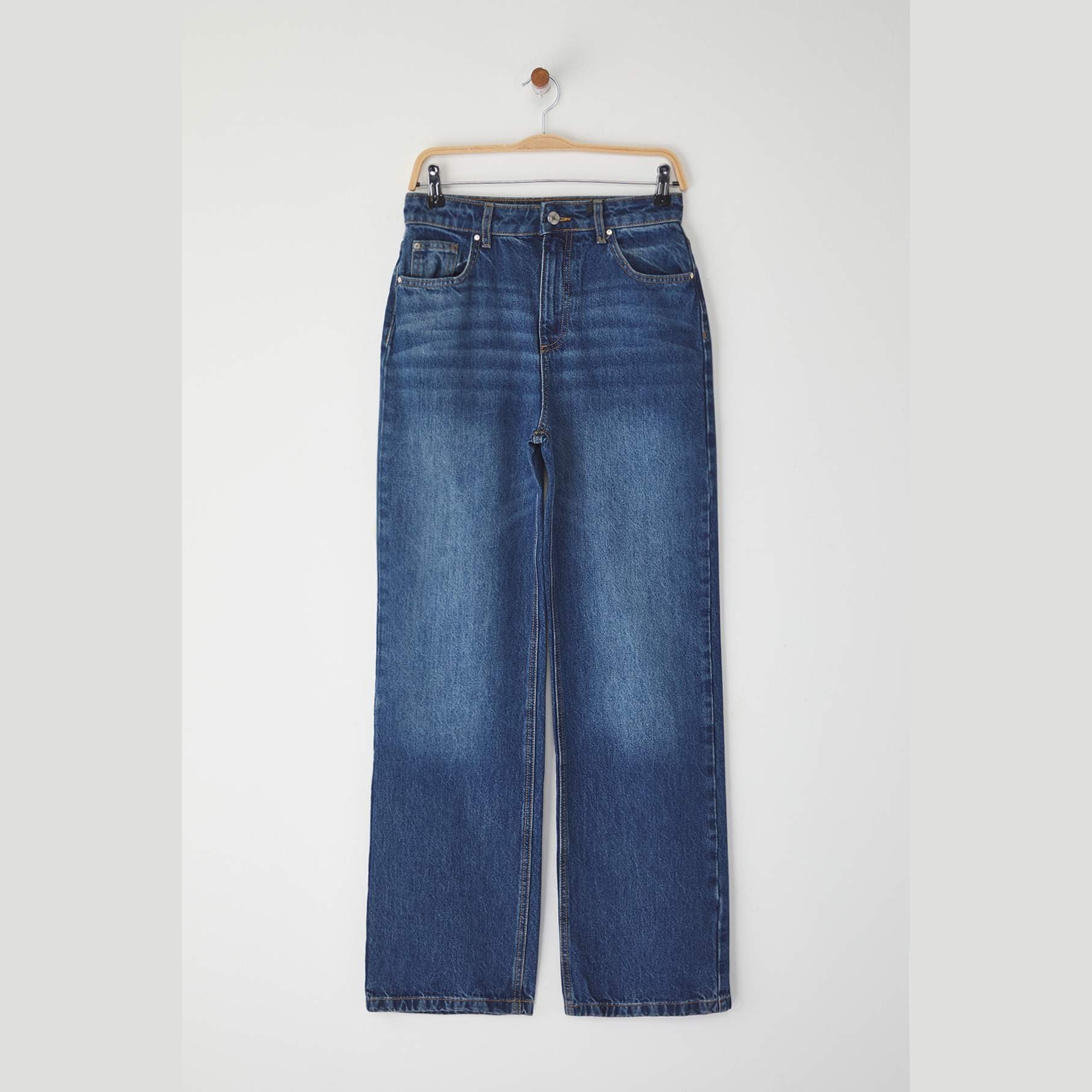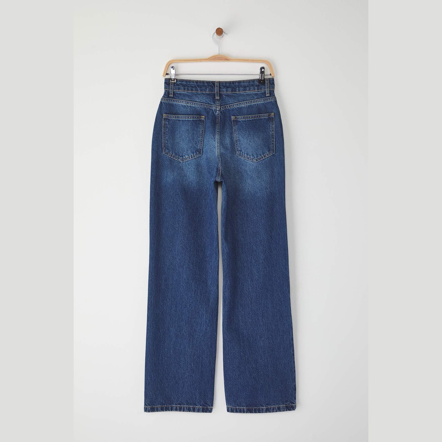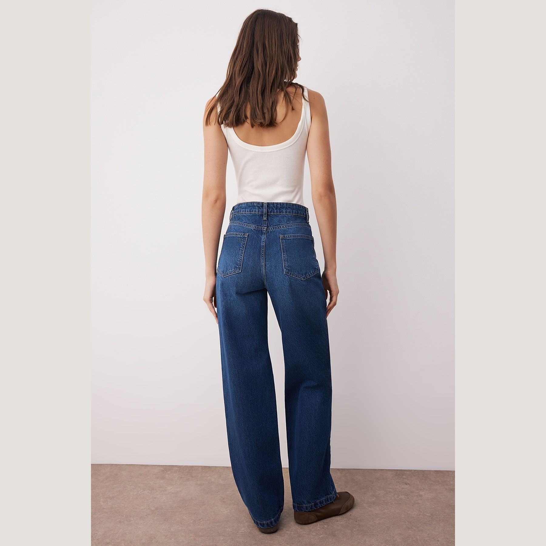 بنطال جينز نسائي بلون كُحلي داكن، مصنوع من قماش دنيم طبيعي 100% قطن، يتميز بخصر مرتفع، قصة واسعة من الأسفل، مع إغلاق أمامي بزر وسحاب. تصميم عملي يمنحك إطلالة كاجوال أنيقة ومريحة تناسب جميع المواسم.