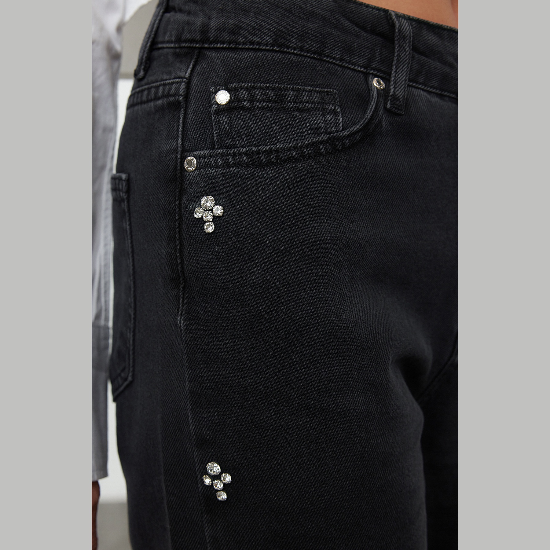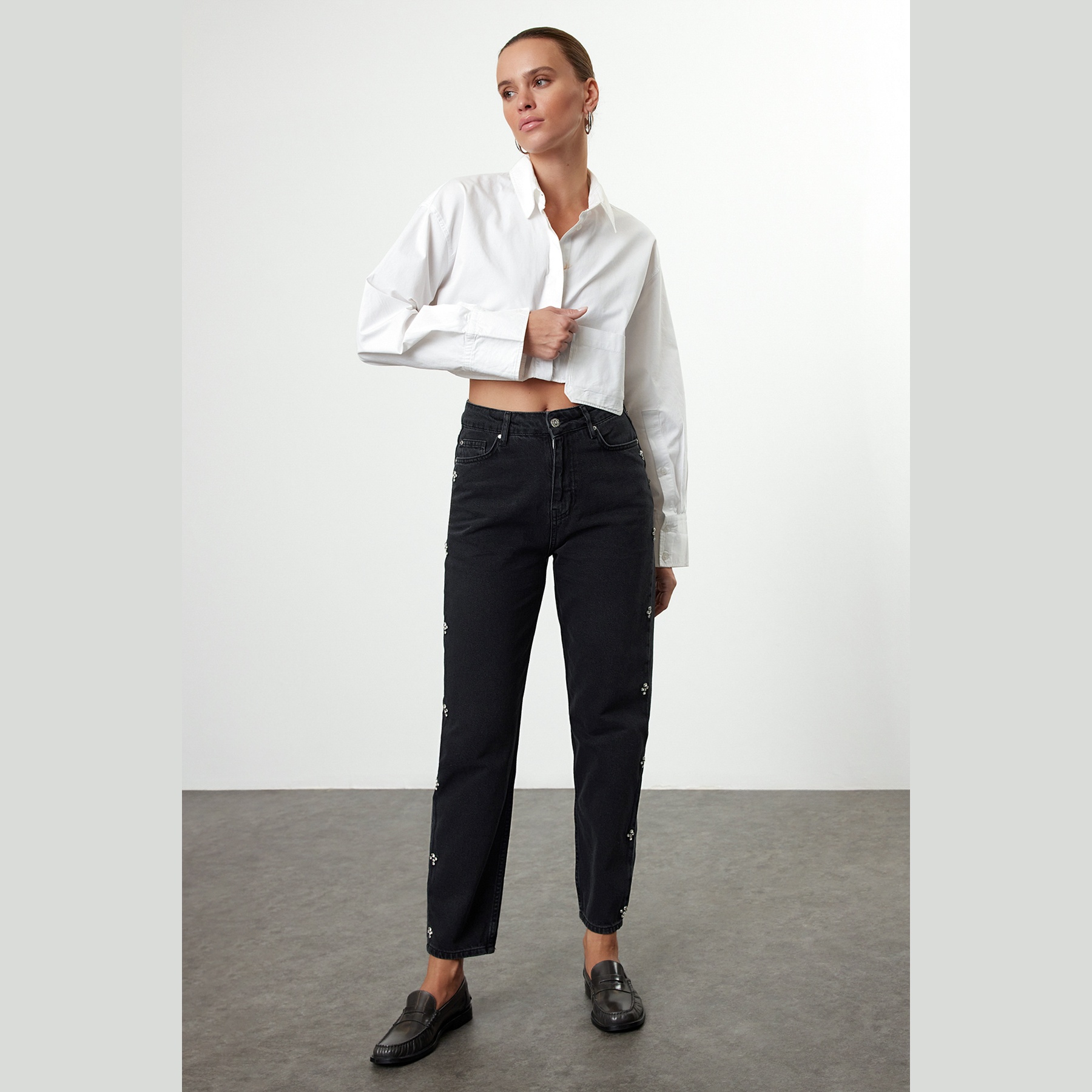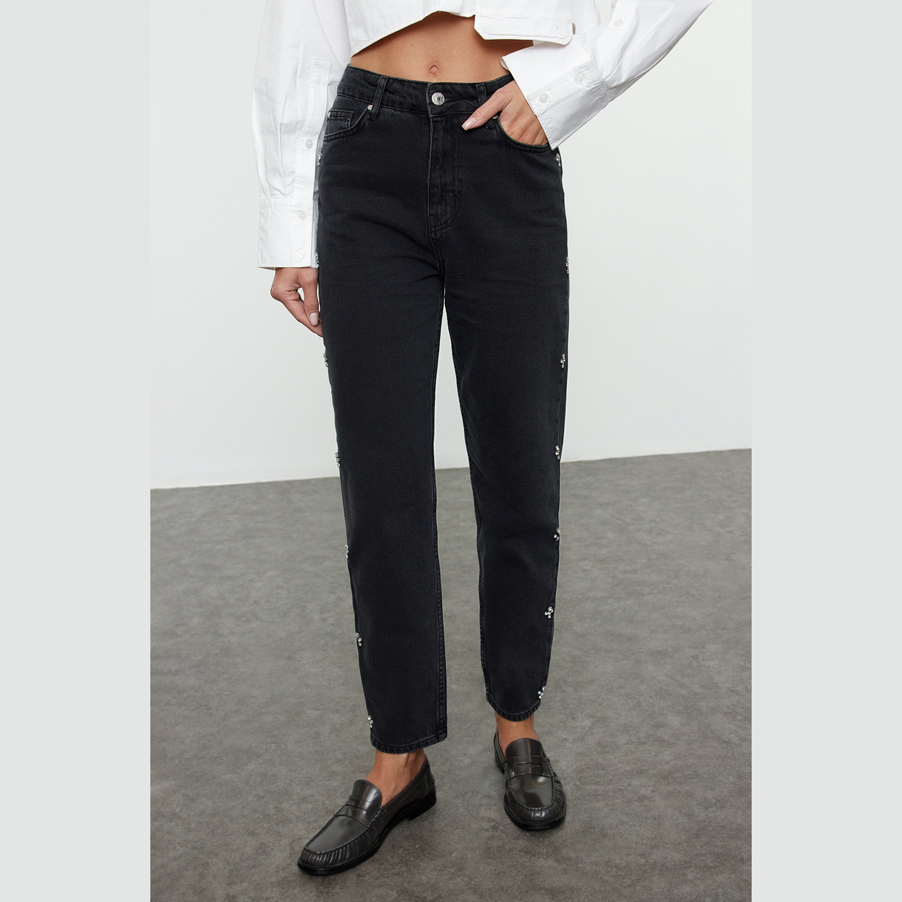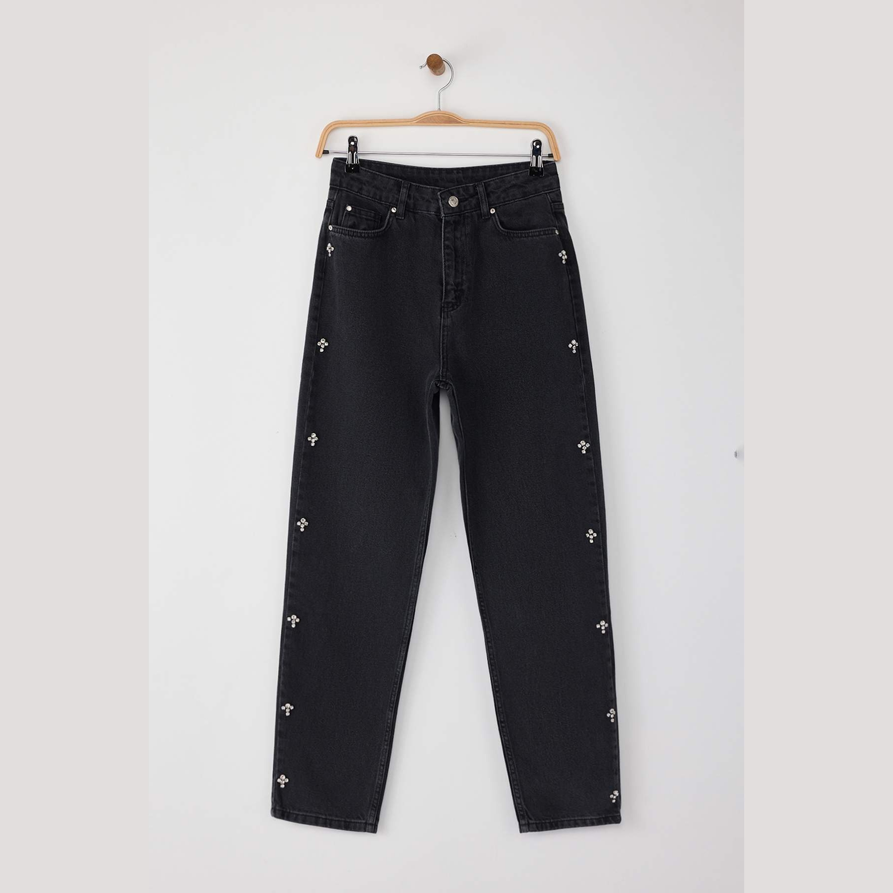 جينز نسائي – أسود بخصر مرتفع وتفاصيل حجرية لامعة وقصة Mom