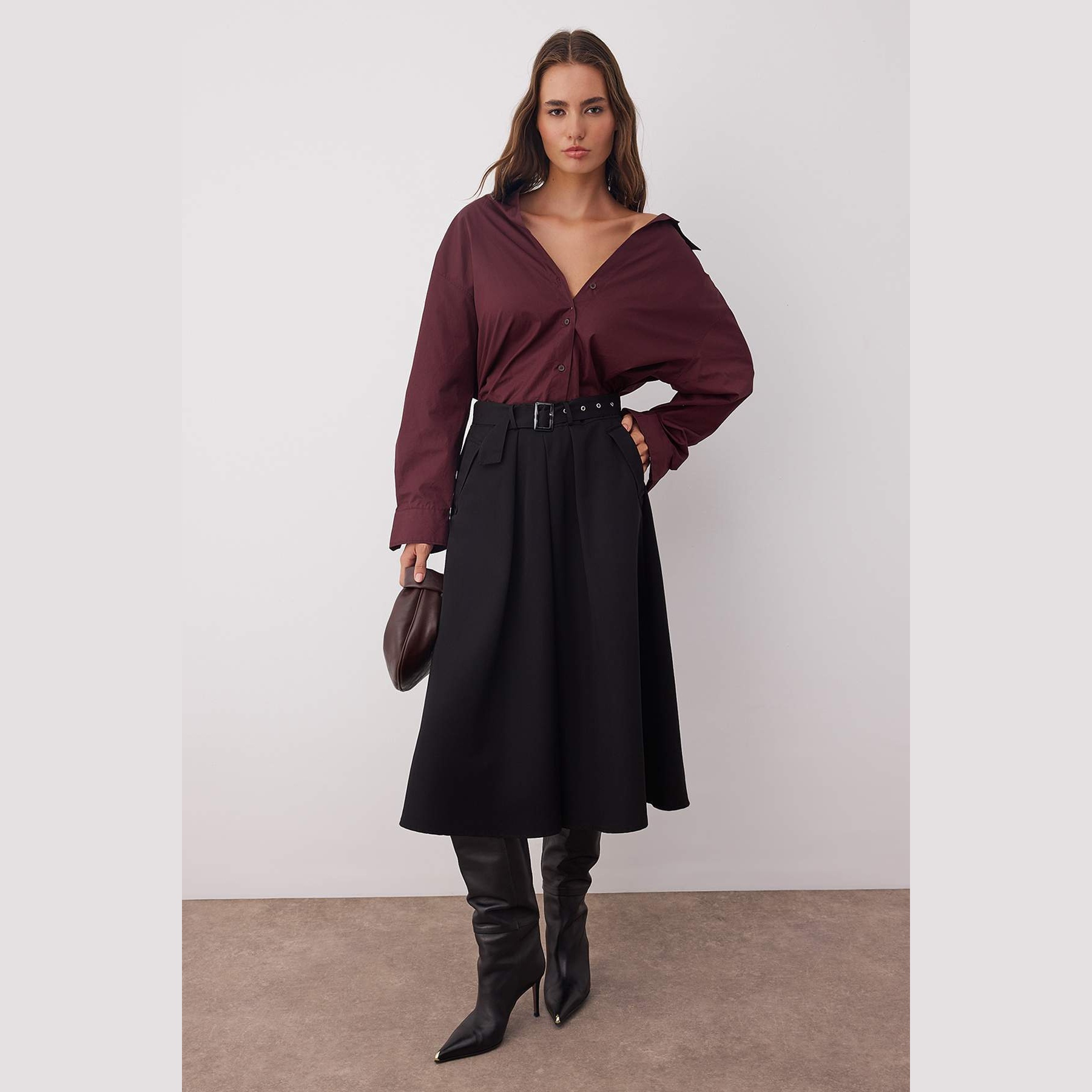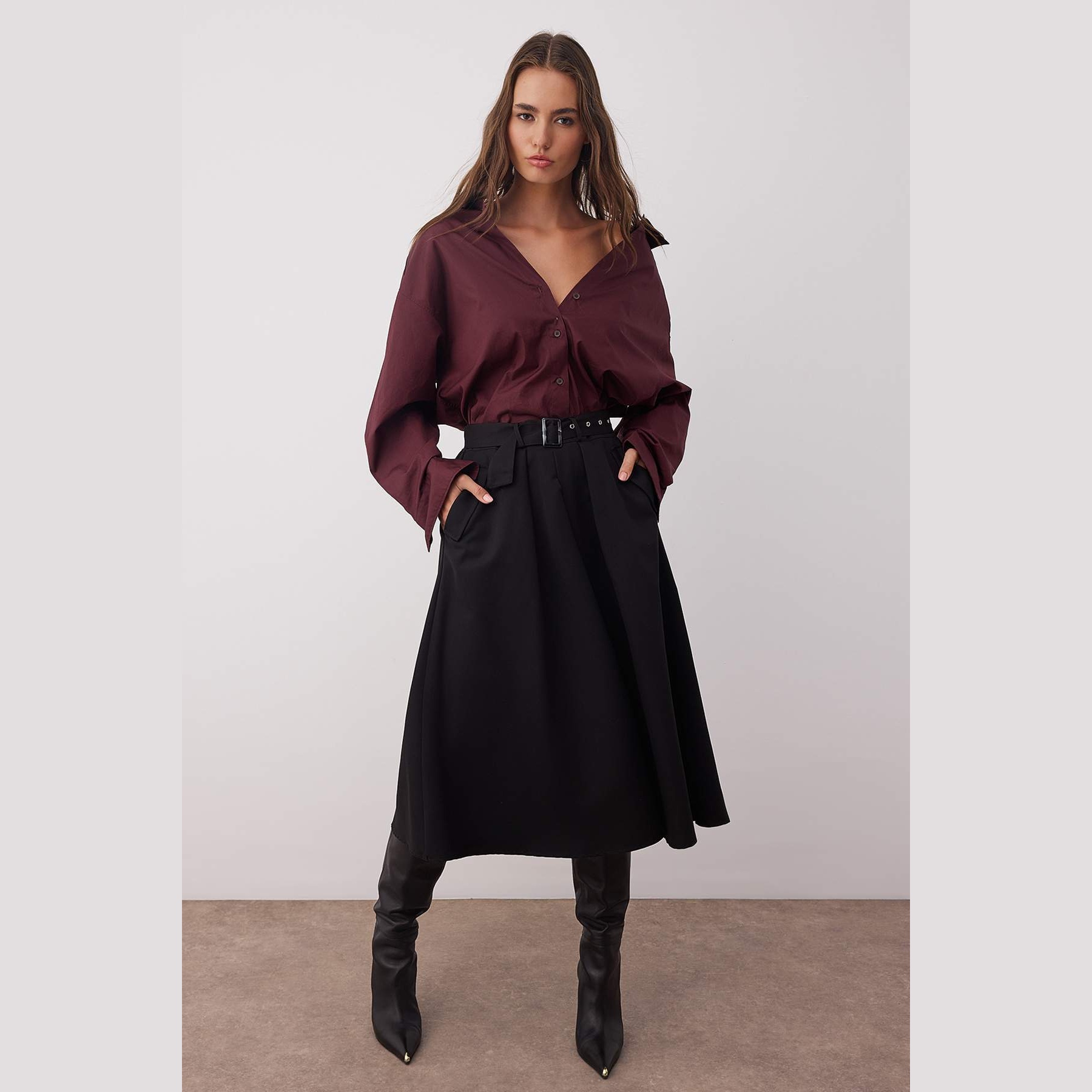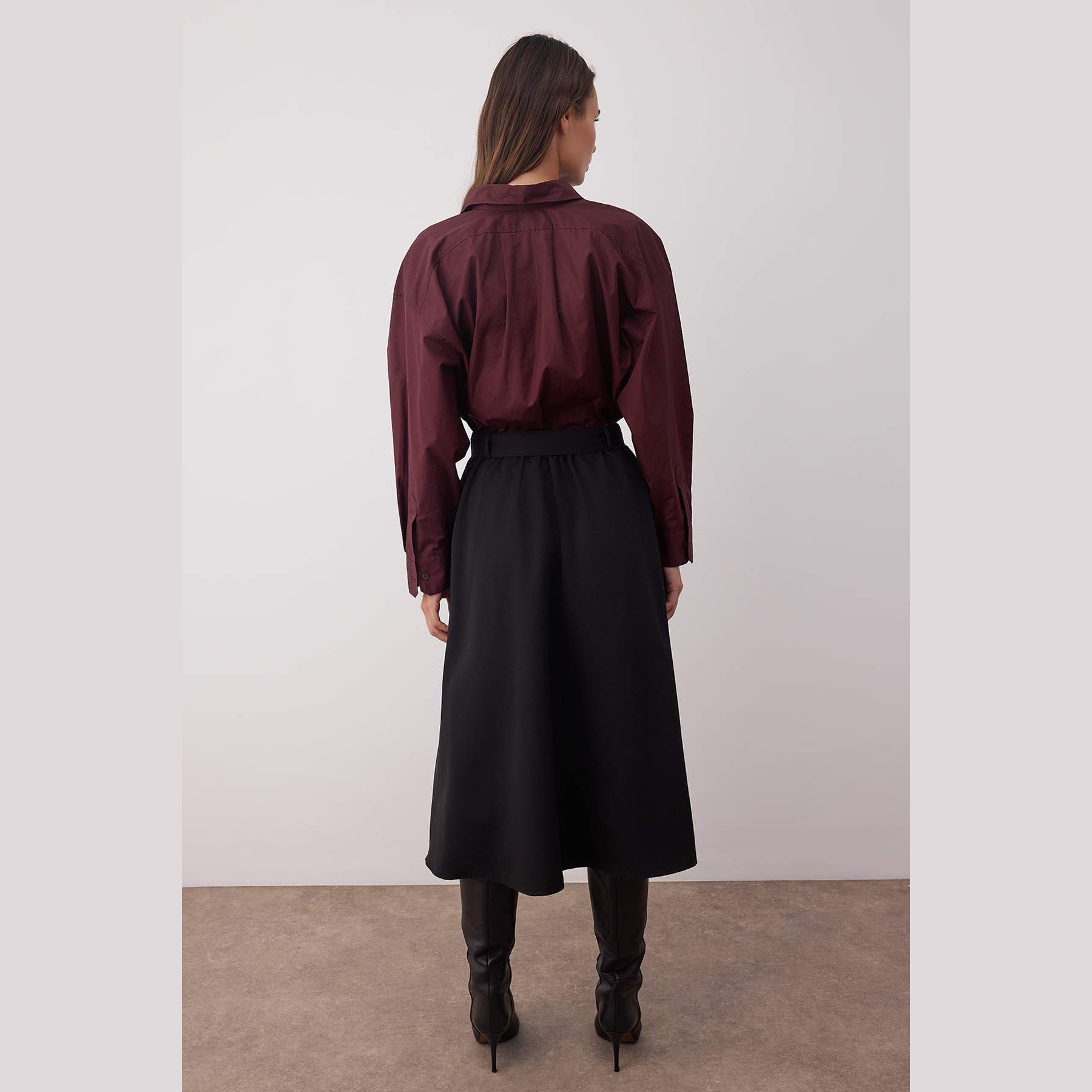 تنورة نسائية – سوداء بخصر مرتفع، حزام قابل للإزالة وقصة كلوش متوسطة الطول (Midi Kloş)