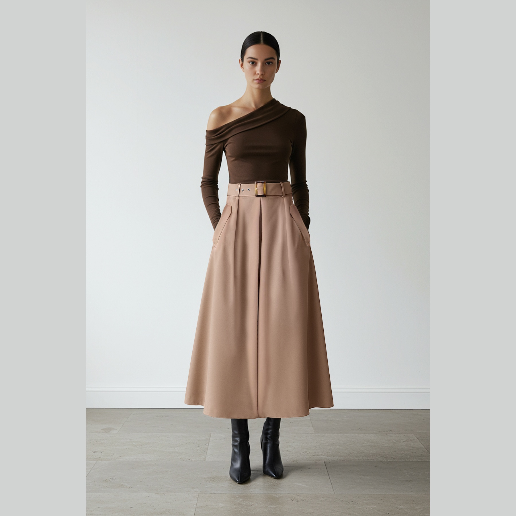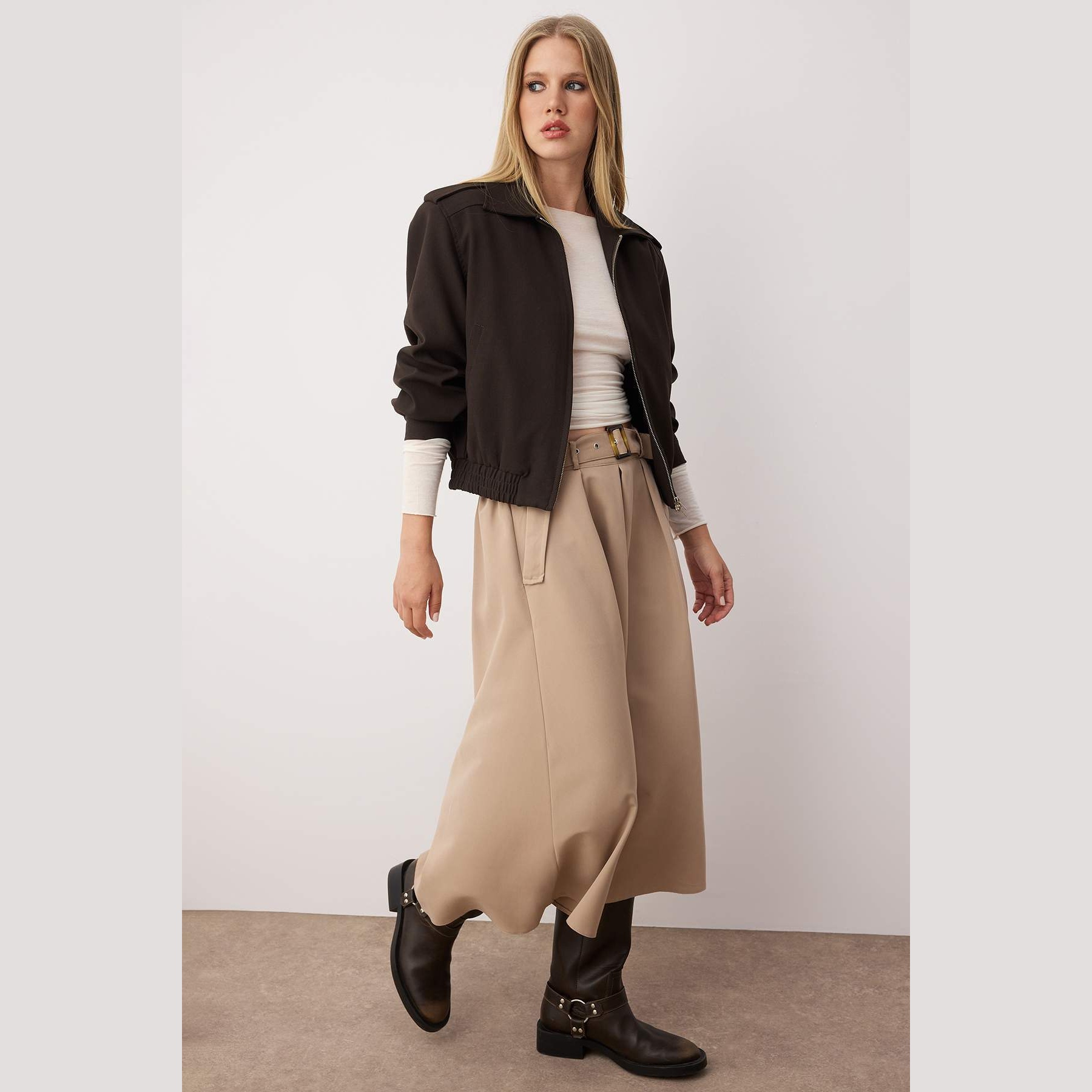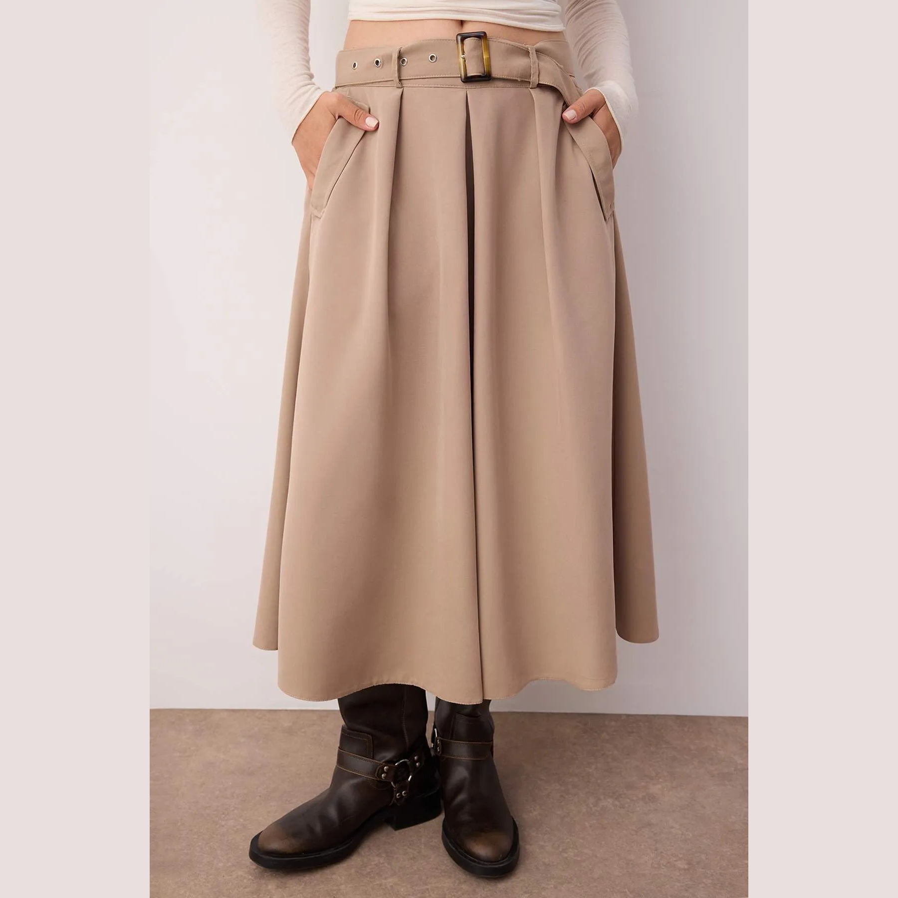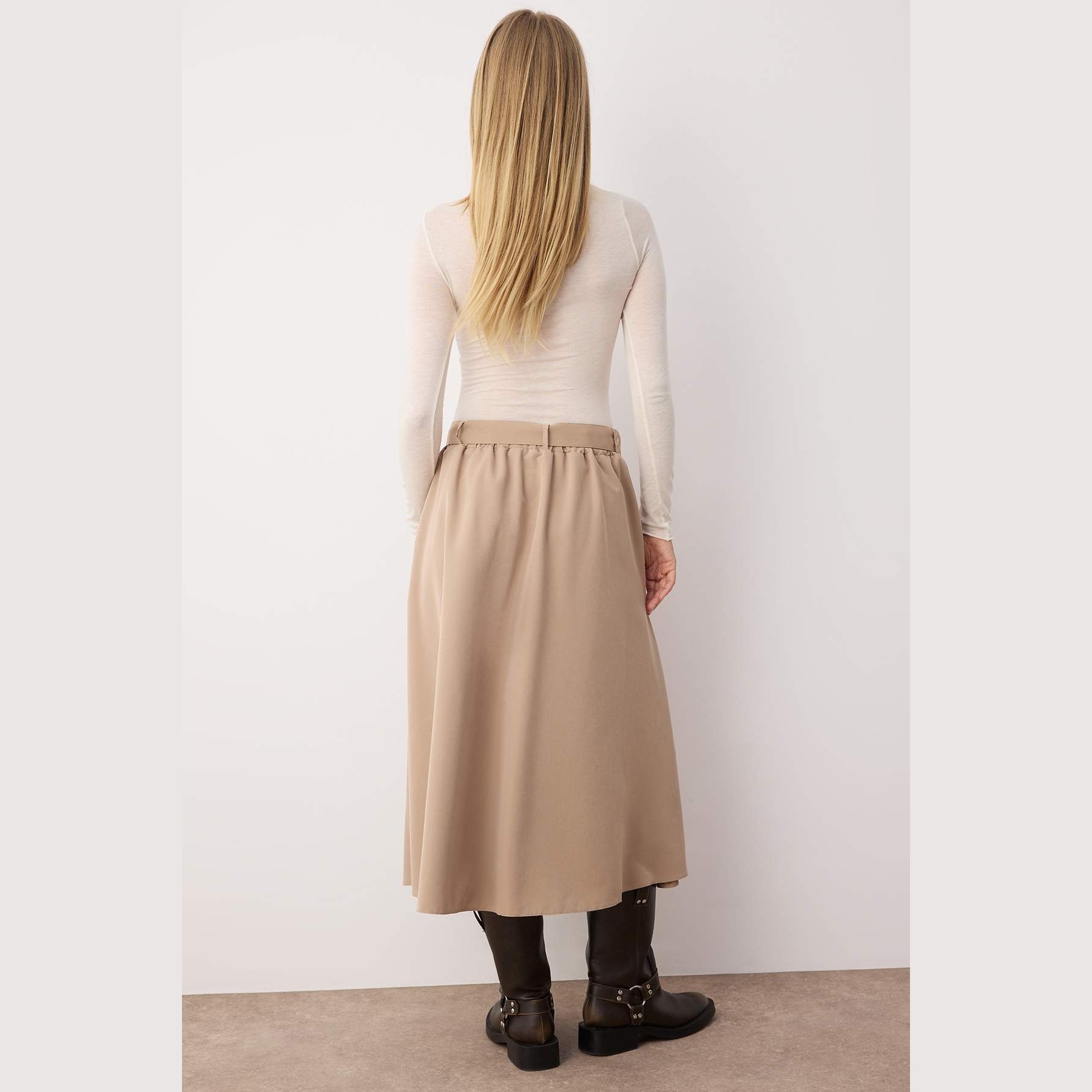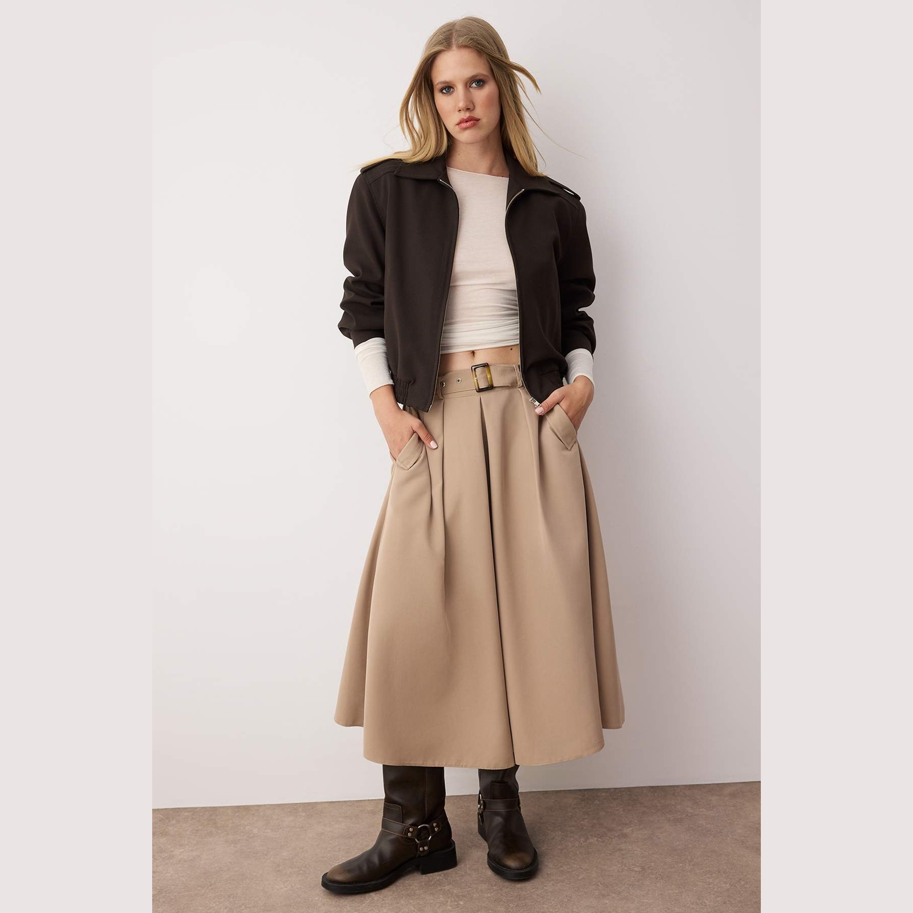 تنورة نسائية – بيج بخصر مرتفع، حزام قابل للإزالة وقصة كلوش متوسطة الطول (Midi Kloş)
