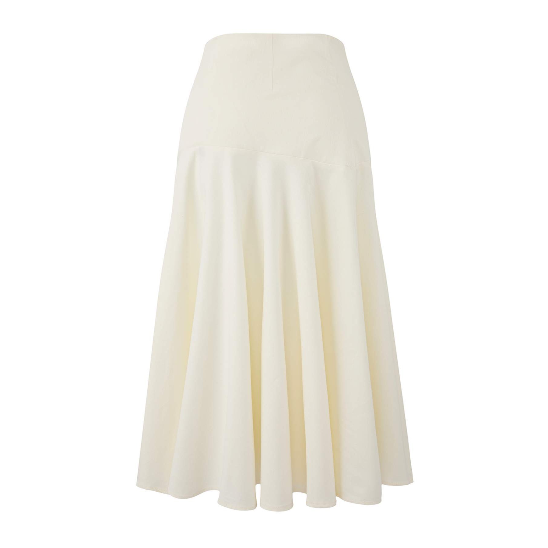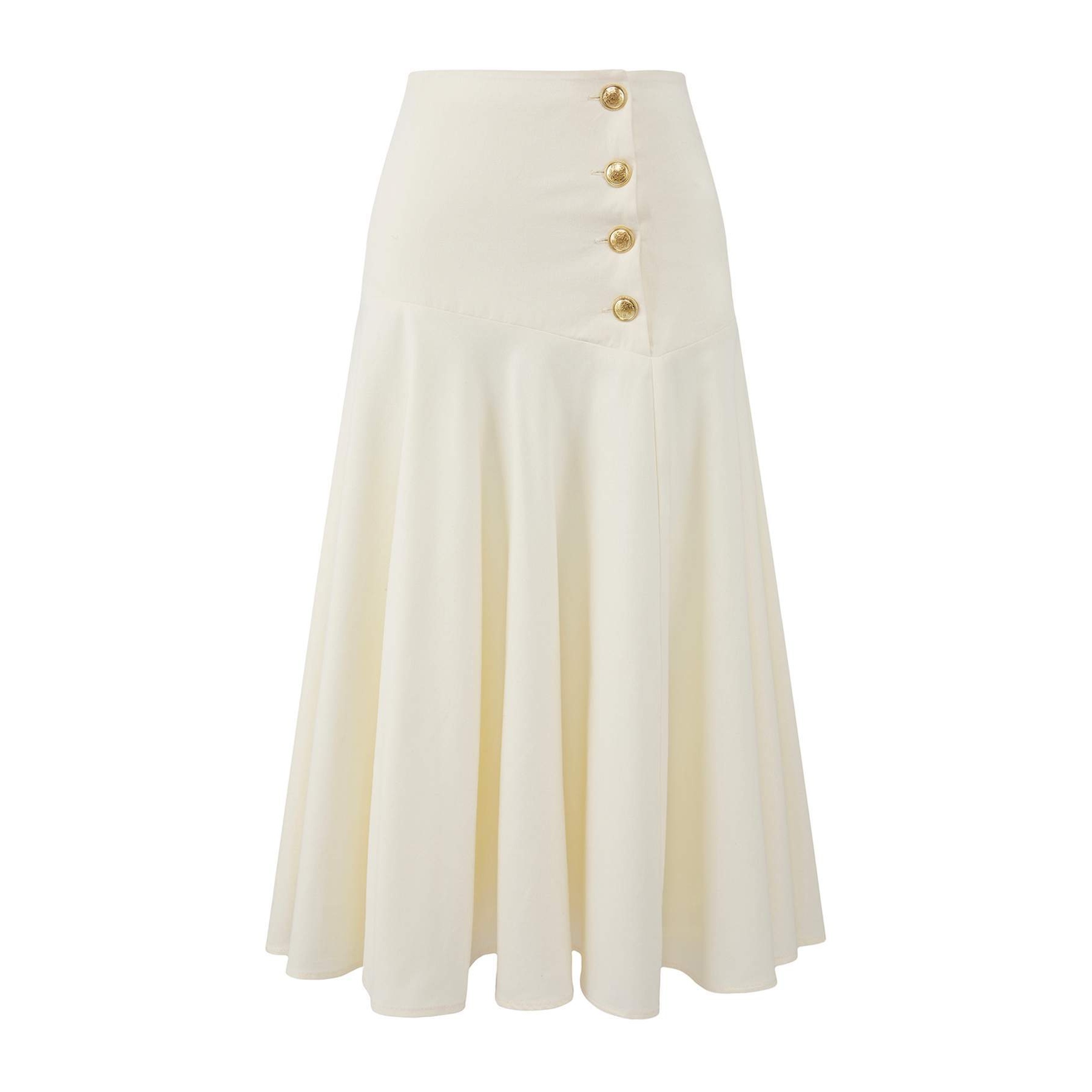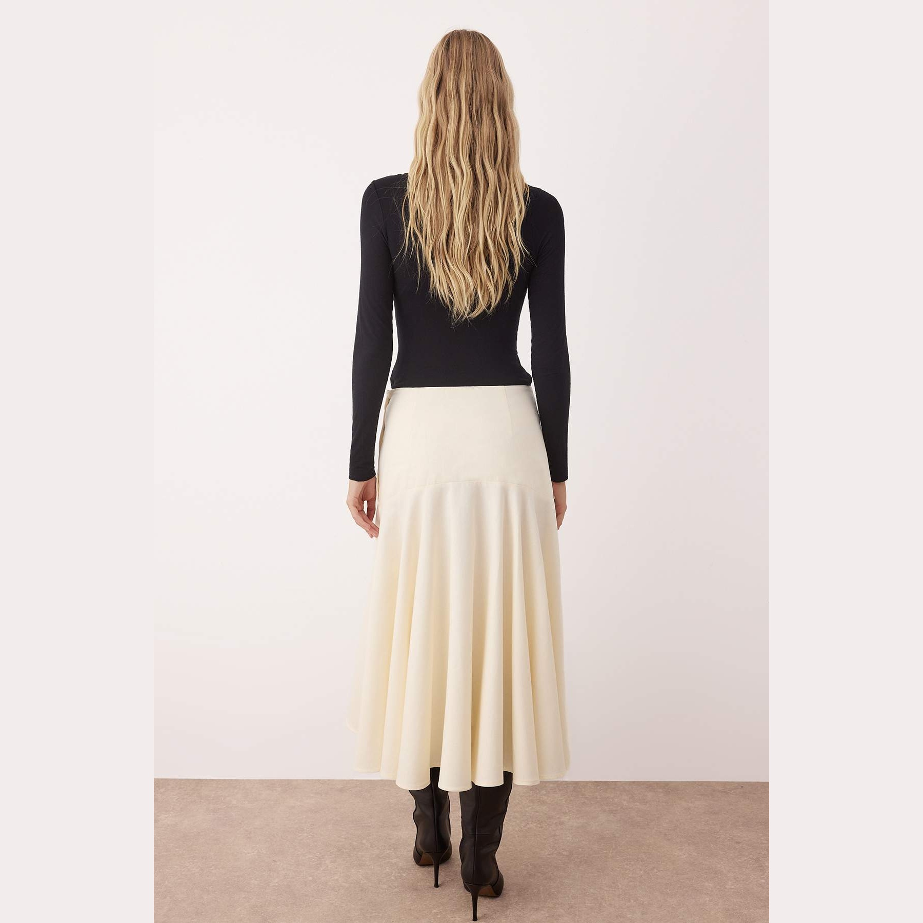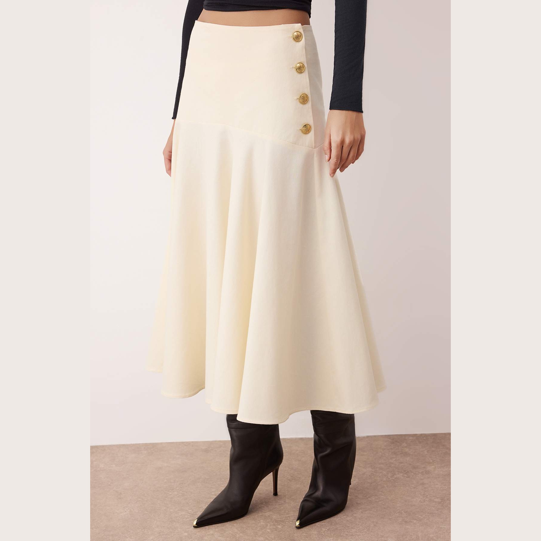 تنورة نسائية – بيج بخصر مرتفع، أزرار أمامية وقصة كلوش متوسطة الطول (Midi Kloş)