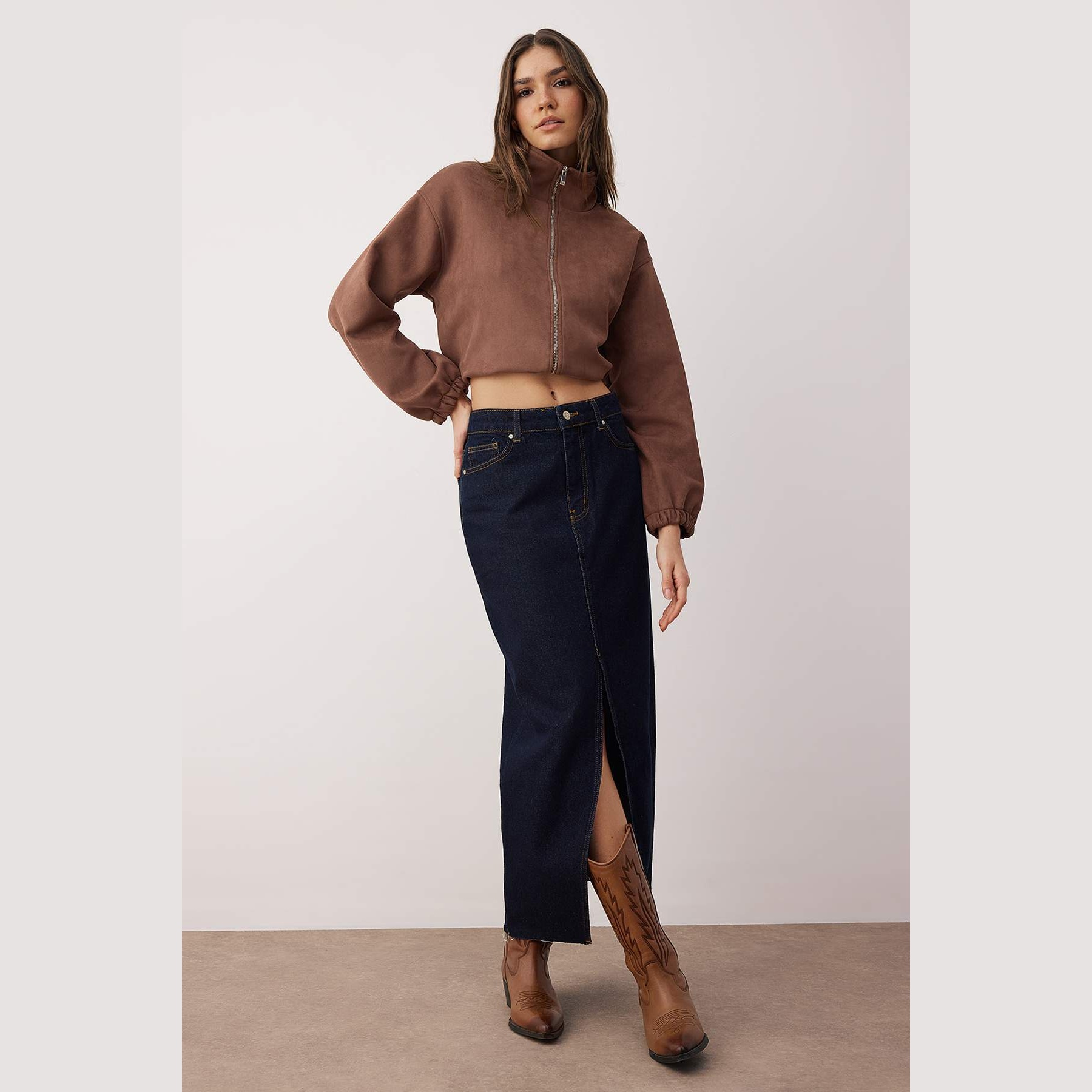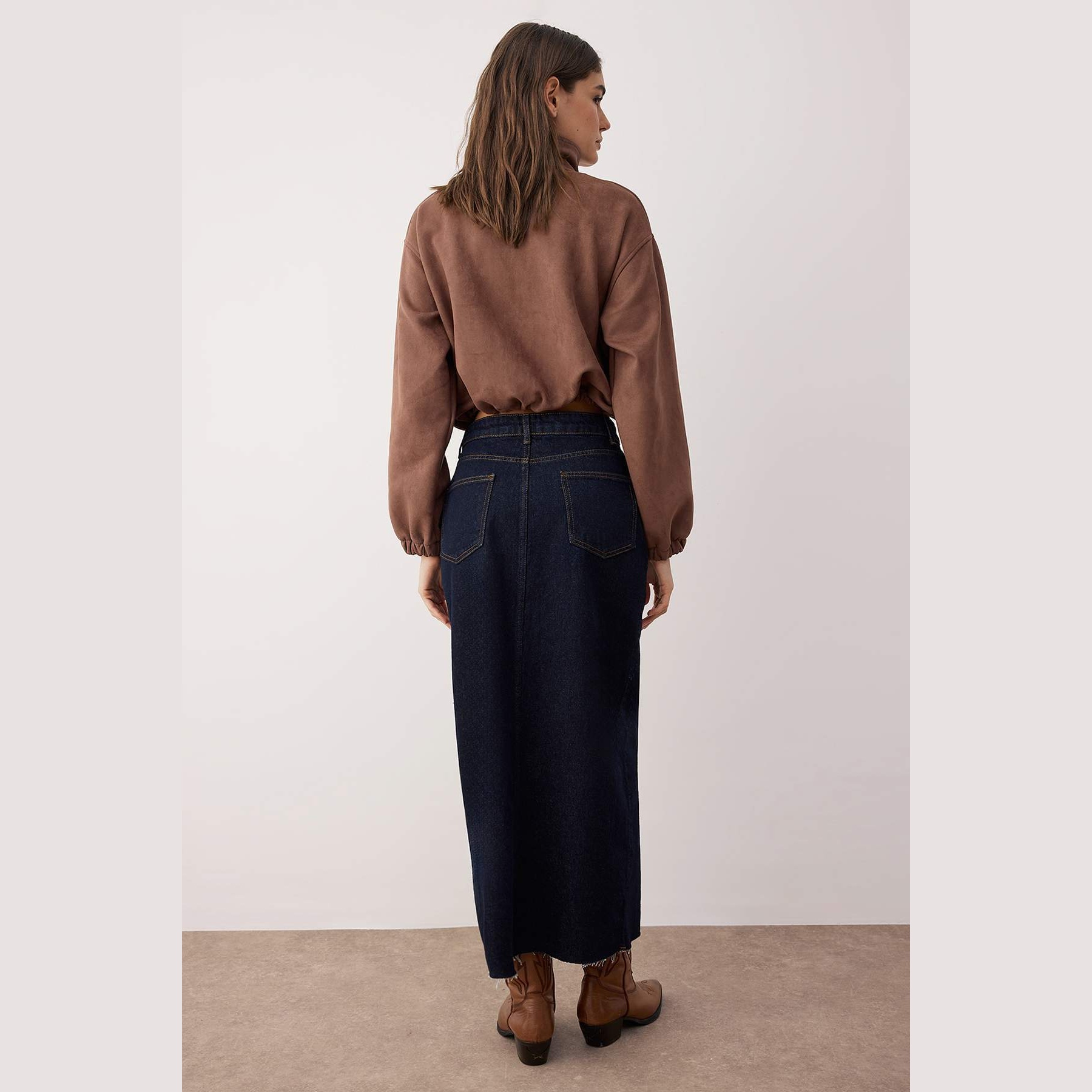 تنورة دنيم طويلة بلون كُحلي داكن، من مجموعة More Sustainable، مصنوعة من قماش دنيم طبيعي 100% قطن، تتميز بقصة A-Line مستقيمة، خصر مرتفع، وفتحة جانبية بطول 48 سم تضيف لمسة أنثوية أنيقة، مع إغلاق خلفي بسحاب. تصميم عملي وأنيق يناسب الإطلالات اليومية والمحتشمة.