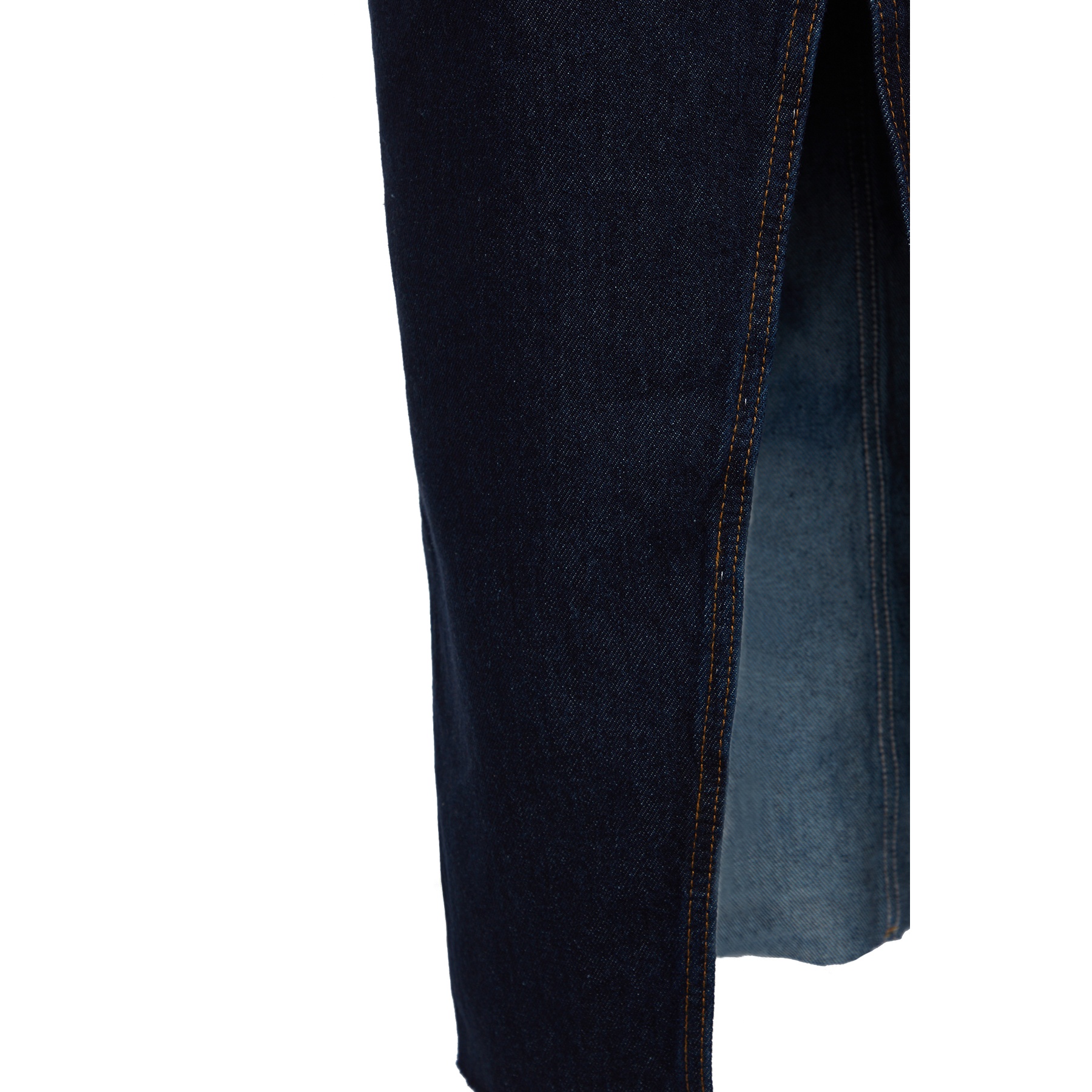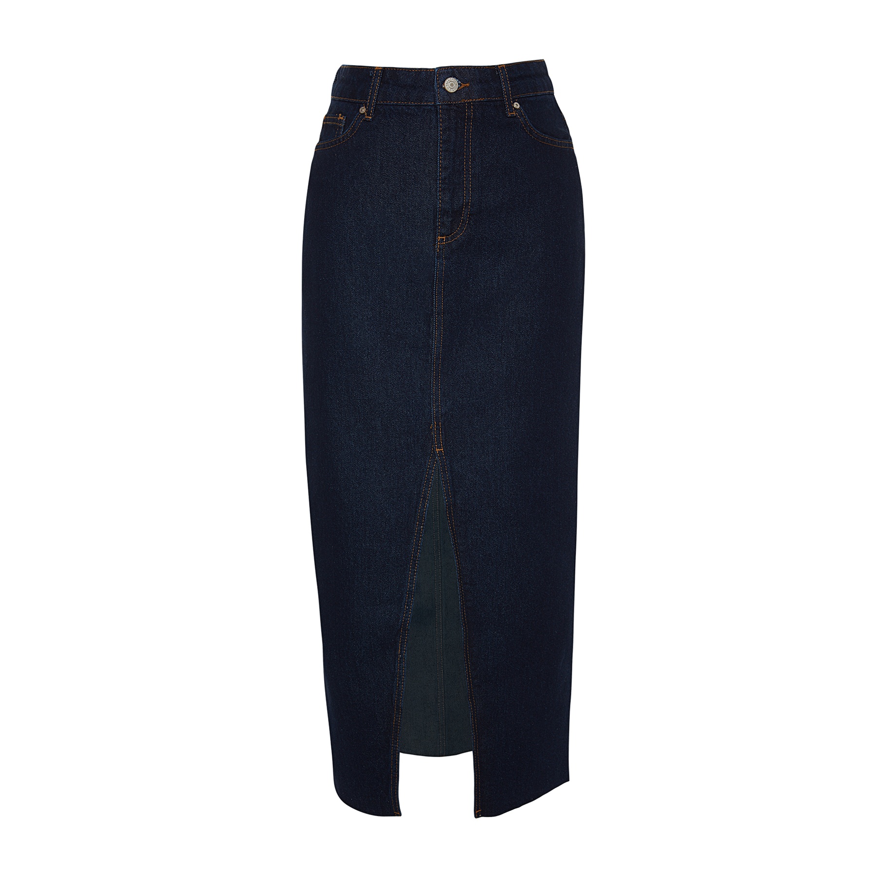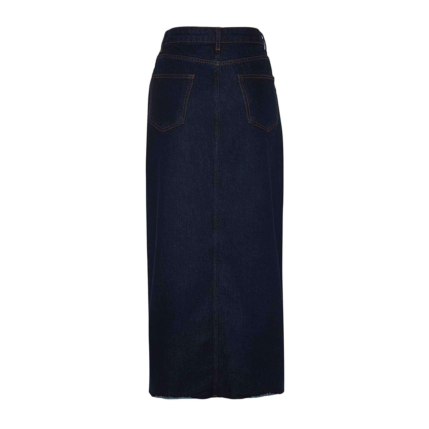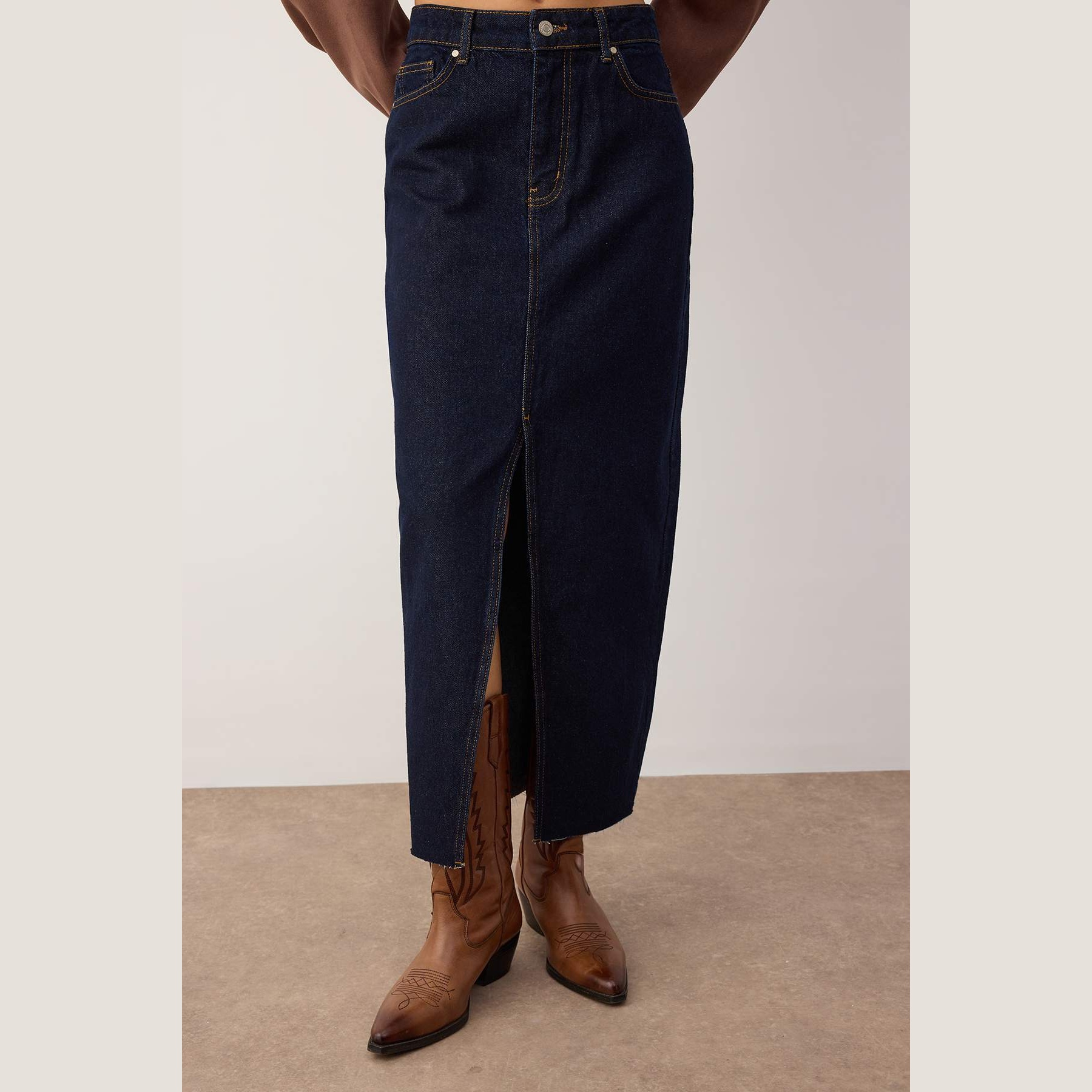 تنورة دنيم نسائية مستدامة – كُحلي داكن بخصر مرتفع وفتحة جانبية طويلة (Maxi A-Line)