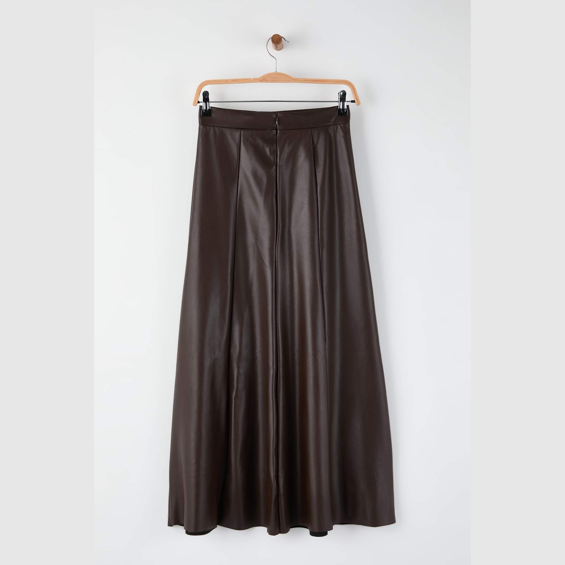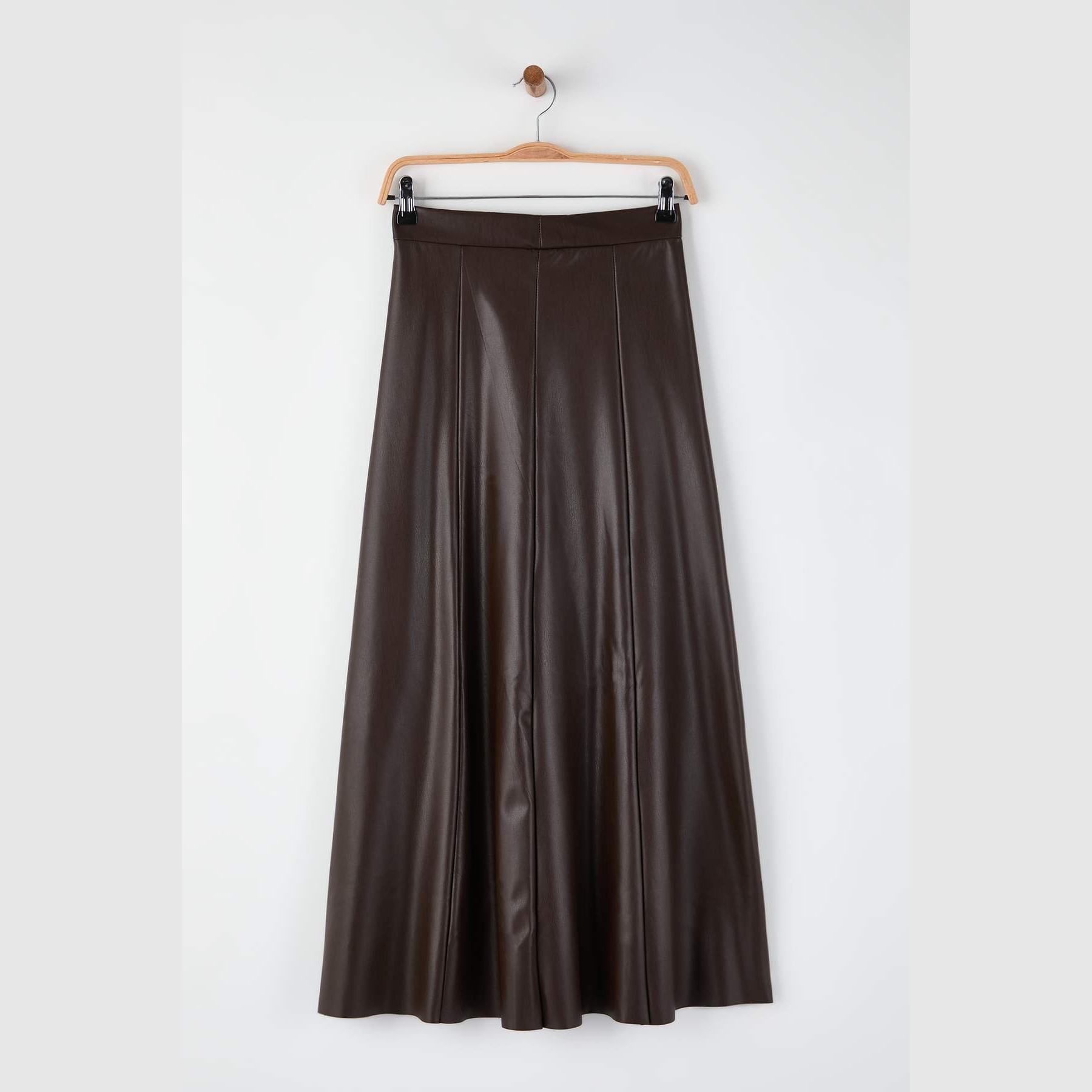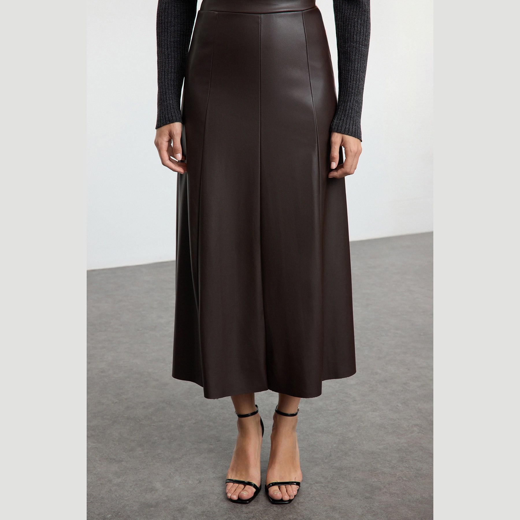 تنورة نسائية – كافيه غامق بخصر مرتفع، جلد صناعي وقصة مستقيمة طويلة (Maxi A-Line)