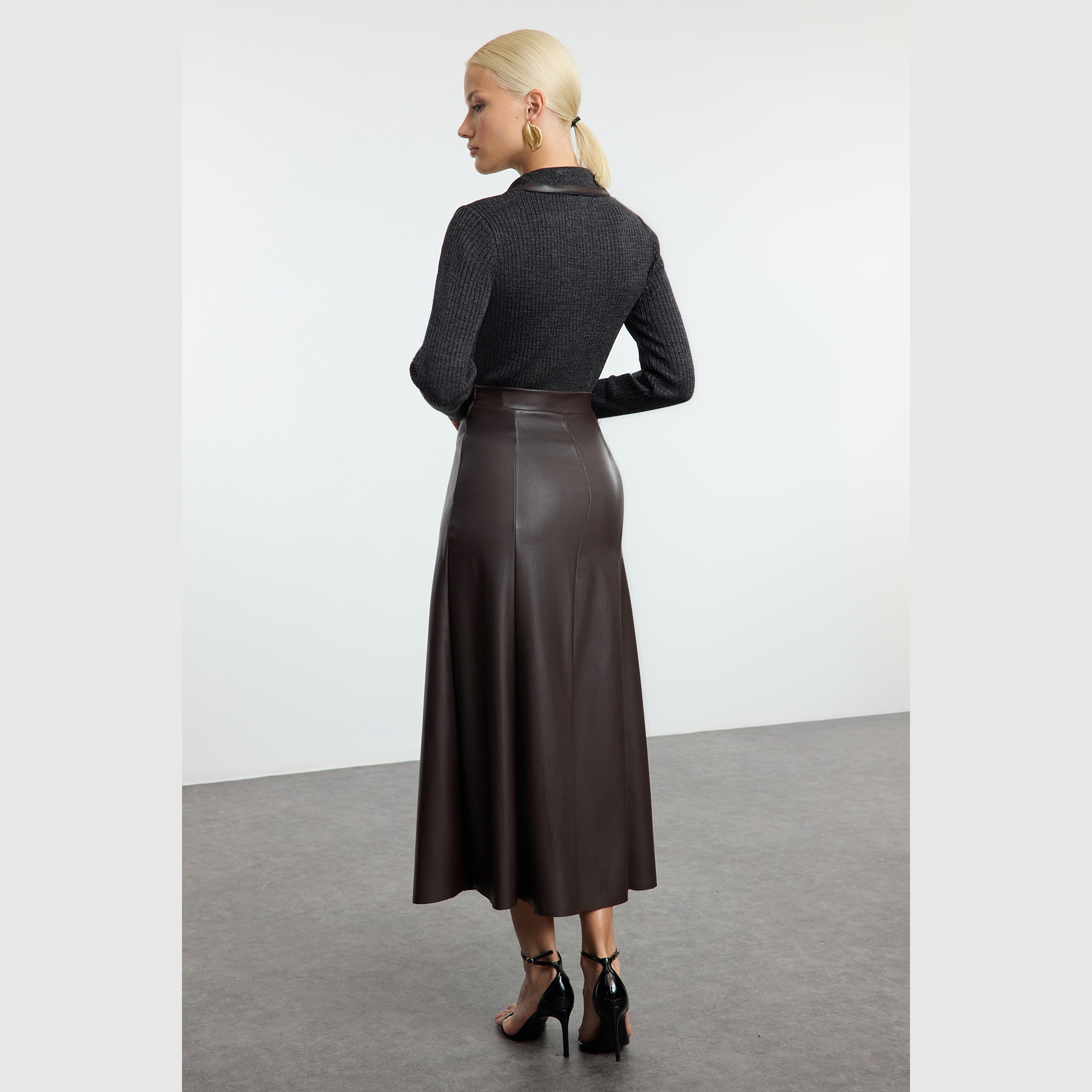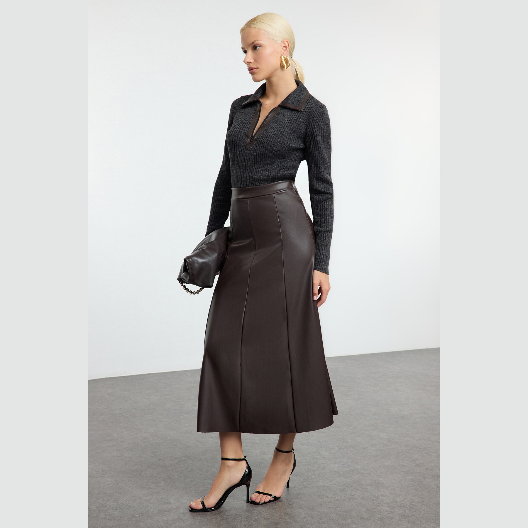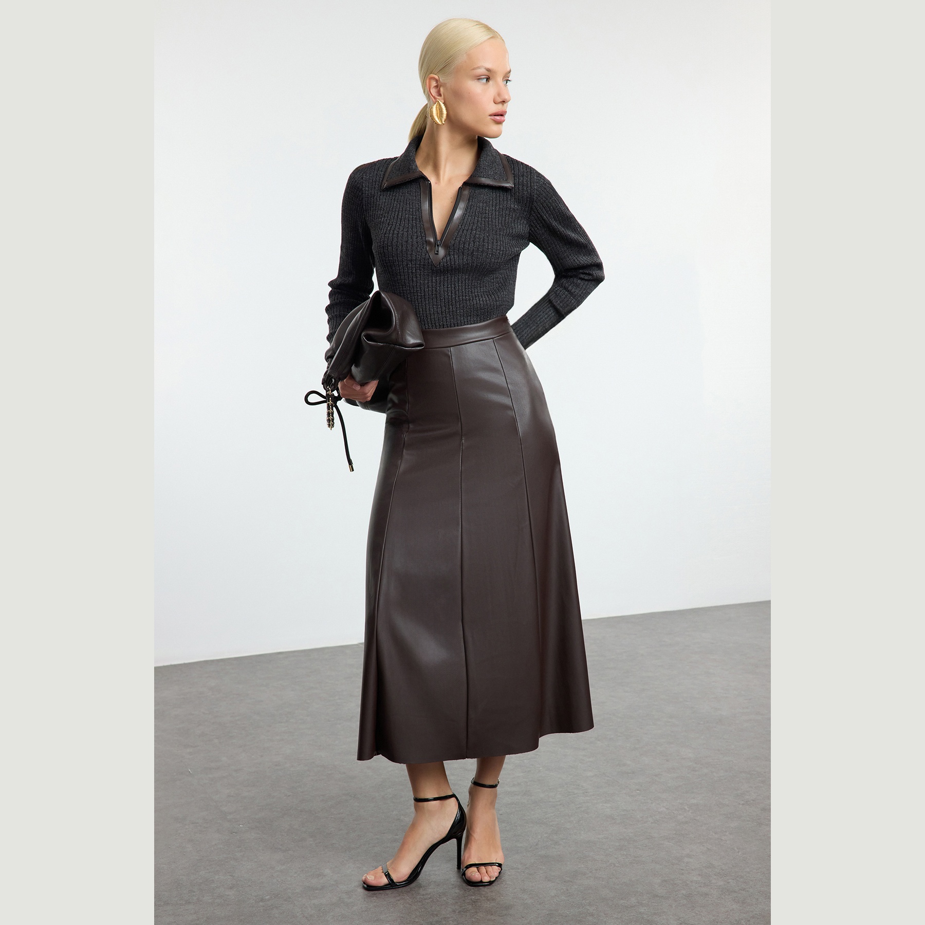 تنورة نسائية – كافيه غامق بخصر مرتفع، جلد صناعي وقصة مستقيمة طويلة (Maxi A-Line)