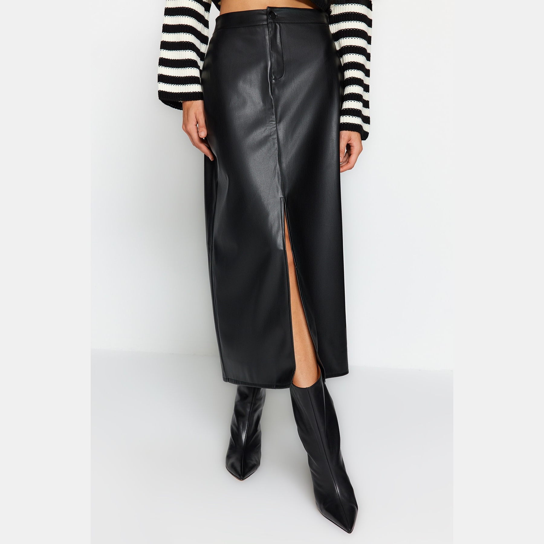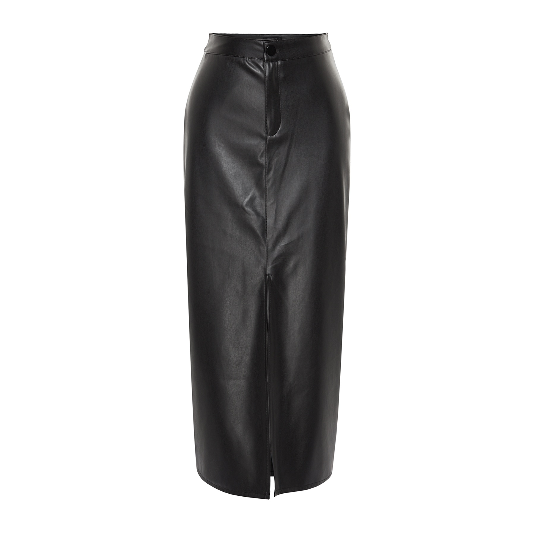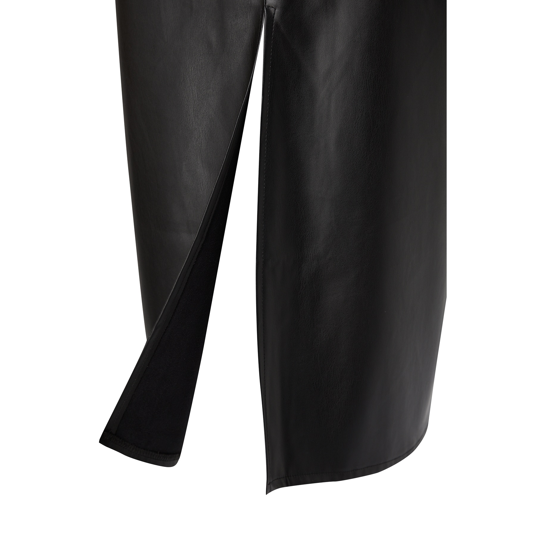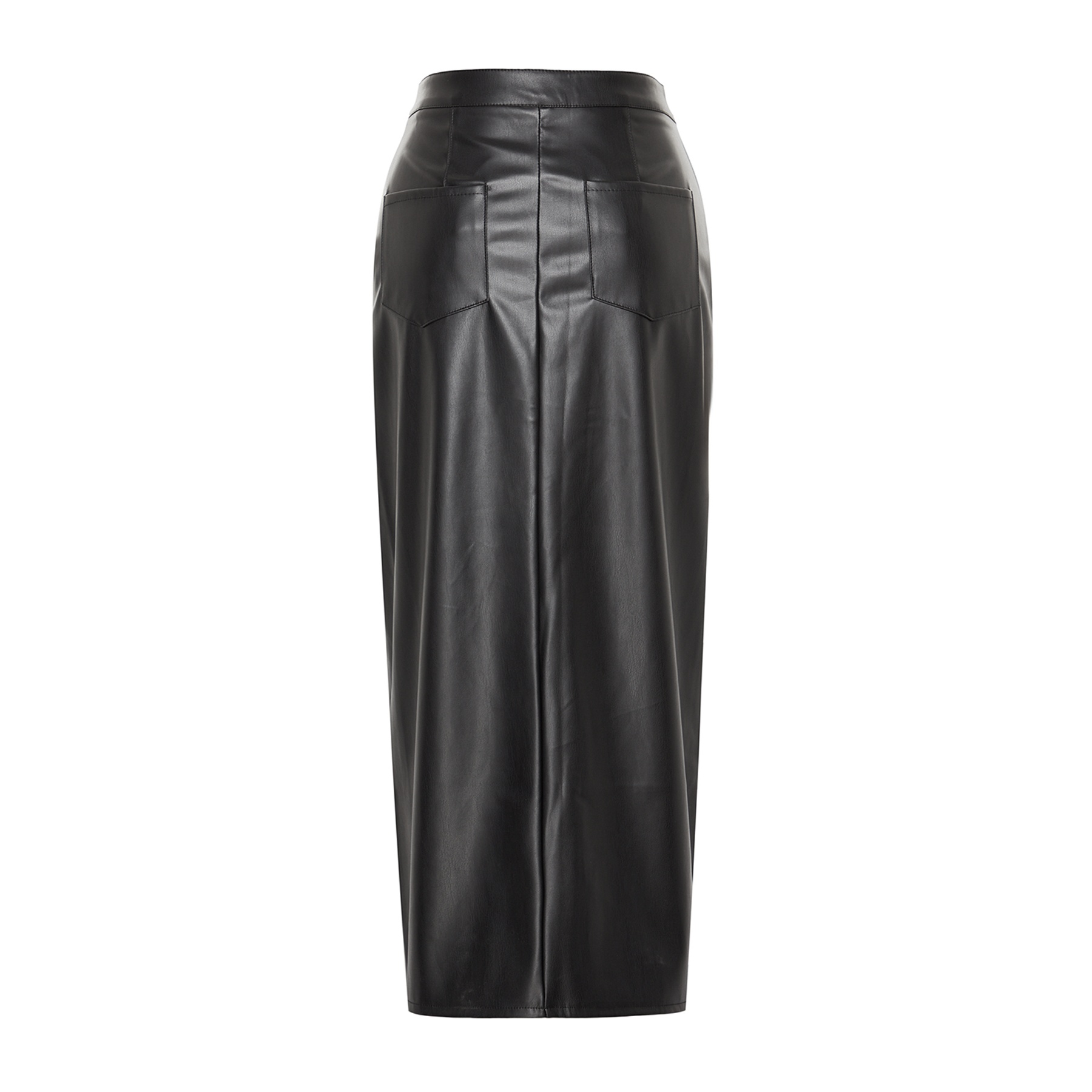 تنورة نسائية بلون أسود، مصنوعة من جلد صناعي محبوك 100% بولي يوريثان، تتميز بقصة قلم مستقيمة، خصر مرتفع، وفتحة جانبية تضيف لمسة أنثوية أنيقة، مع إغلاق خلفي بسحاب. تصميم مثالي للإطلالات اليومية والمحتشمة بلمسة عصرية.