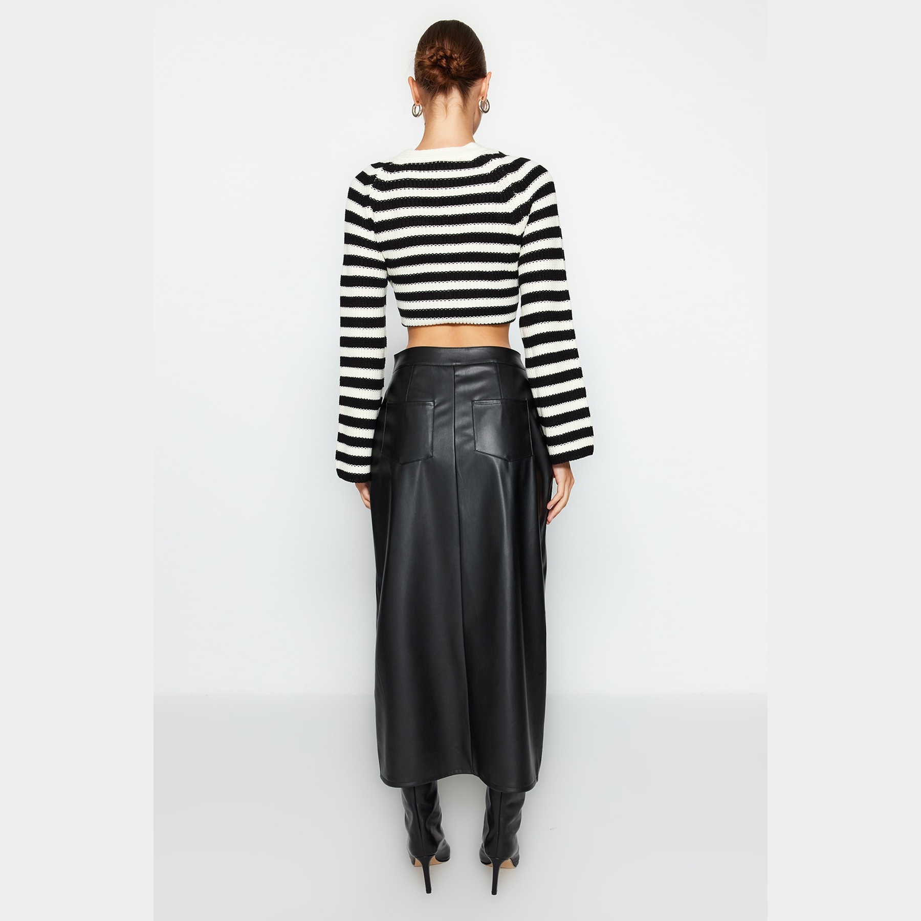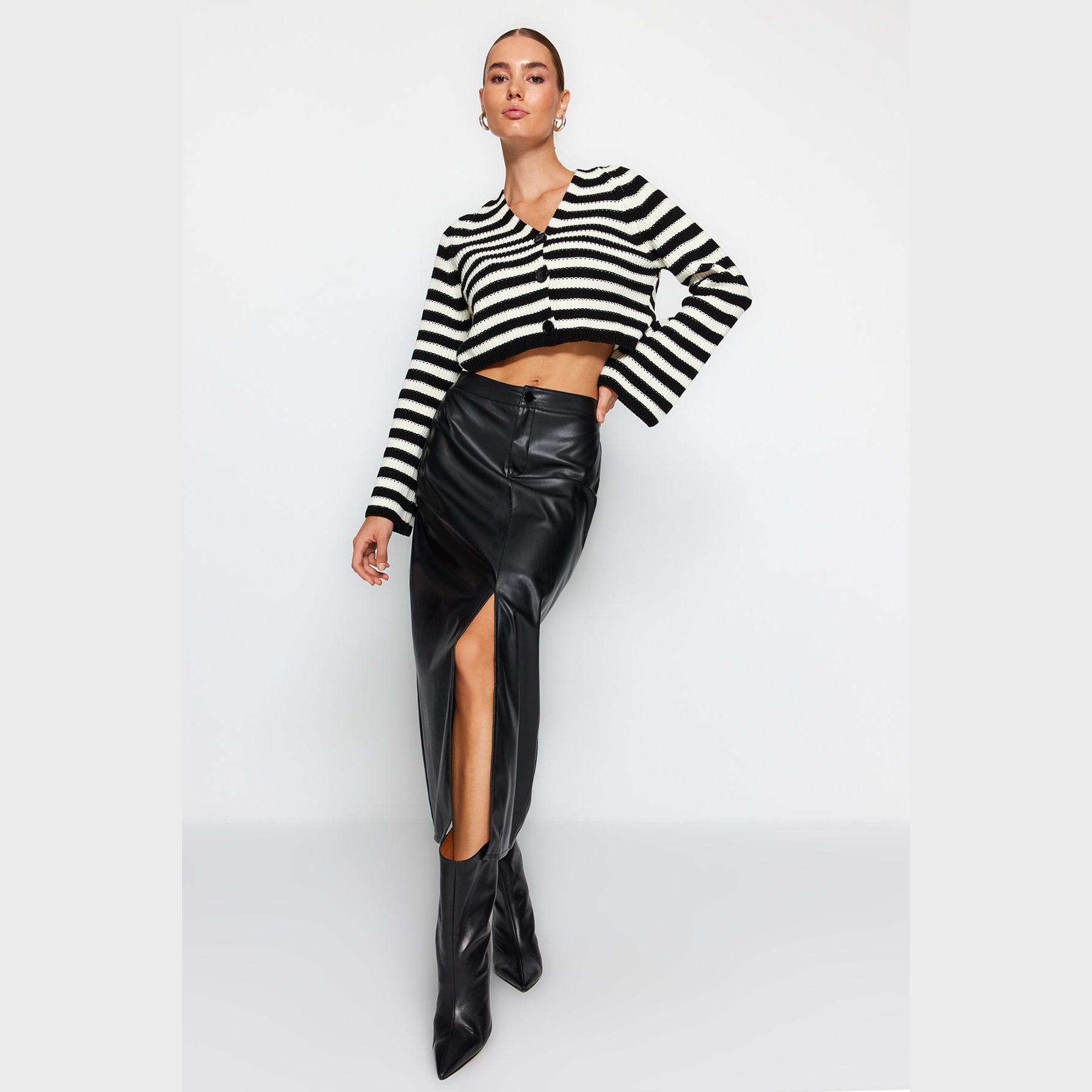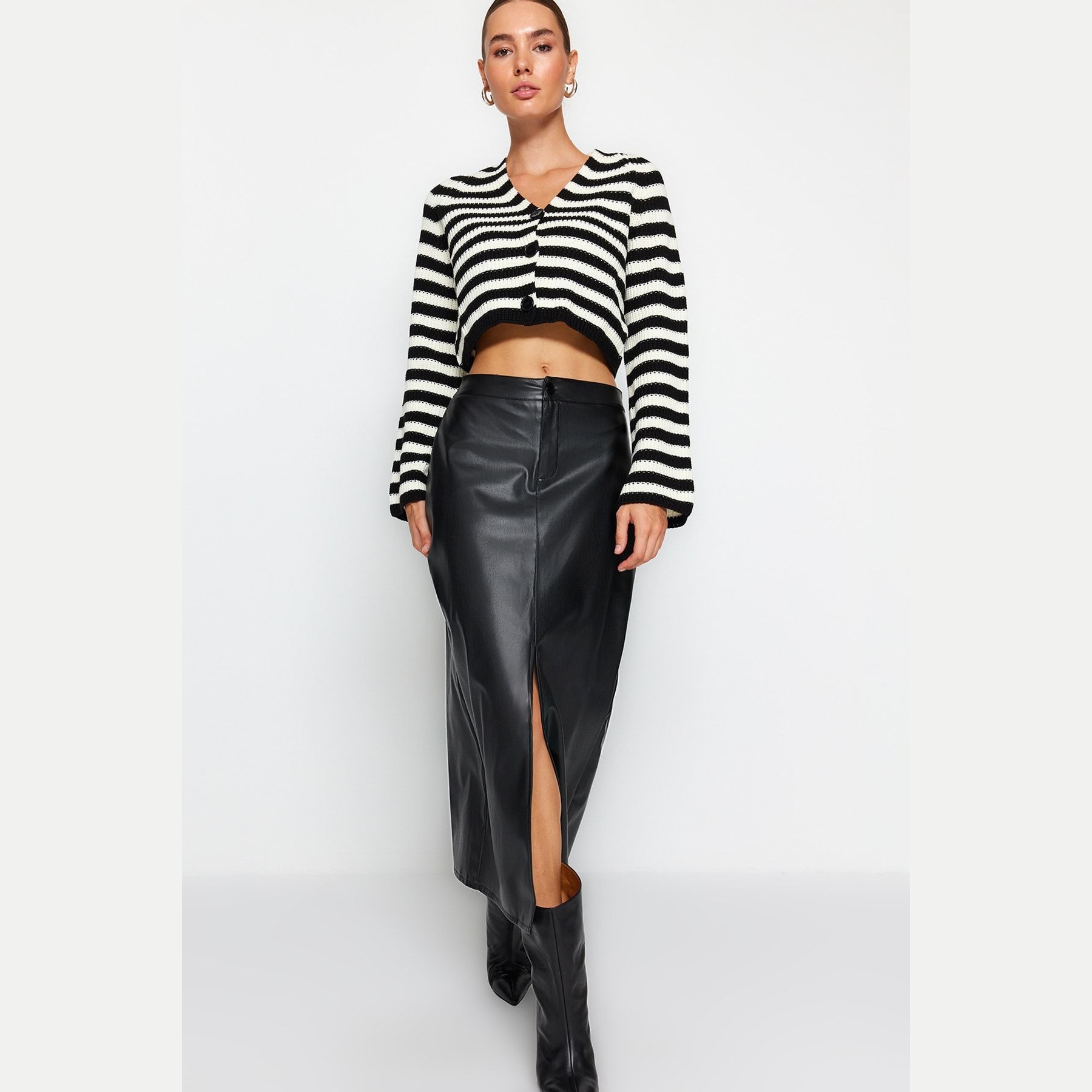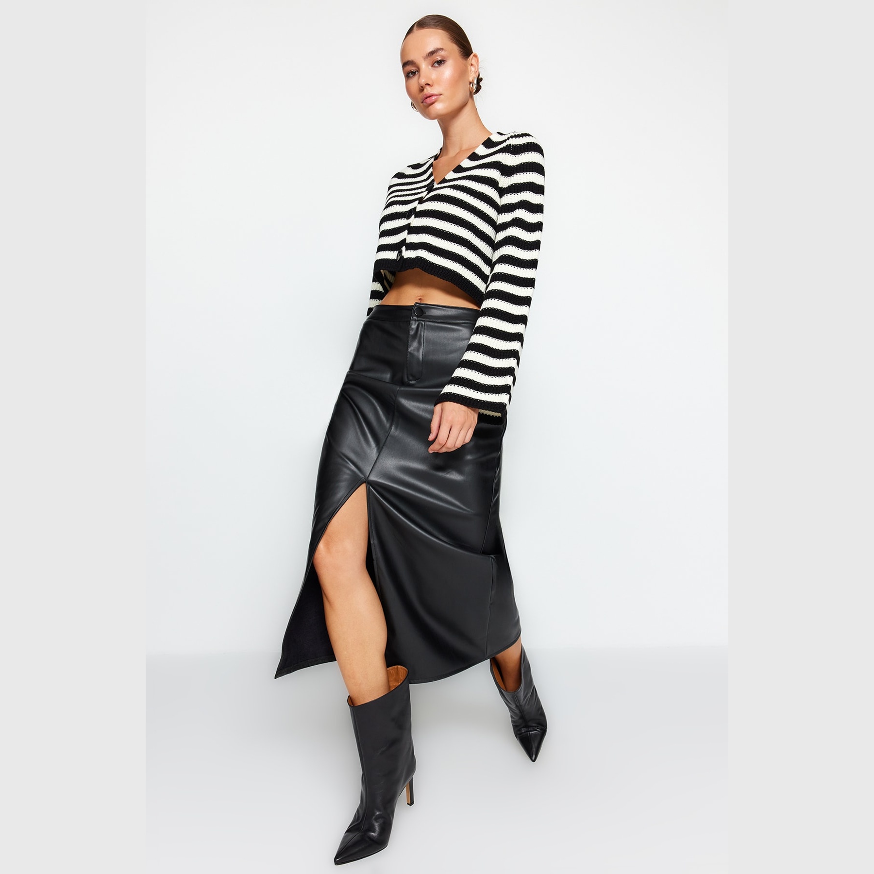 تنورة نسائية بلون أسود، مصنوعة من جلد صناعي محبوك 100% بولي يوريثان، تتميز بقصة قلم مستقيمة، خصر مرتفع، وفتحة جانبية تضيف لمسة أنثوية أنيقة، مع إغلاق خلفي بسحاب. تصميم مثالي للإطلالات اليومية والمحتشمة بلمسة عصرية.