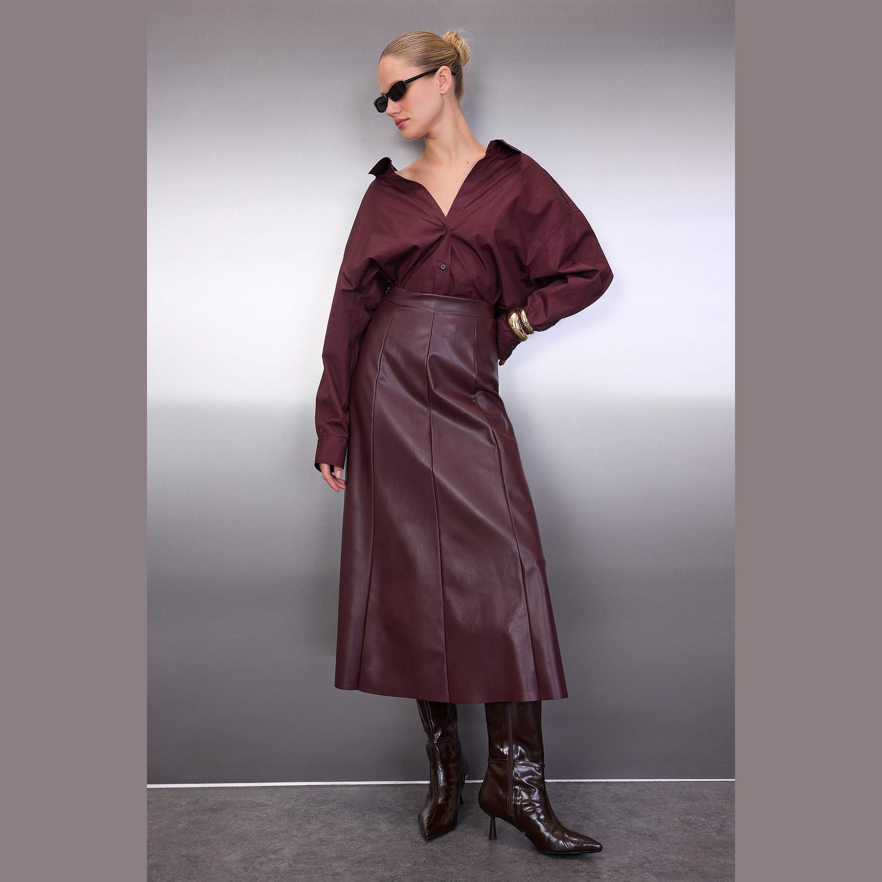 تنورة نسائية – بوردو بخصر مرتفع، قصة A-Line طويلة وخامة جلد صناعي محبوك (Maxi Çan Kesim)
