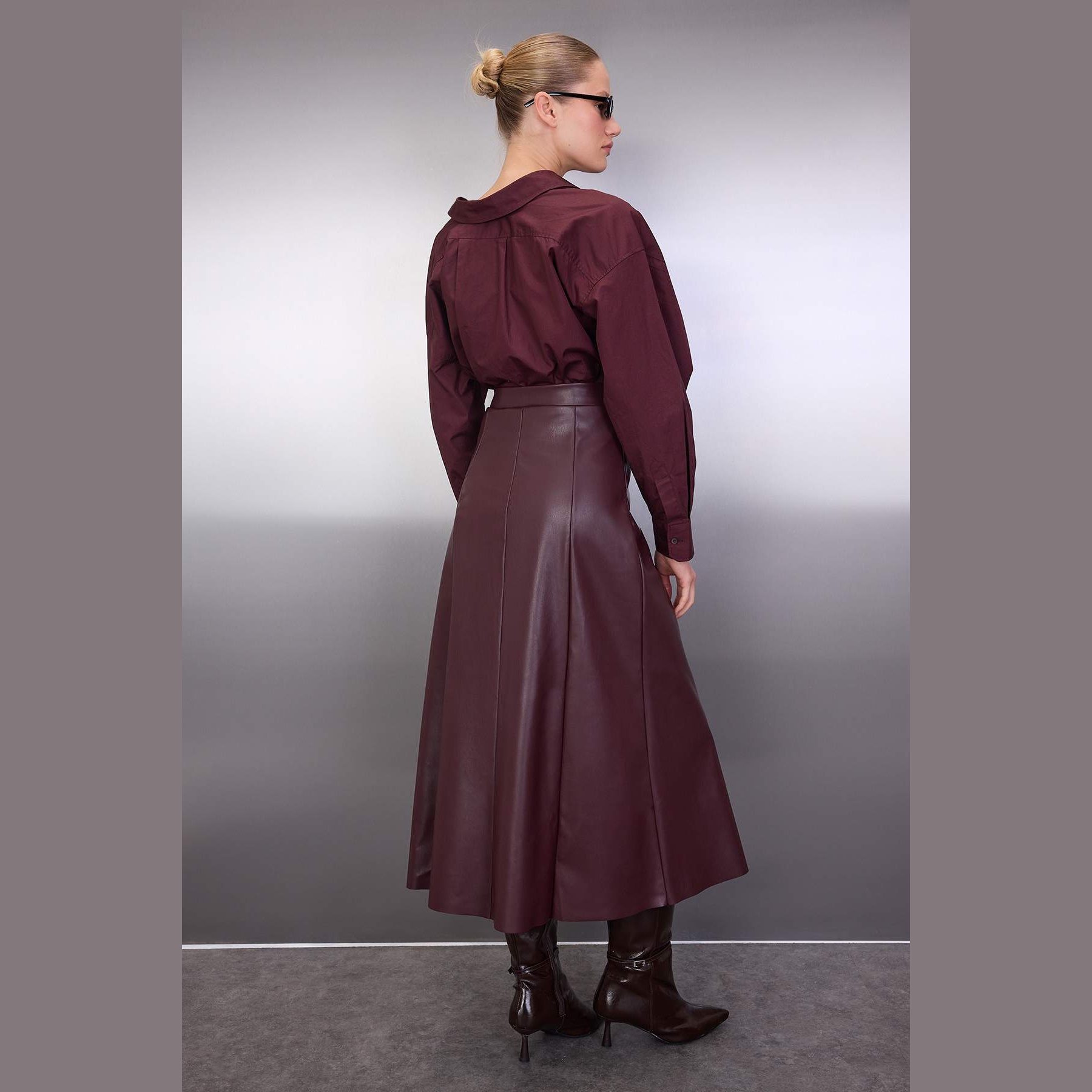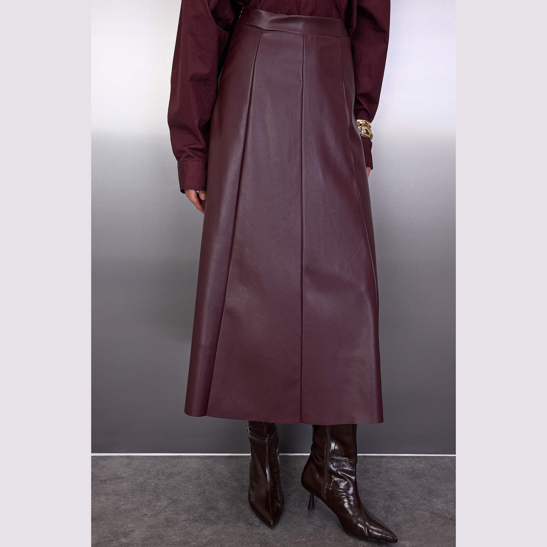 تنورة نسائية بلون بوردو أنيق، مصنوعة من جلد صناعي محبوك 100% بولي يوريثان، تتميز بقصة A-Line على شكل جرس، خصر مرتفع، ولمسة ناعمة وانسيابية تضفي أناقة على الإطلالة. تصميم مثالي للإطلالات اليومية والمحتشمة بلمسة عصرية.