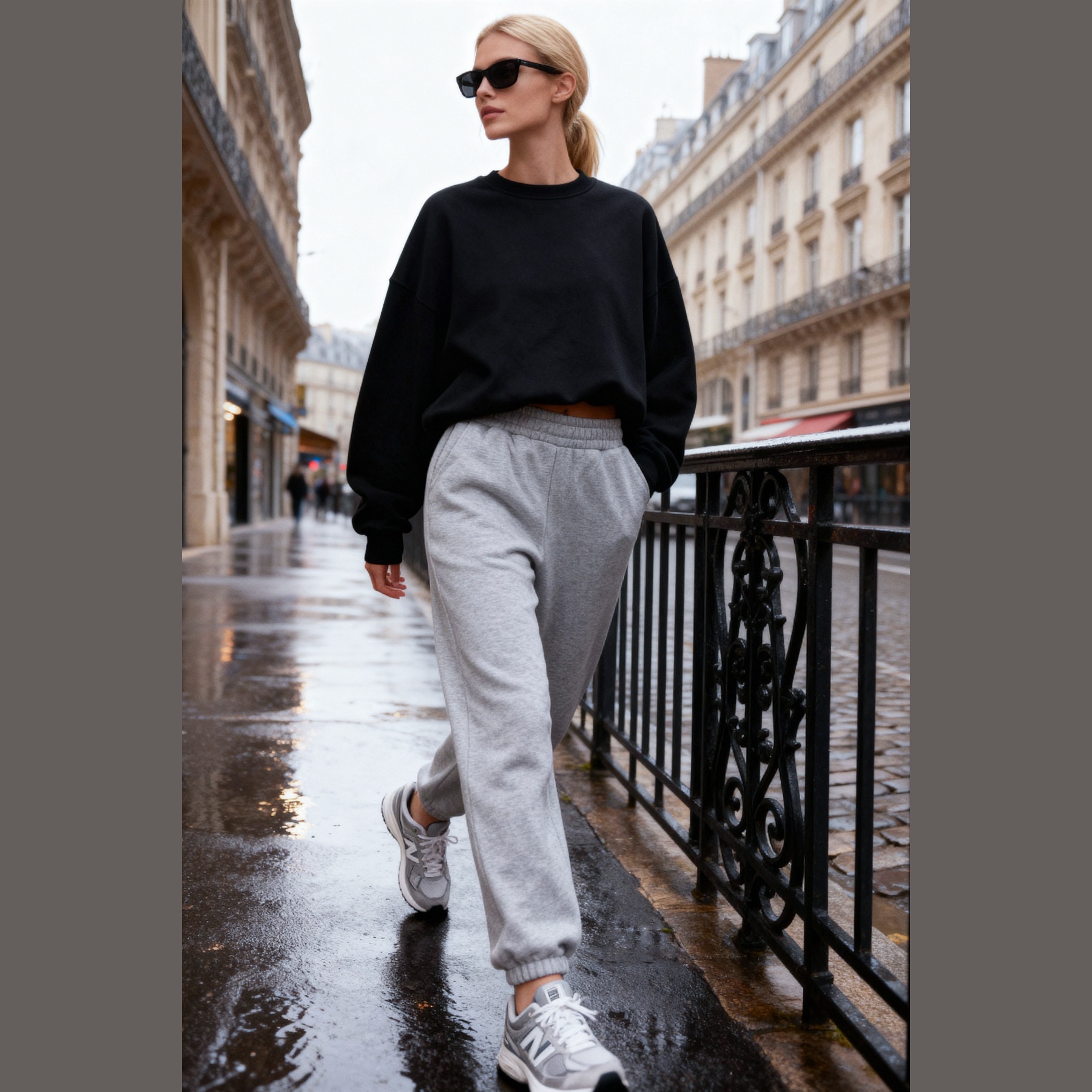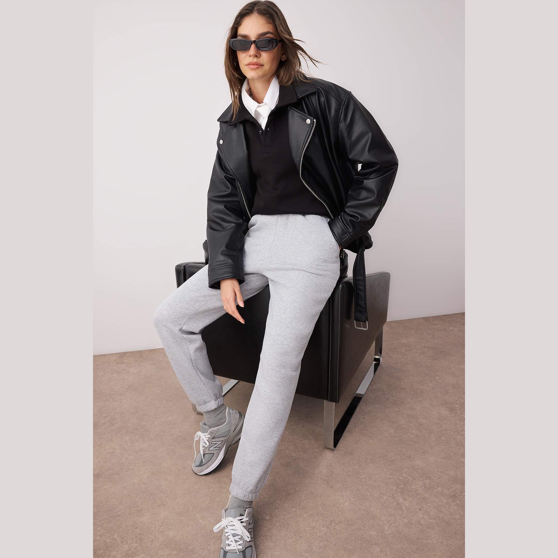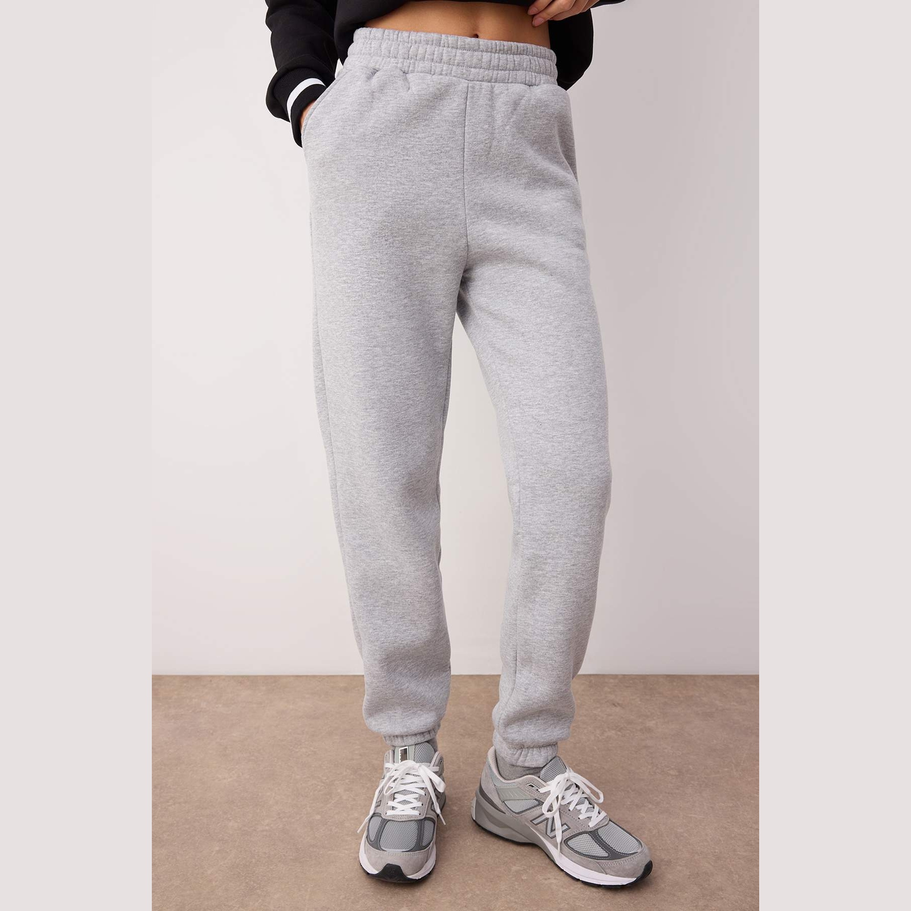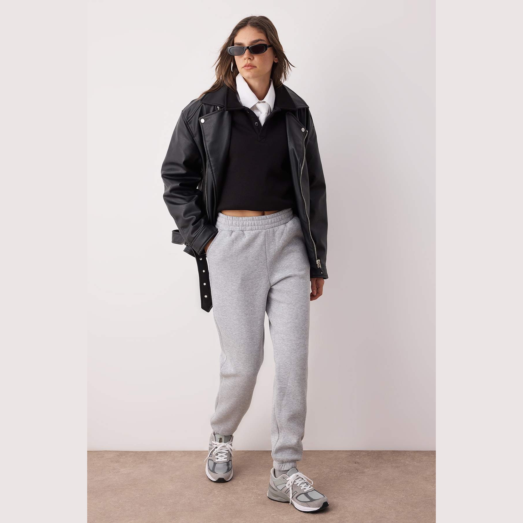بنطال رياضي نسائي بلون رمادي، مصنوع من قماش محبوك سميك ببطانة داخلية من الفرو (بولار)، يتميز بقصة Loose Jogger مريحة، خصر عادي، أرجل ضيقة بحواف مطاطية، وتصميم مثالي للإطلالات الشتوية اليومية بلمسة دافئة وعصرية.