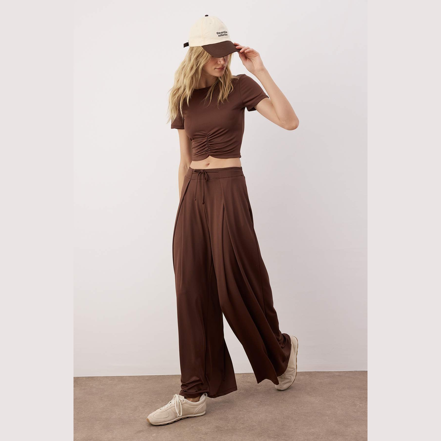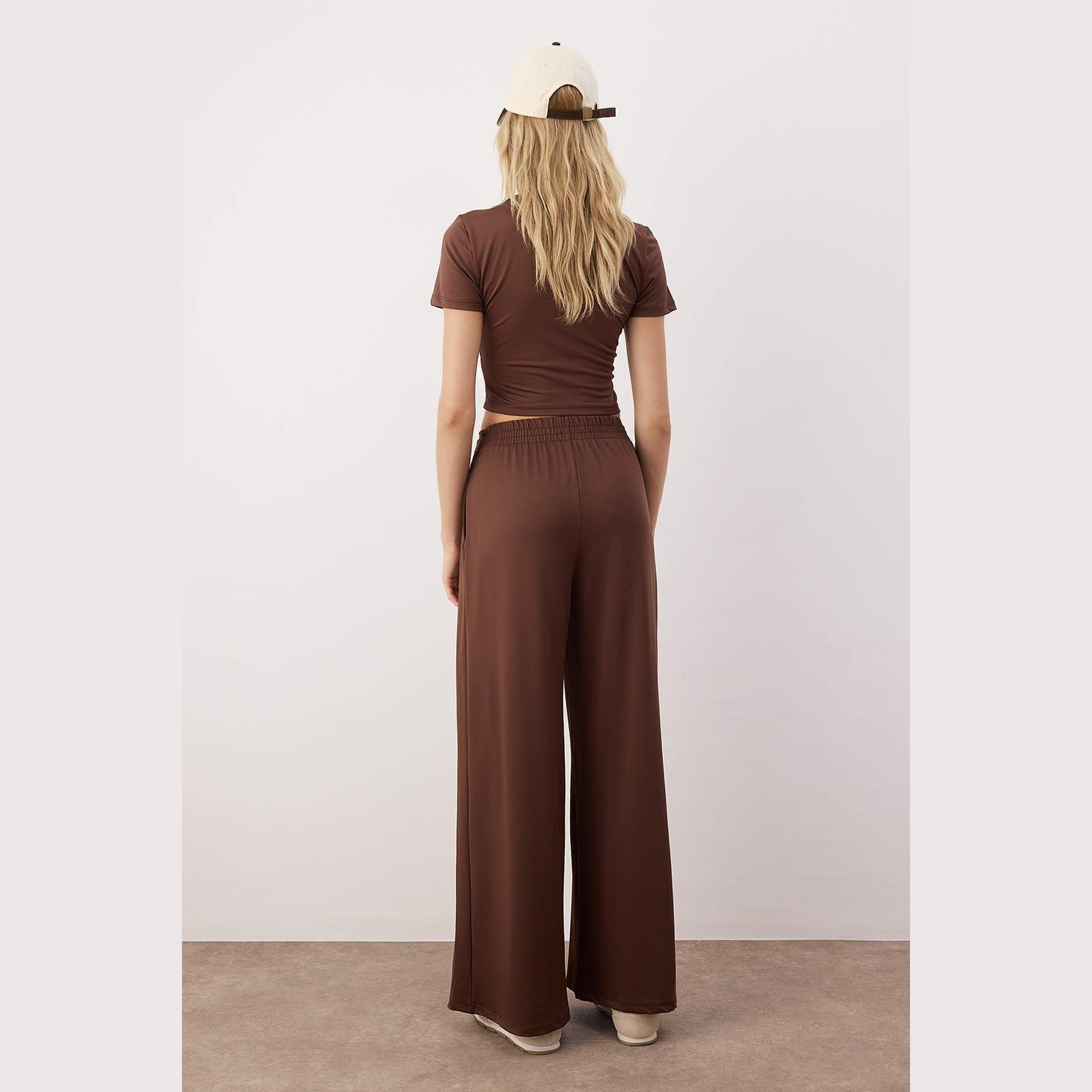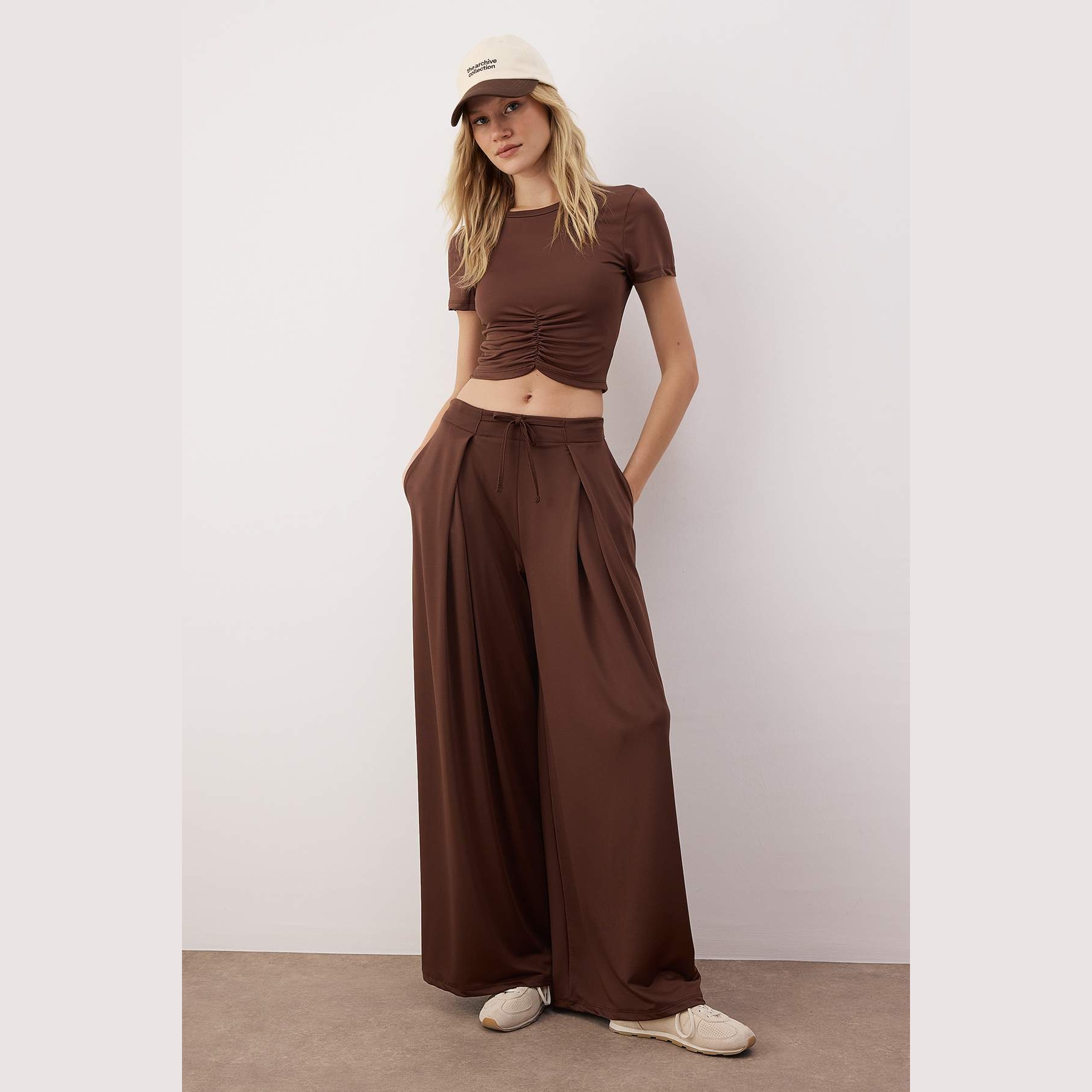 بنطال رياضي نسائي – بني بطيات أمامية، قصة مستقيمة وخامة سكوبا محبوكة (Scuba Pileli Sportswear)