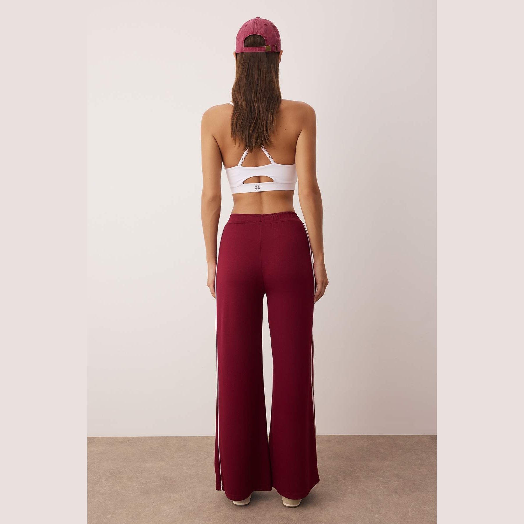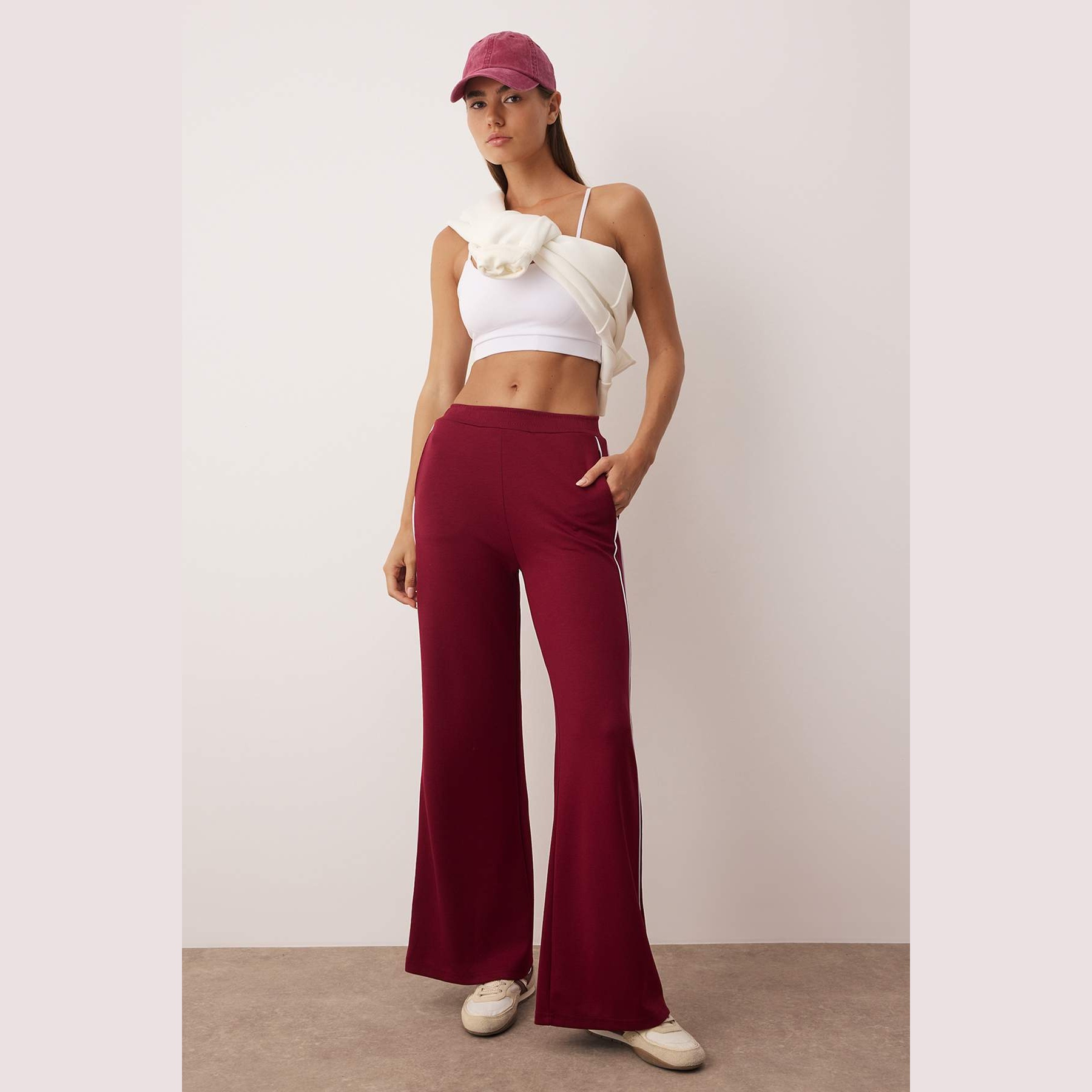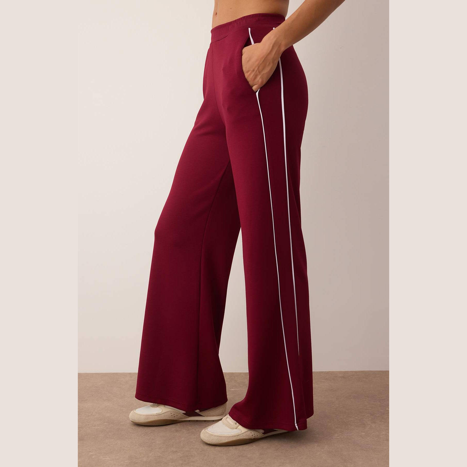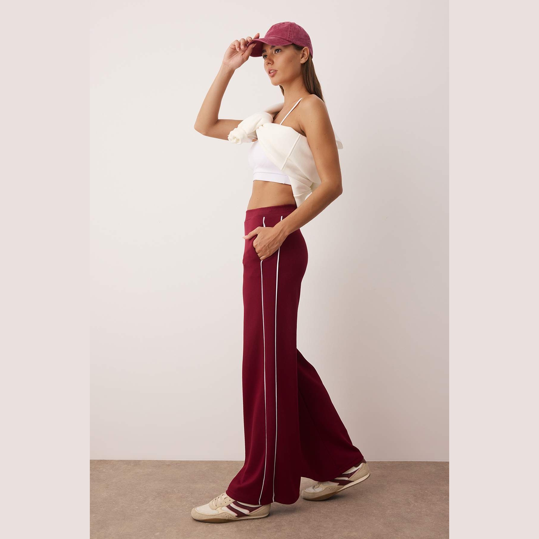 بنطال رياضي نسائي – بوردو بخط جانبي، قصة واسعة وخامة محبوكة مرنة (Wide-Leg Contrast Stripe)