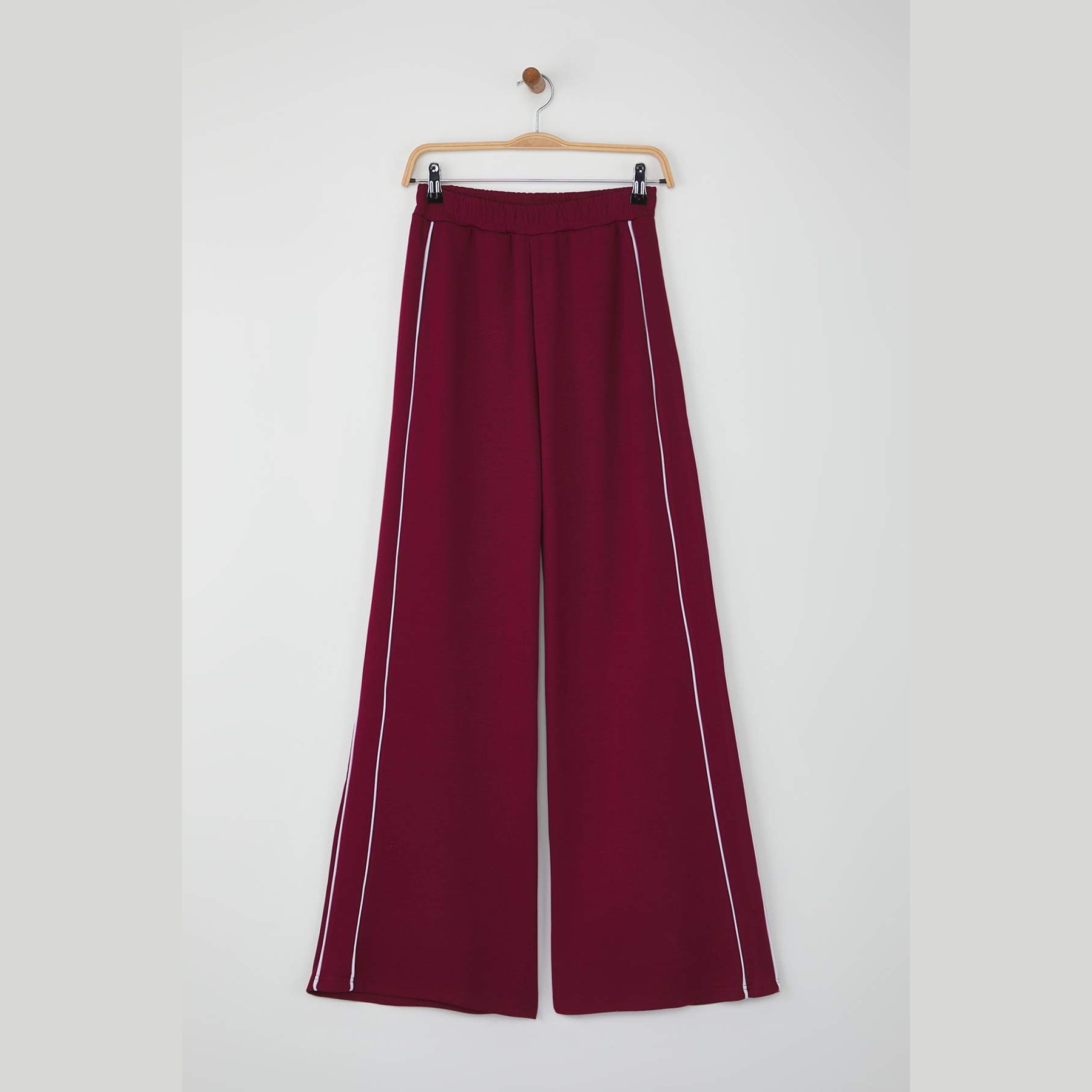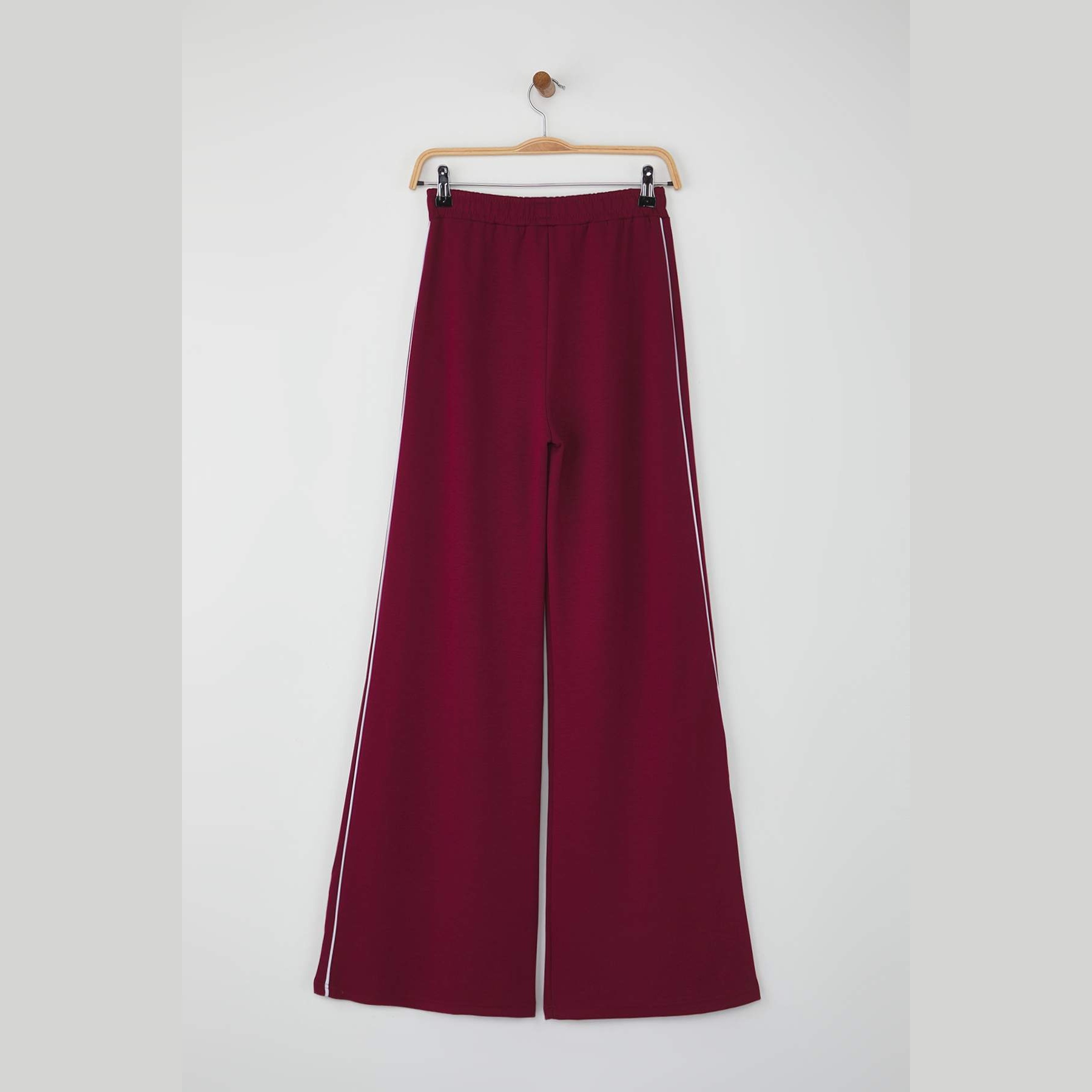 بنطال رياضي نسائي بلون بوردو أنيق مع خط جانبي بلون متباين، مصنوع من قماش محبوك مرن بنسبة 49% بوليستر، 47% فيسكوز، و4% إيلاستان، يتميز بقصة واسعة من الأرجل (Wide-Leg)، خصر عادي، وتصميم عملي يوفر راحة وأناقة في الإطلالات اليومية أو الكاجوال.