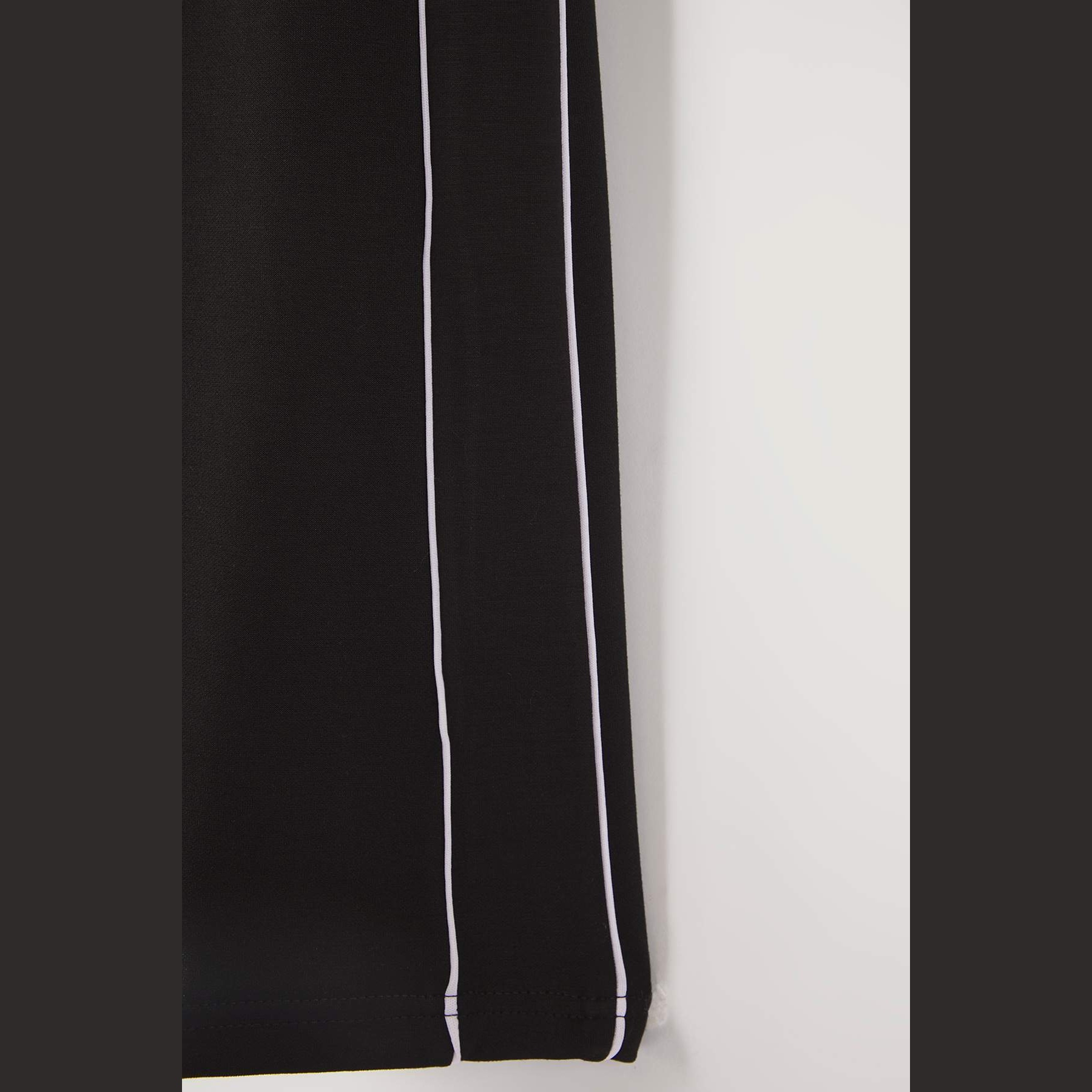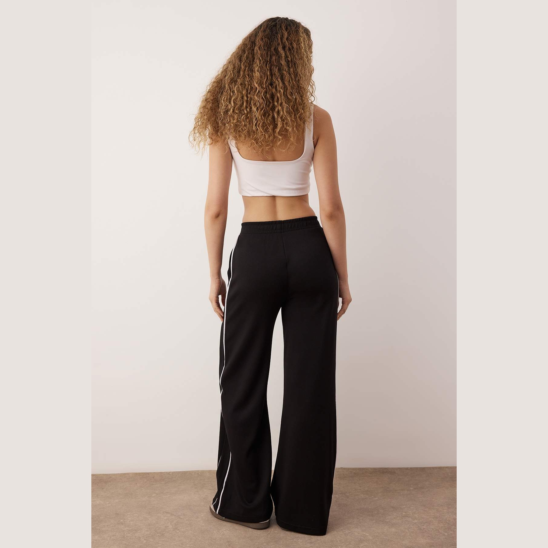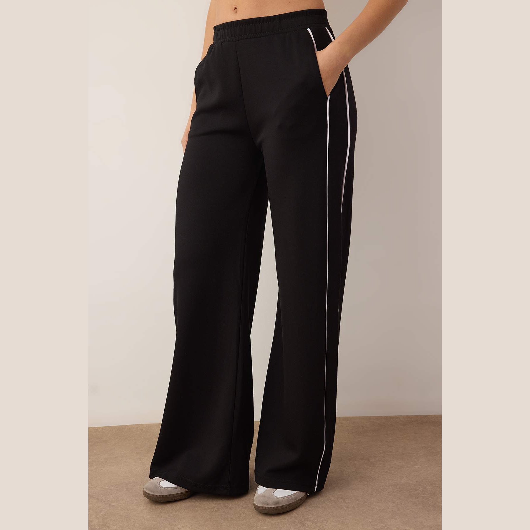 بنطال رياضي نسائي – أسود بخط جانبي، قصة واسعة وخامة محبوكة مرنة (Wide-Leg Contrast Stripe)