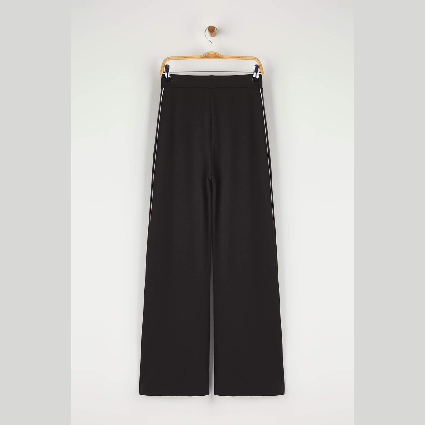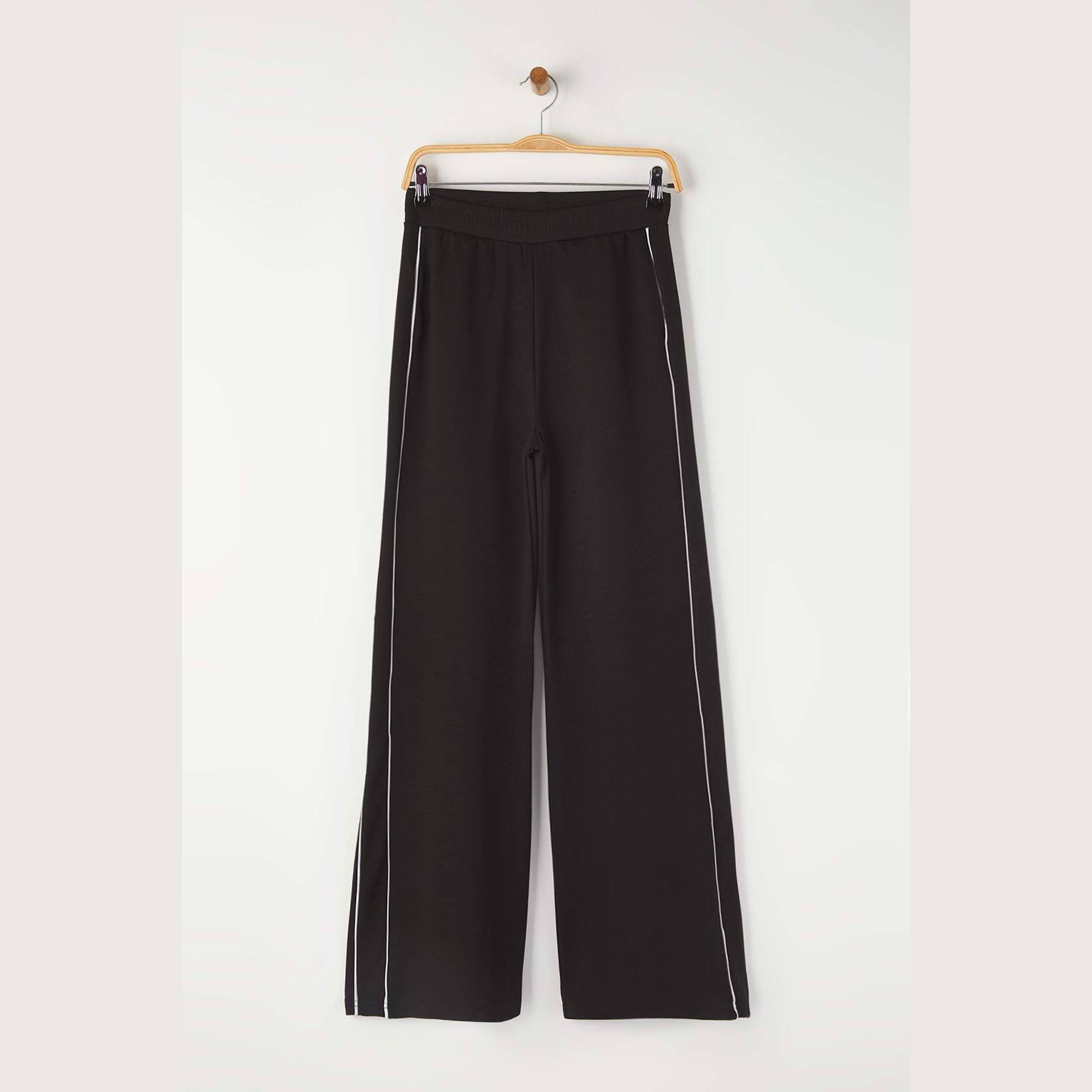 بنطال رياضي نسائي بلون أسود أنيق مع خط جانبي بلون متباين، مصنوع من قماش محبوك مرن بنسبة 49% بوليستر، 47% فيسكوز، و4% إيلاستان، يتميز بقصة واسعة من الأرجل (Wide-Leg)، خصر عادي، وتصميم عملي يوفر راحة وأناقة في الإطلالات اليومية أو الكاجوال.