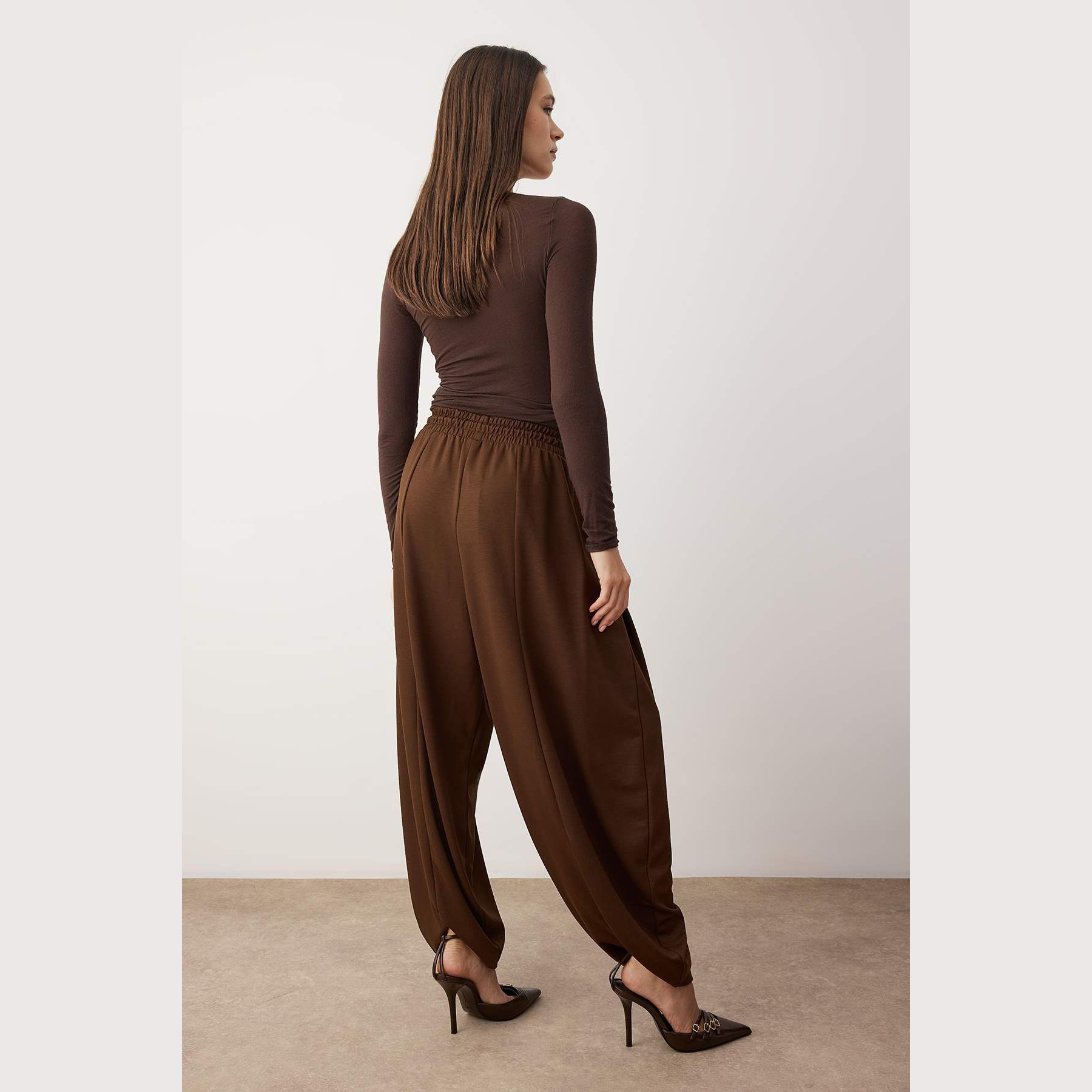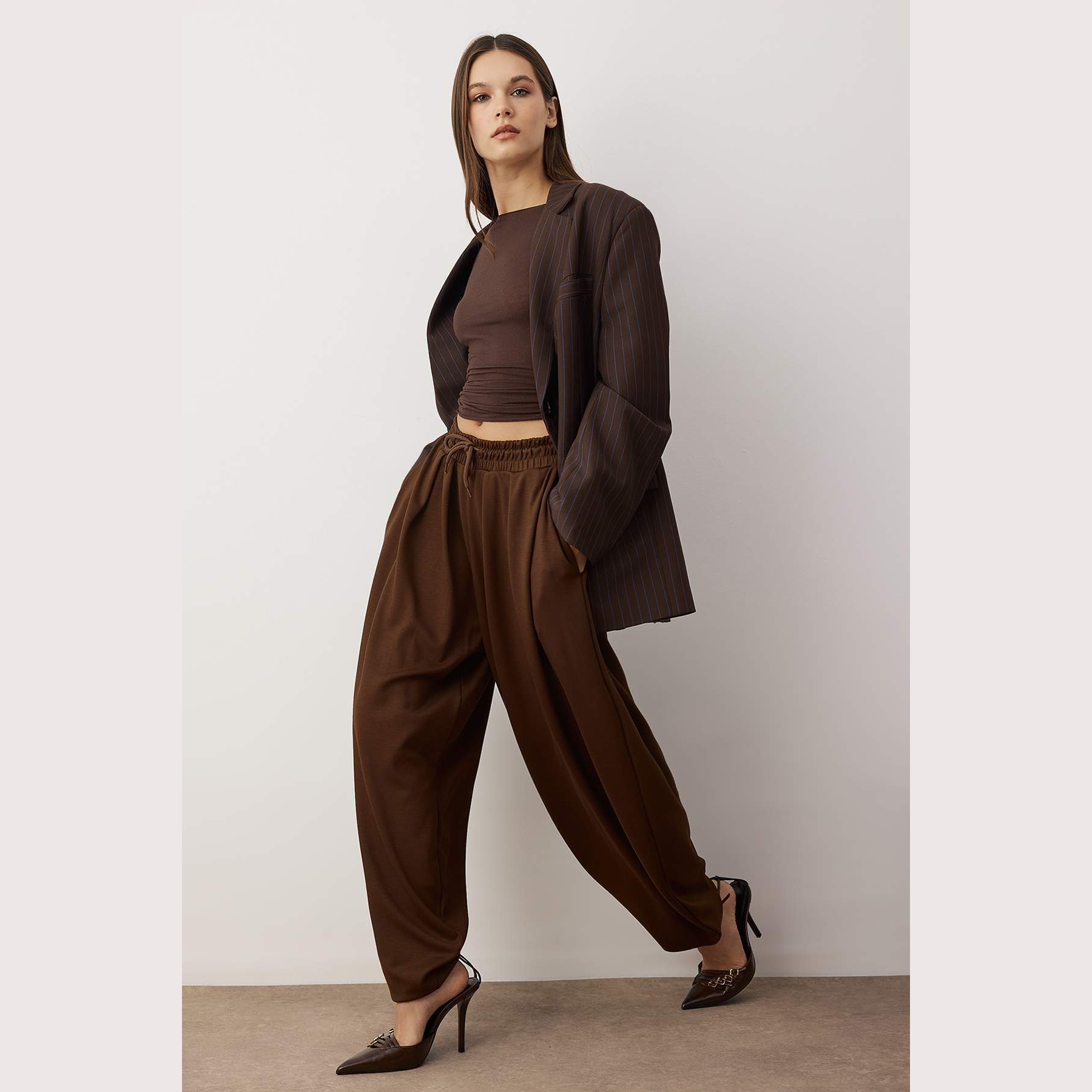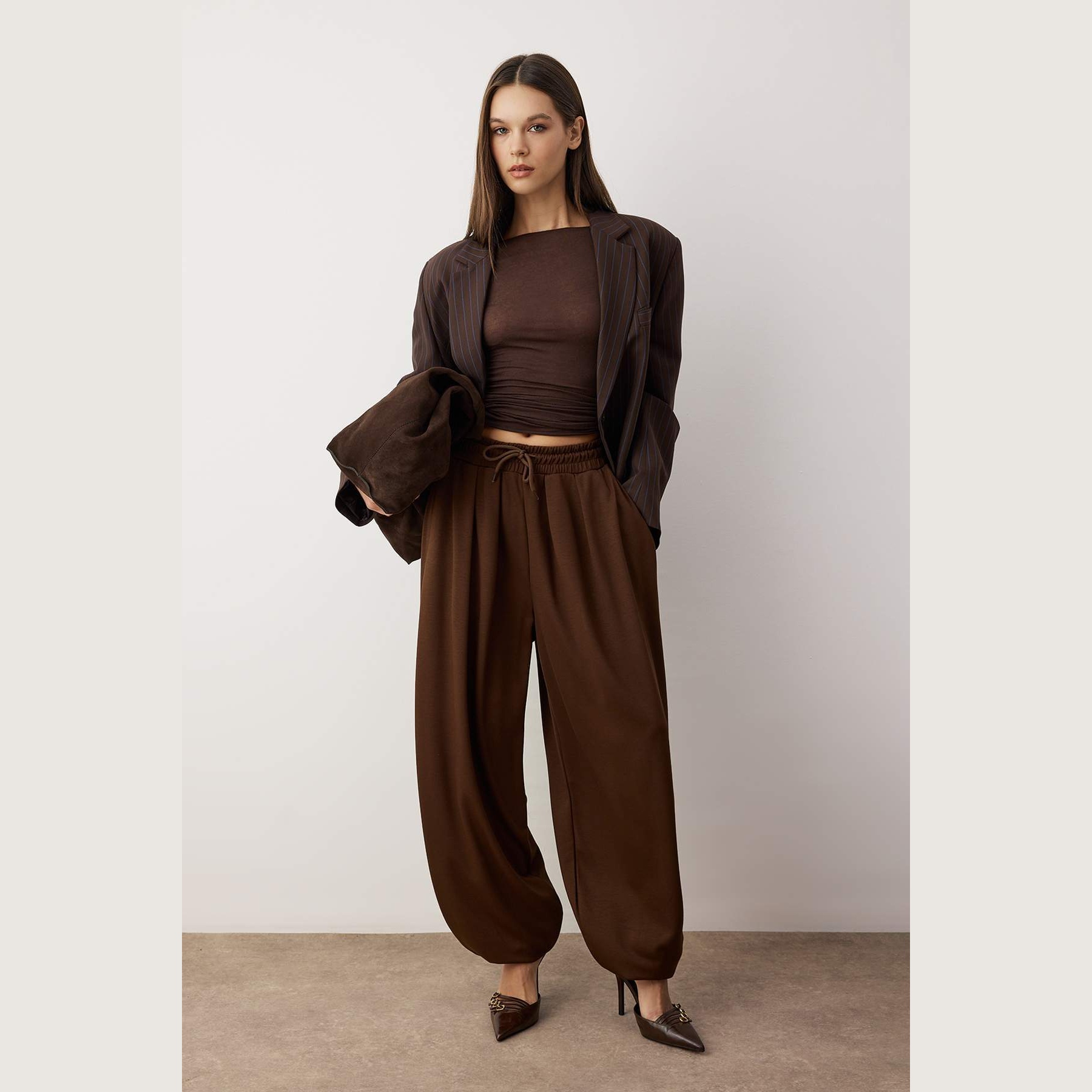 بنطال رياضي نسائي بلون بني دافئ، مصنوع من قماش محبوك ناعم ومرن بنسبة 55% فيسكوز، 42% بوليستر، و3% إيلاستان، يتميز بقصة هافوش مريحة، خصر عادي، وأرجل ضيقة من الأسفل بحواف مطاطية. تصميم عملي وأنيق يناسب الإطلالات اليومية أو المنزلية.