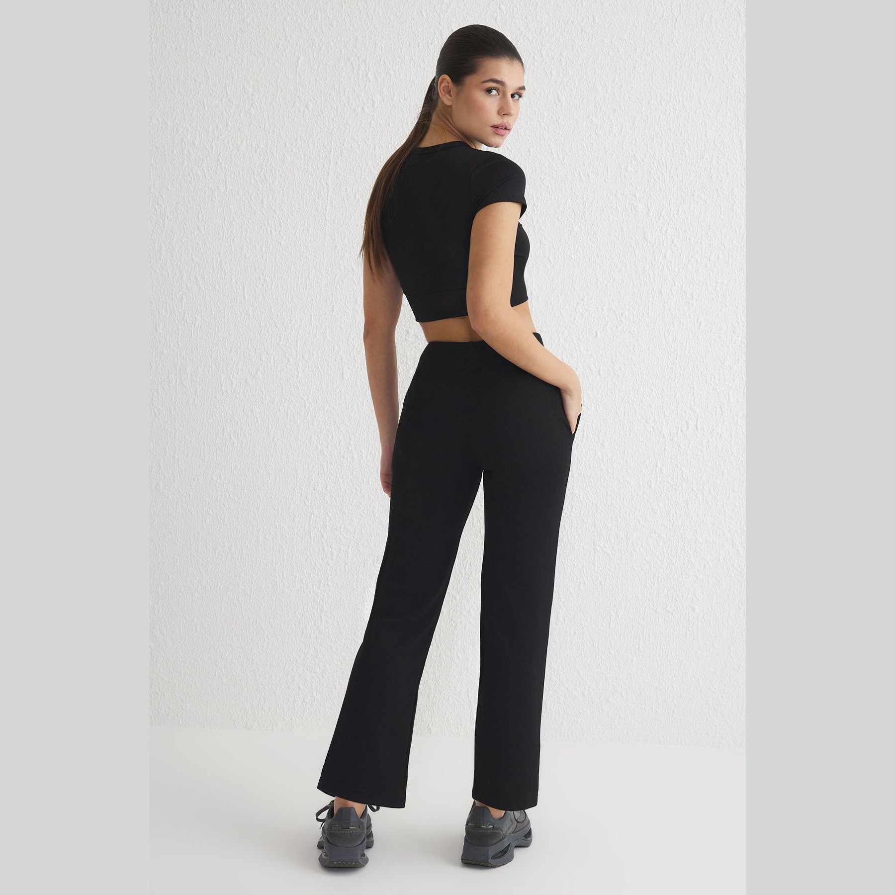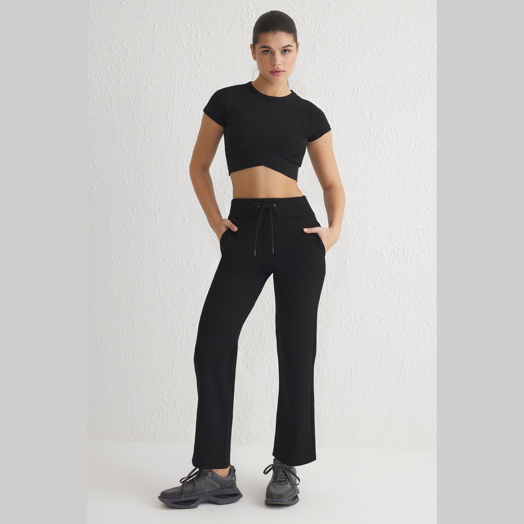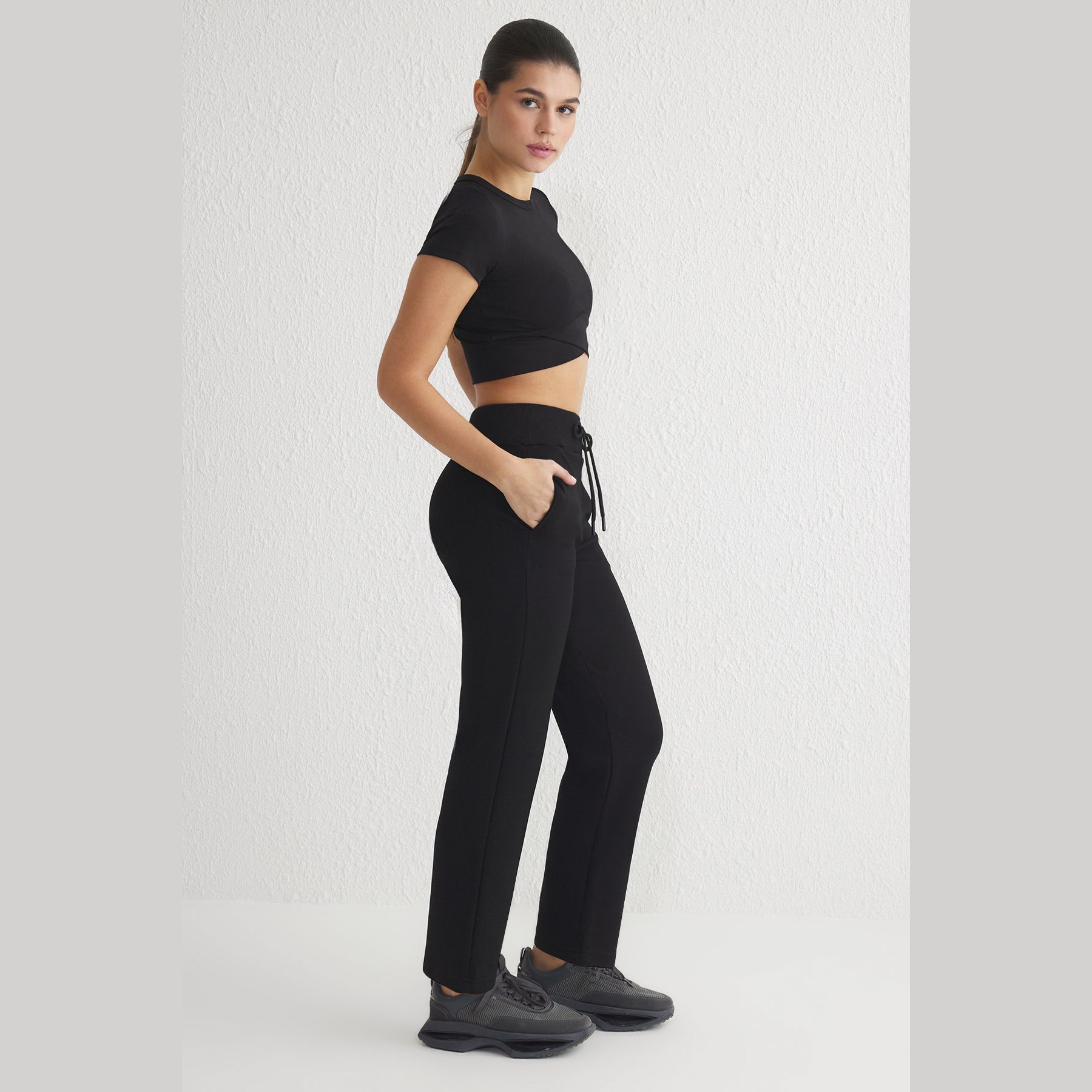 بنطال رياضي نسائي بلون أسود أنيق، مصنوع من قماش محبوك مرن بنسبة 49% بوليستر، 47% فيسكوز، و4% إيلاستان، يتميز بقصة مستقيمة مريحة، خصر عادي برباط خارجي، وجيوب جانبية عملية. تصميم عملي يوفر راحة وأناقة في الإطلالات اليومية أو الرياضية.