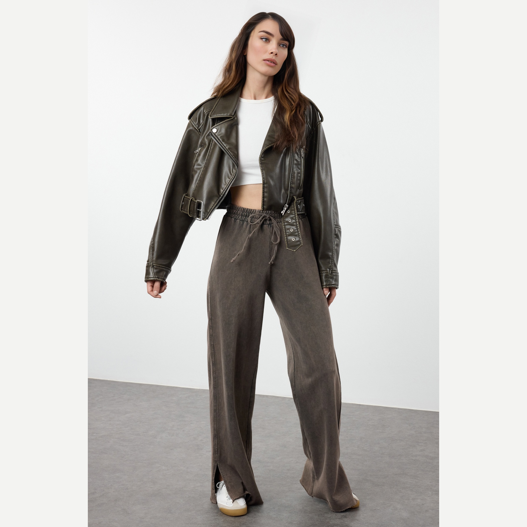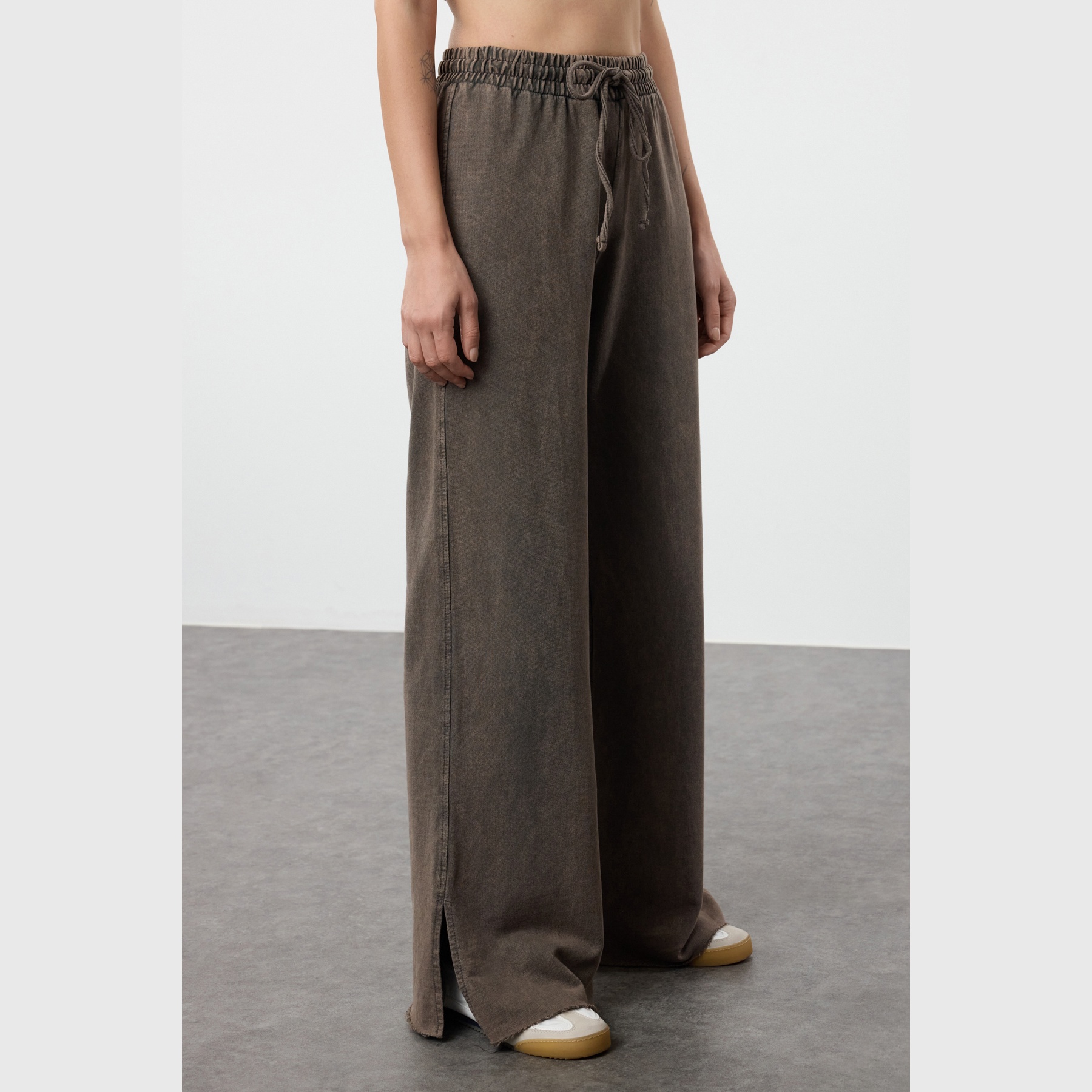 بنطال رياضي نسائي بلون بني داكن بتأثير باهت، مصنوع من قماش محبوك خفيف بنسبة 61% قطن، 29% بوليستر، و10% فيسكوز، يتميز بقصة واسعة من الأرجل (Wide-Leg)، خصر عادي، وتصميم مريح مثالي للإطلالات اليومية أو الكاجوال.