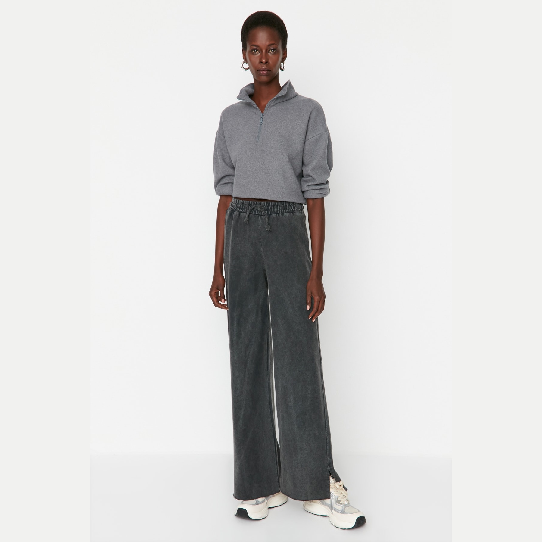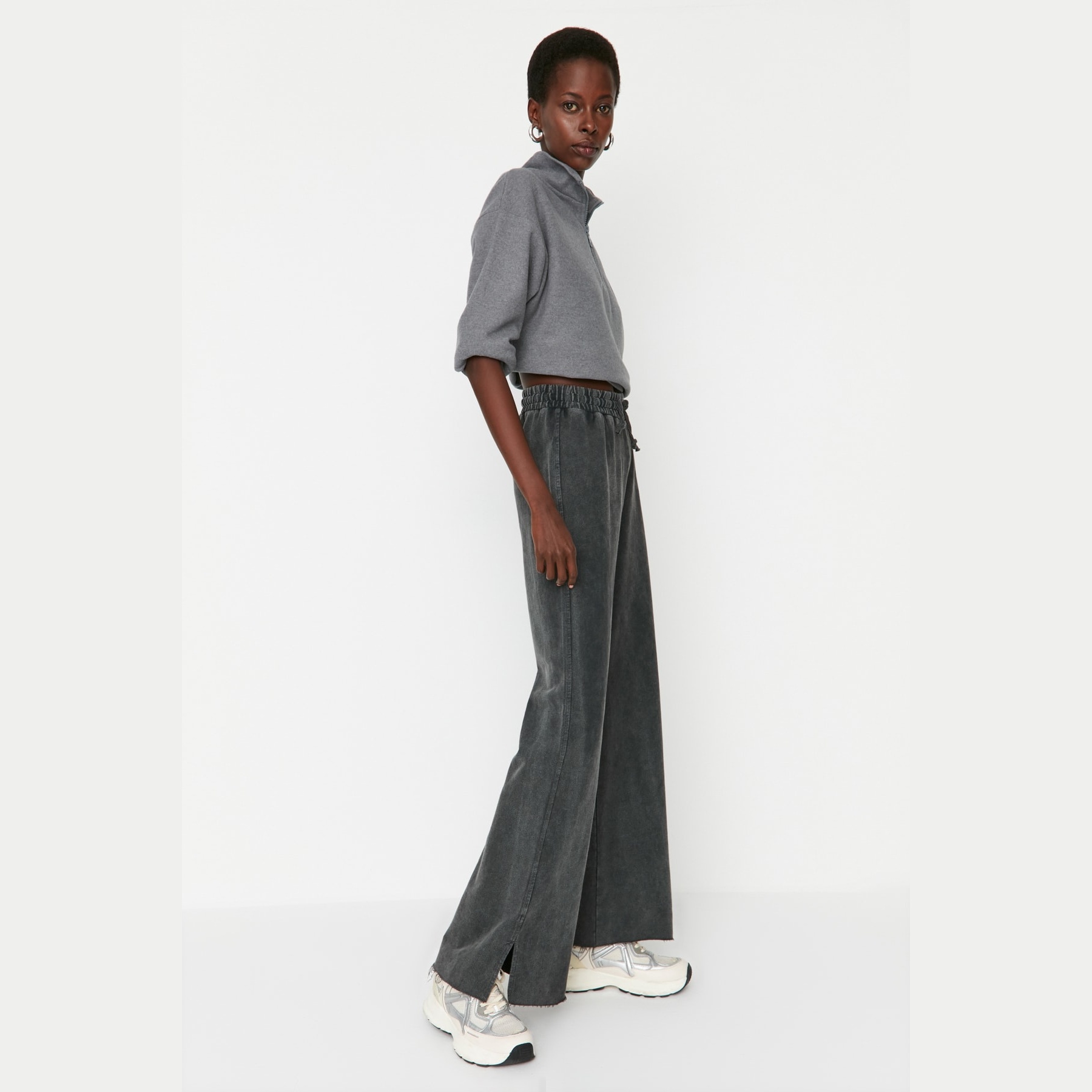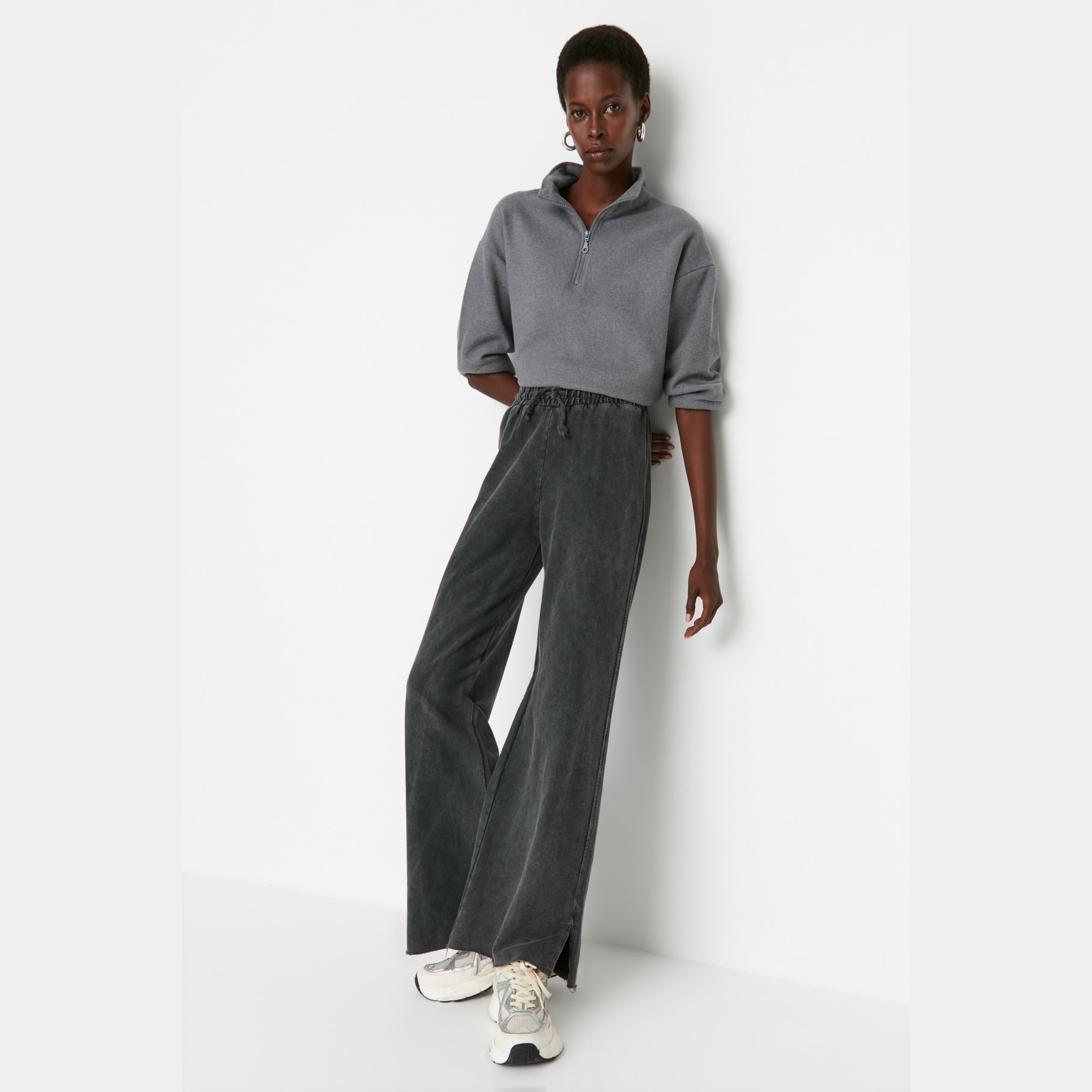 بنطال رياضي نسائي بلون أنثراسيت بتأثير باهت، مصنوع من قماش محبوك خفيف بنسبة 61% قطن، 29% بوليستر، و10% فيسكوز، يتميز بقصة واسعة من الأرجل (Wide-Leg)، خصر عادي، وتصميم مريح مثالي للإطلالات اليومية أو الكاجوال.