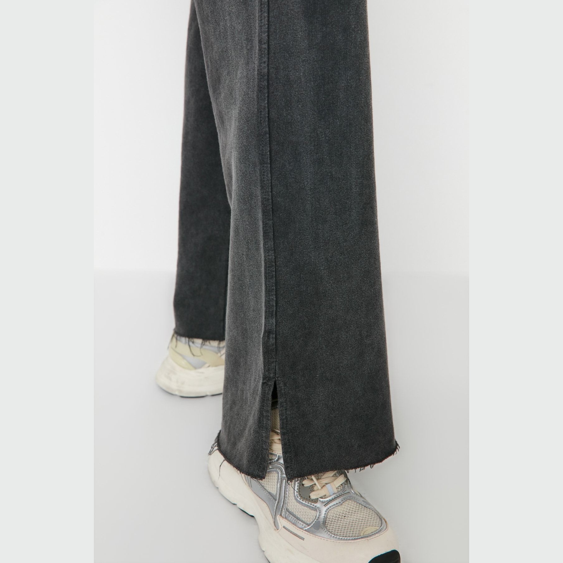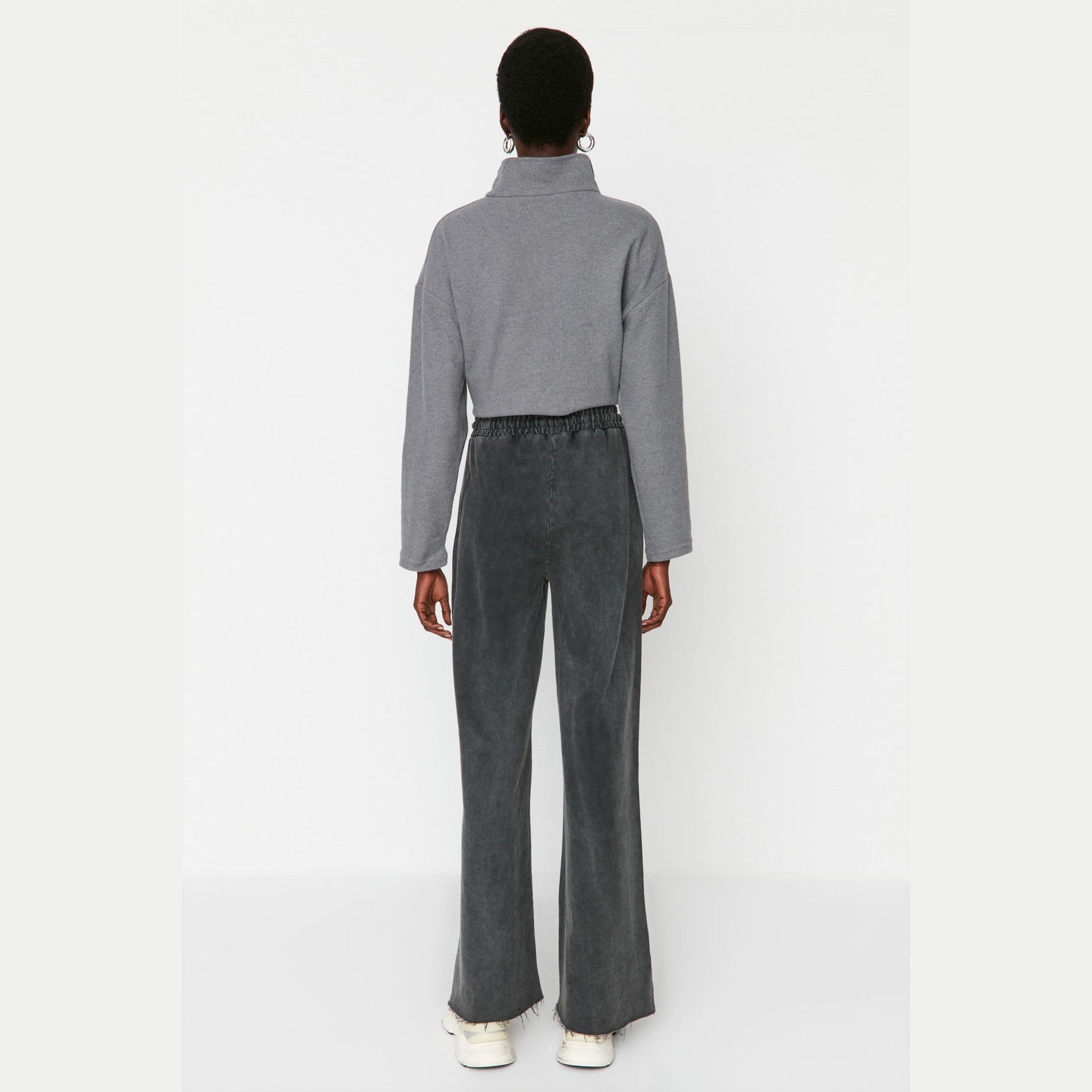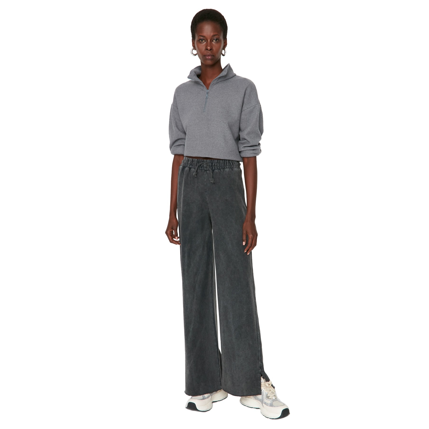 بنطال رياضي نسائي بلون أنثراسيت بتأثير باهت، مصنوع من قماش محبوك خفيف بنسبة 61% قطن، 29% بوليستر، و10% فيسكوز، يتميز بقصة واسعة من الأرجل (Wide-Leg)، خصر عادي، وتصميم مريح مثالي للإطلالات اليومية أو الكاجوال.